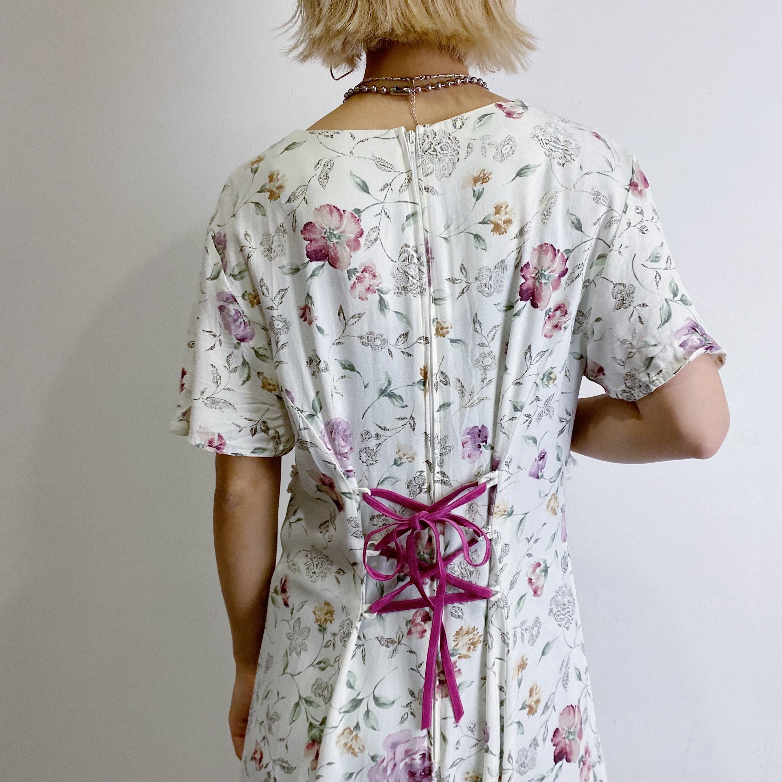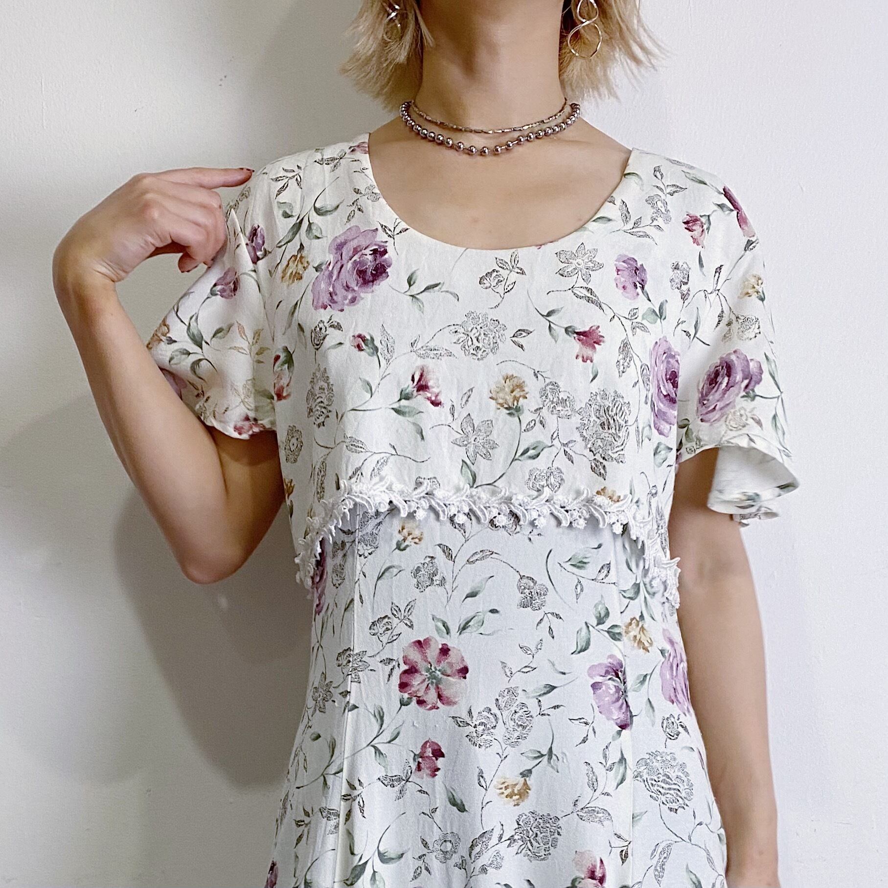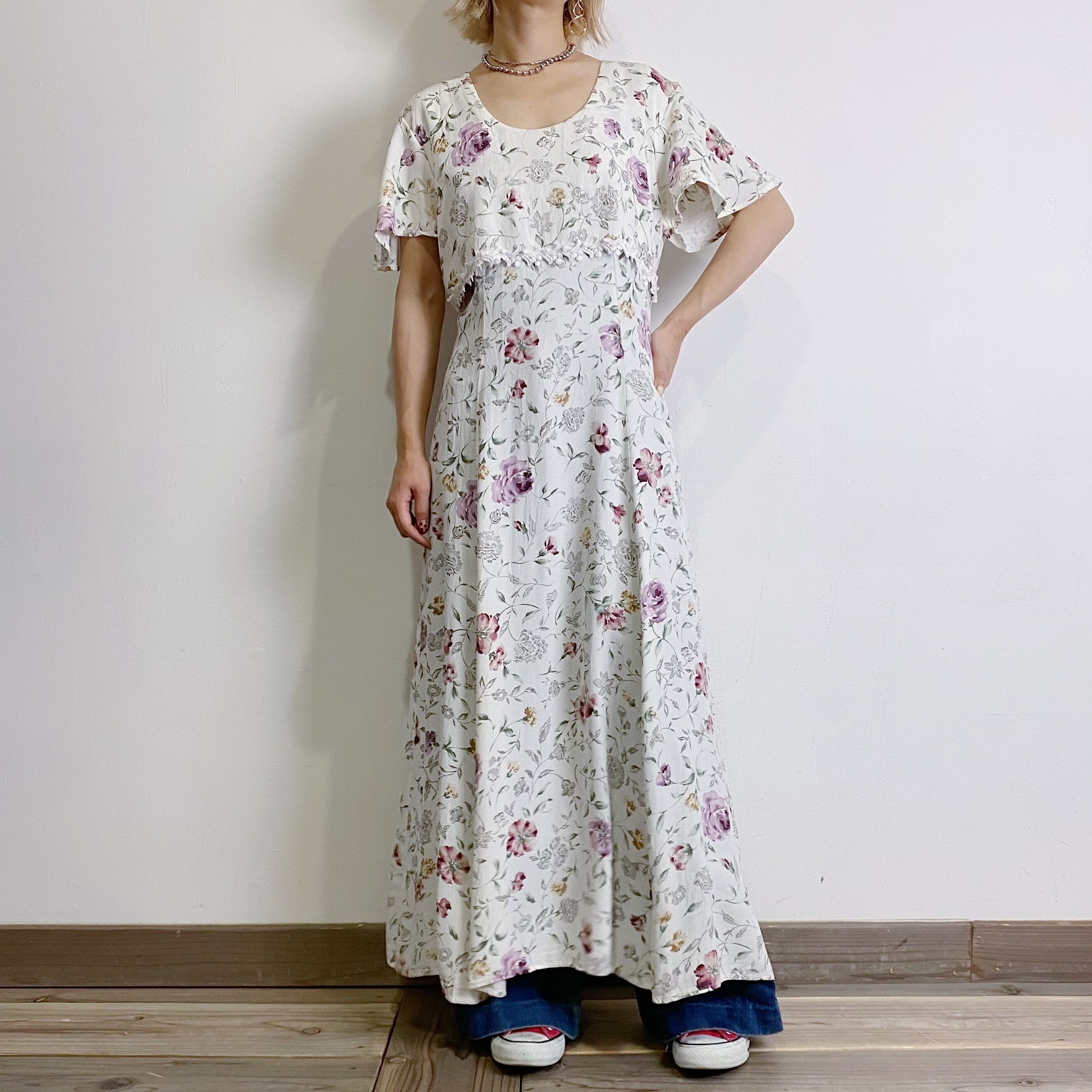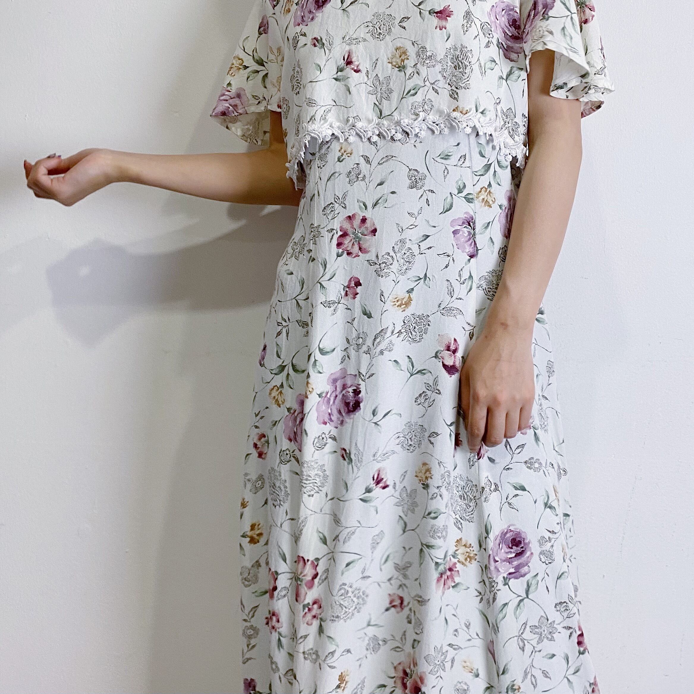 白地に華やかなお花柄、フロントのレースにひらひらとしたお袖と可愛いポイントたっぷりなレーヨンワンピースです。