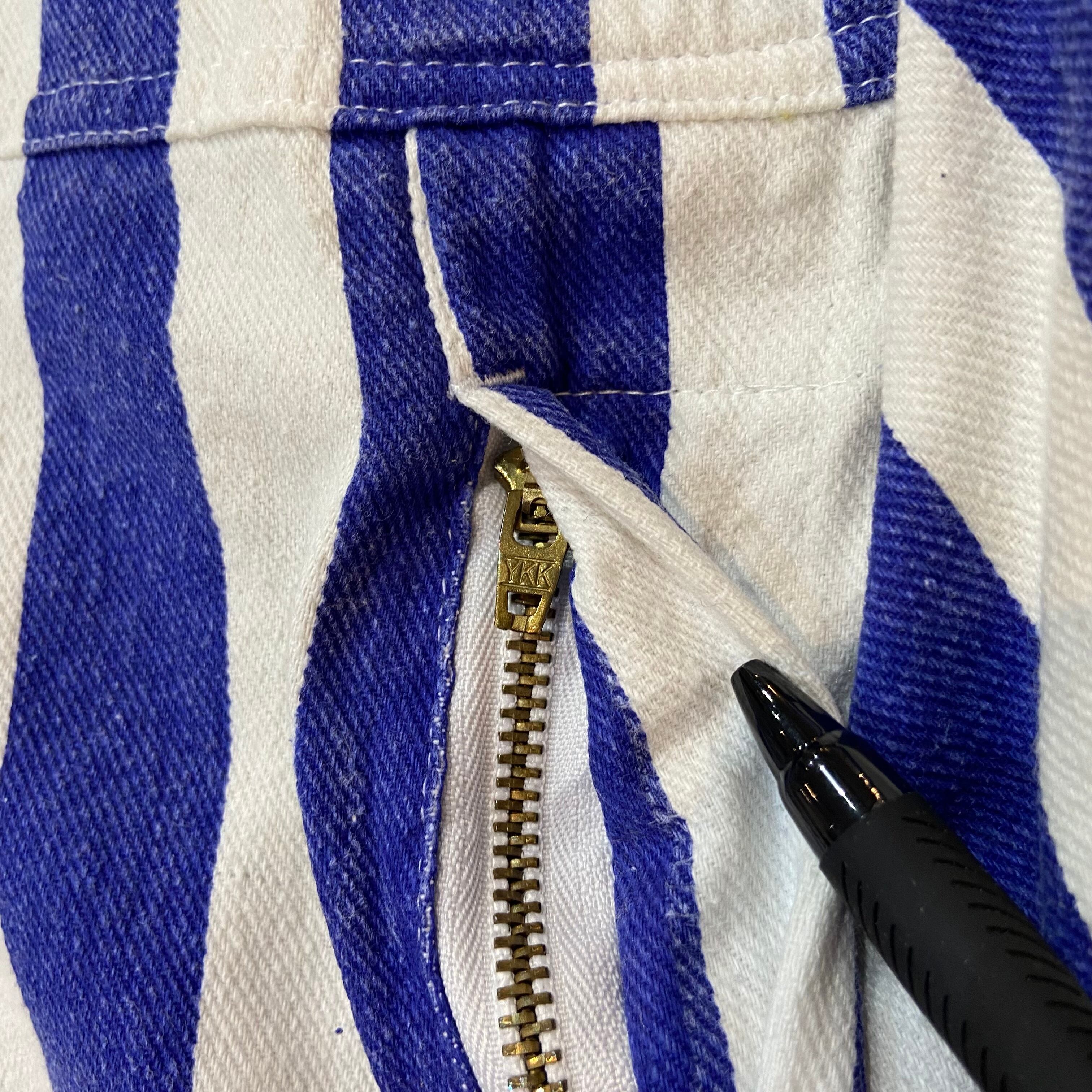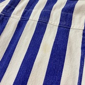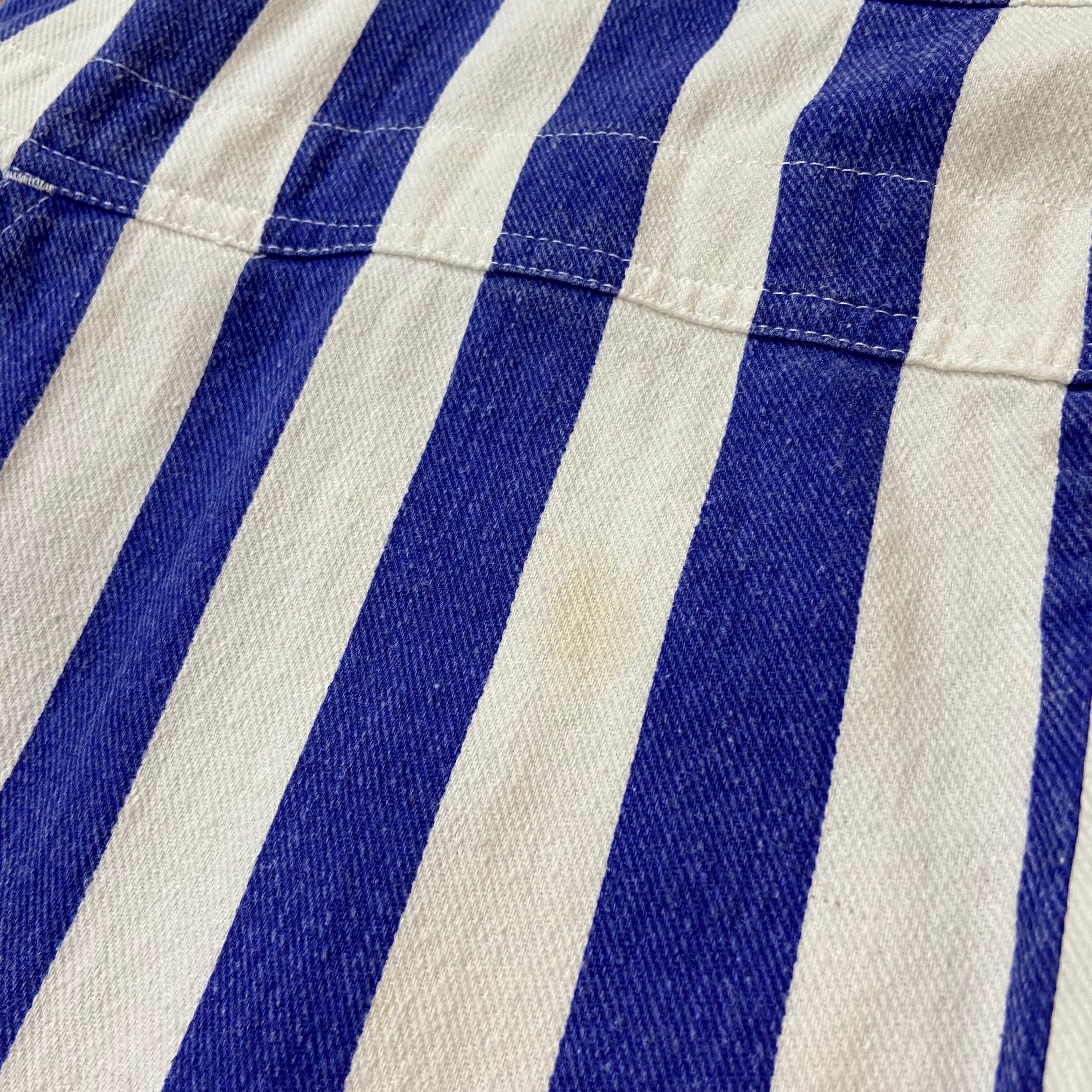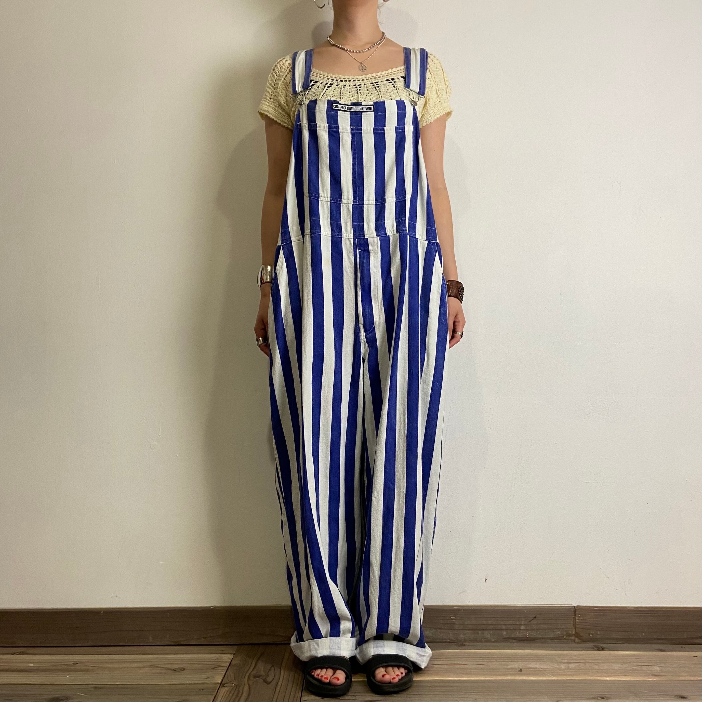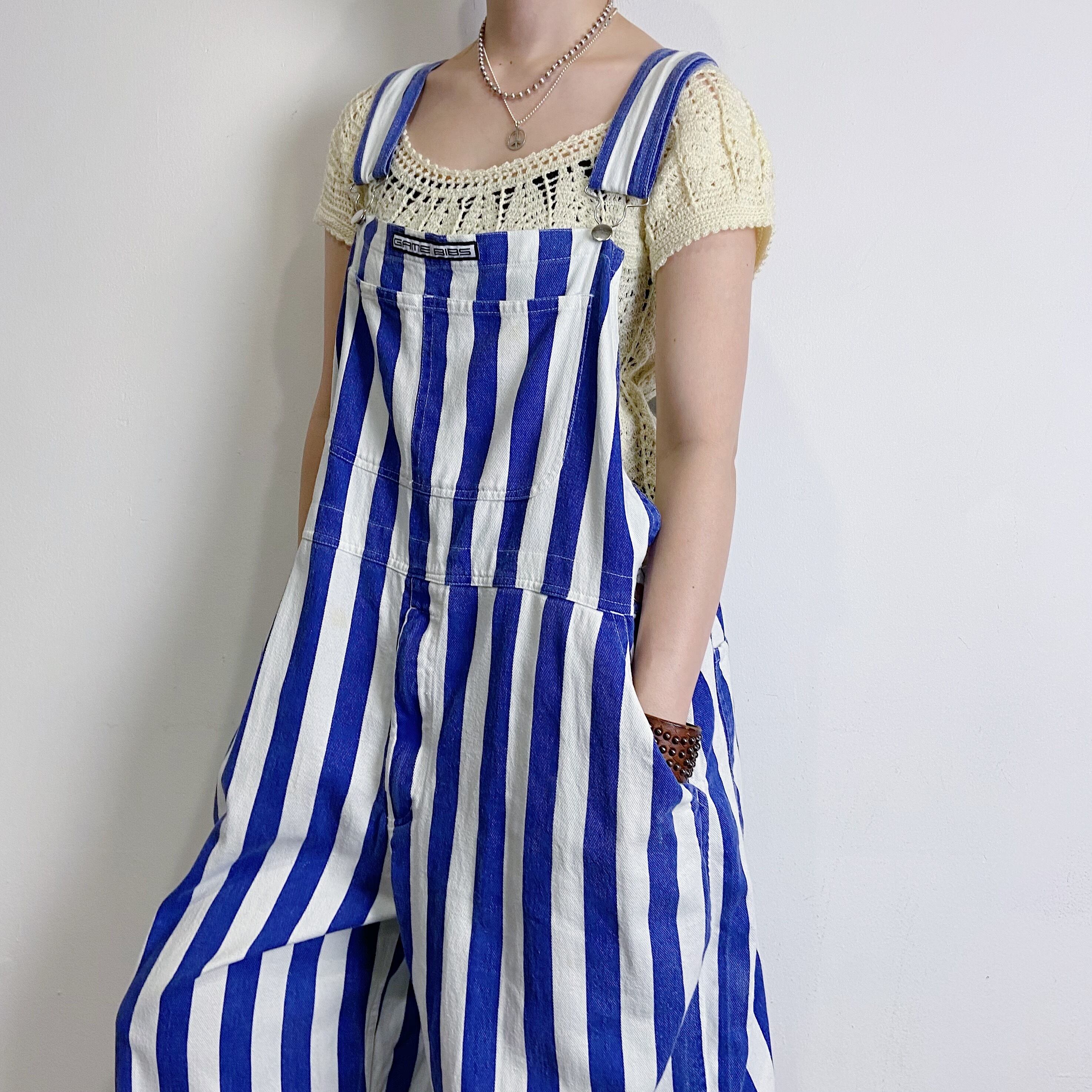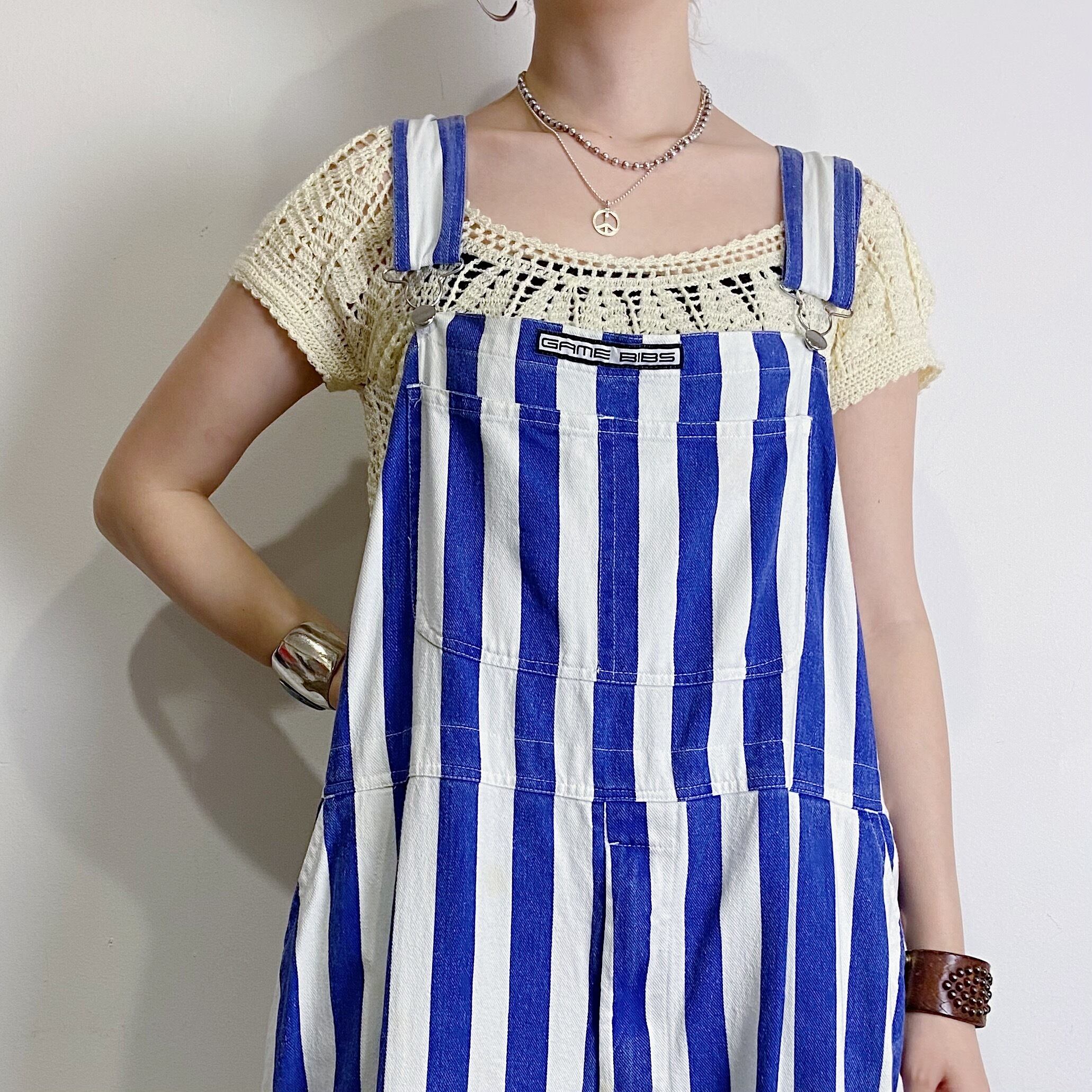 パッキリとしたブルーとホワイトのストライプが可愛い、オーバーオールです。