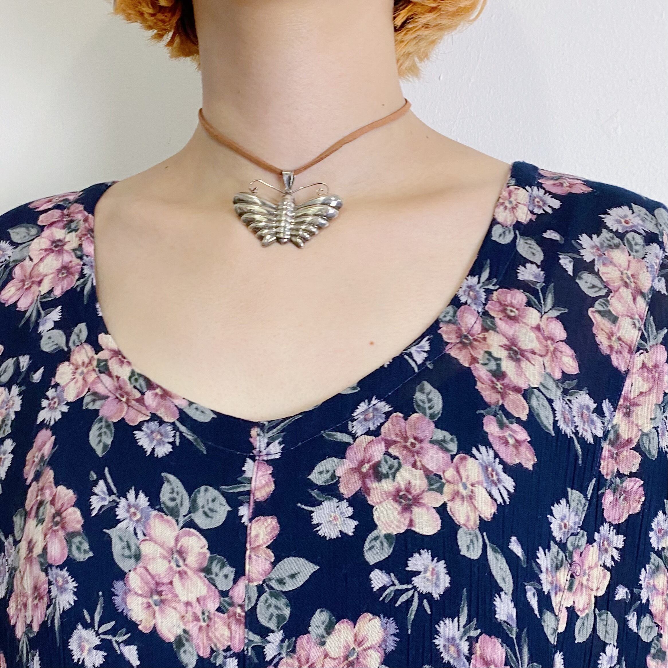 ネイビーカラーにピンクの小花が可愛いプリントで、ゆったりとしたお袖や広いデコルテラインも素敵。