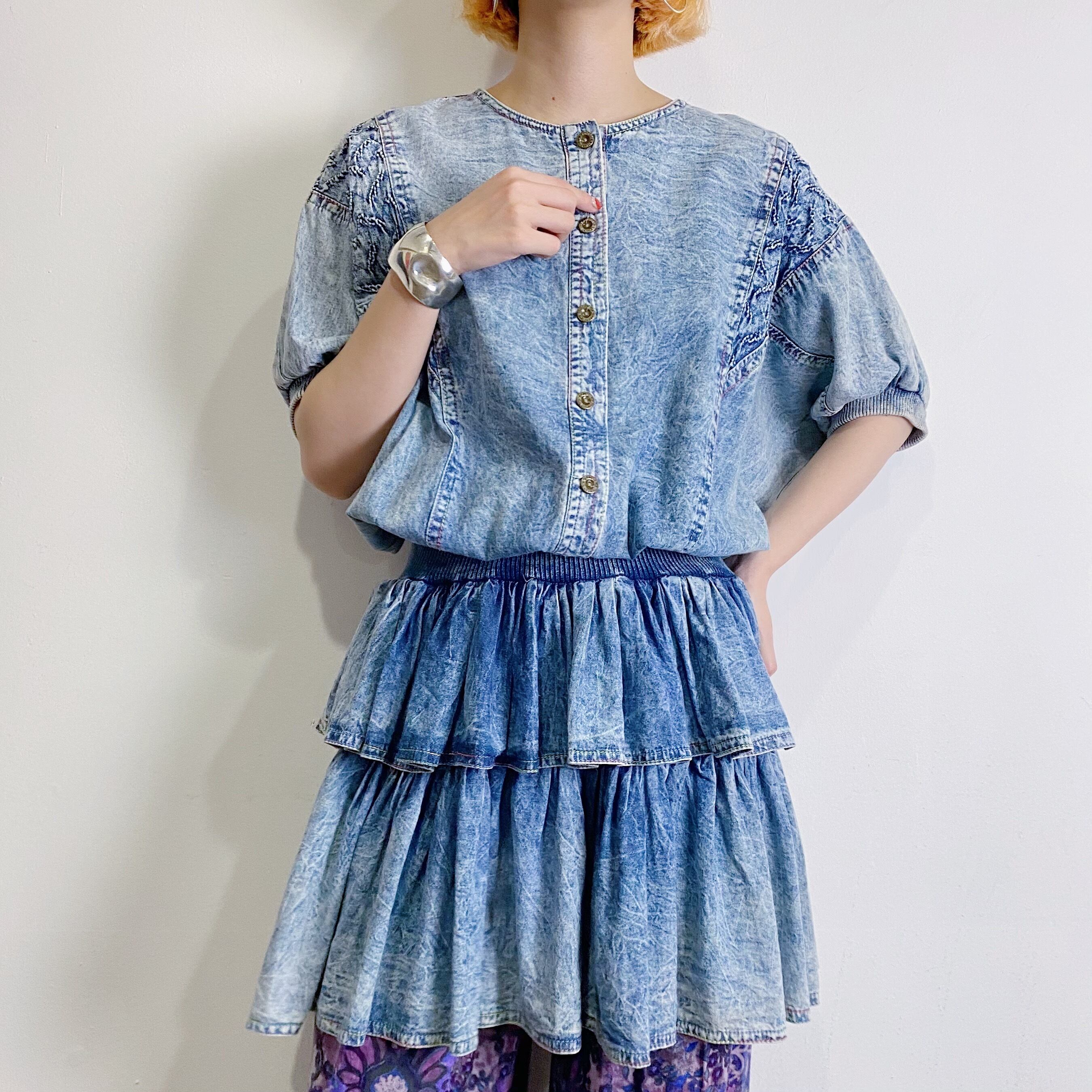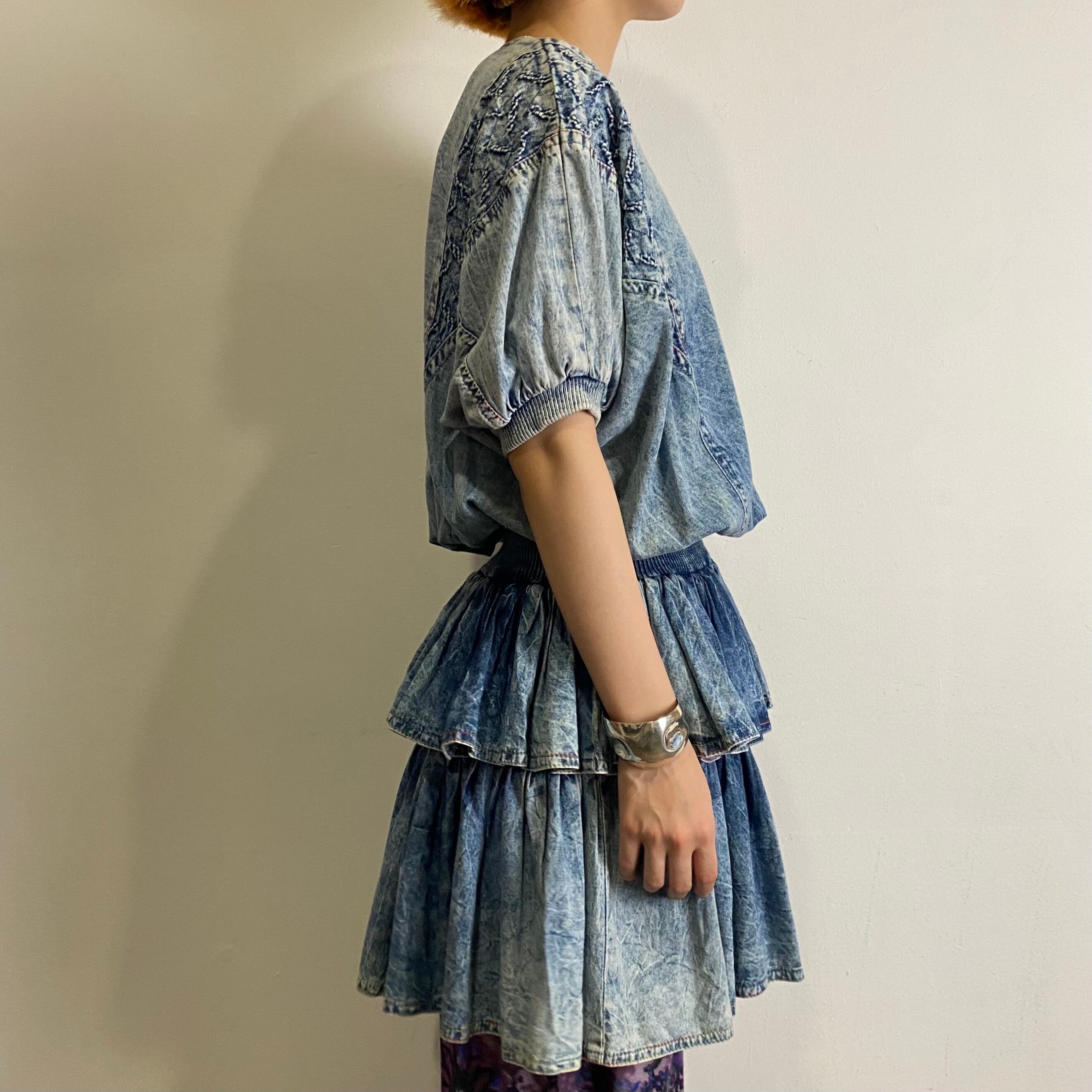 ケミカルウォッシュの素材感と、スカート下からのボリューミーな二段ギャザーが可愛いミニワンピースです。