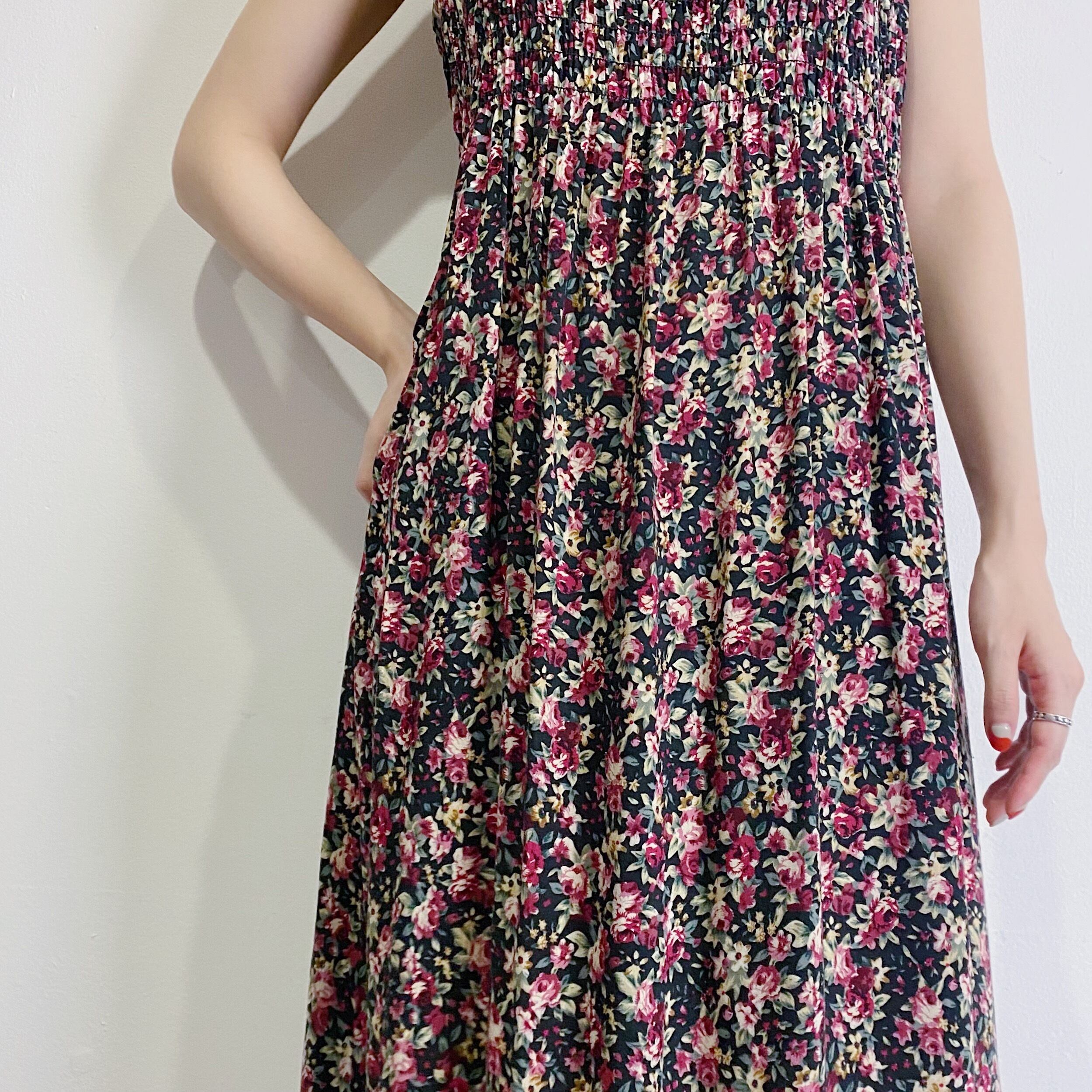 胸のシャーリングが可愛い、レーヨン素材の小花柄ワンピースです。