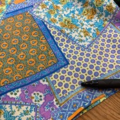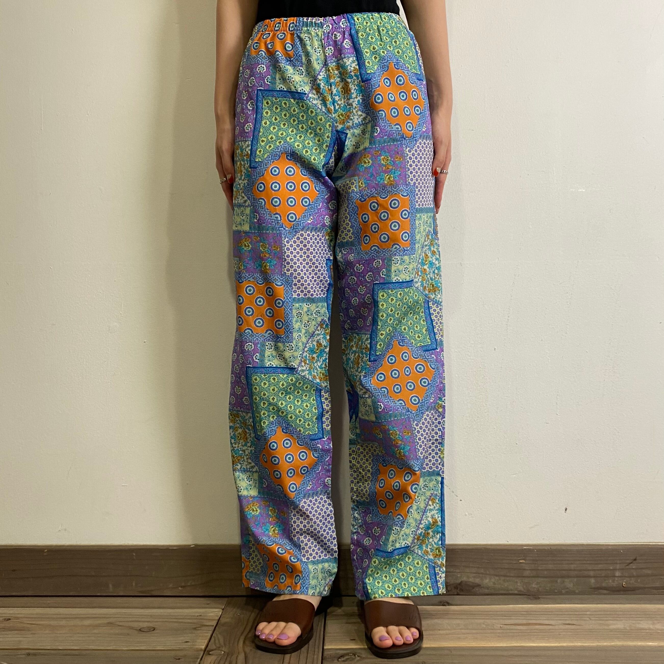 パッチワークプリントが可愛い、紫やブルーベースが可愛いイージーパンツです。