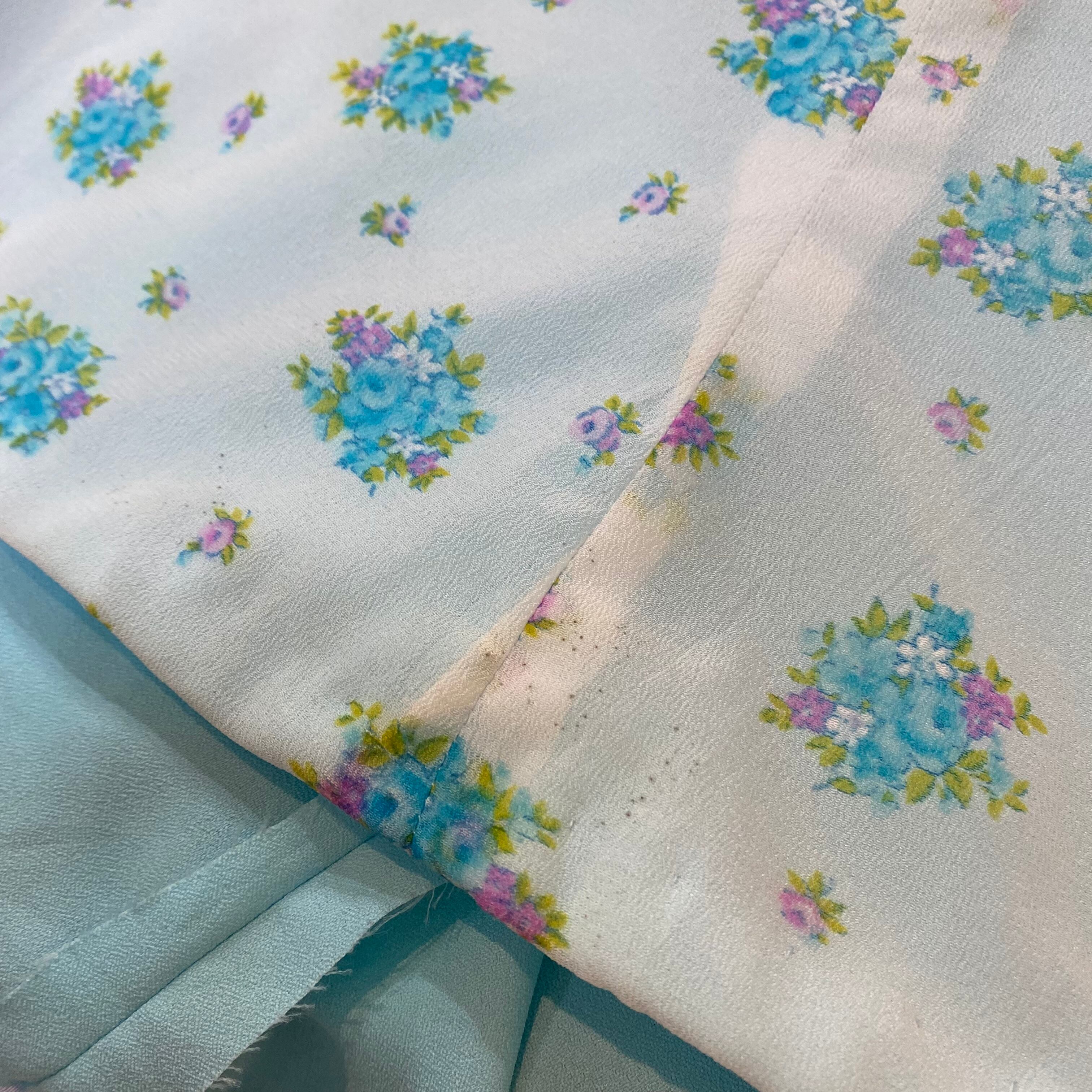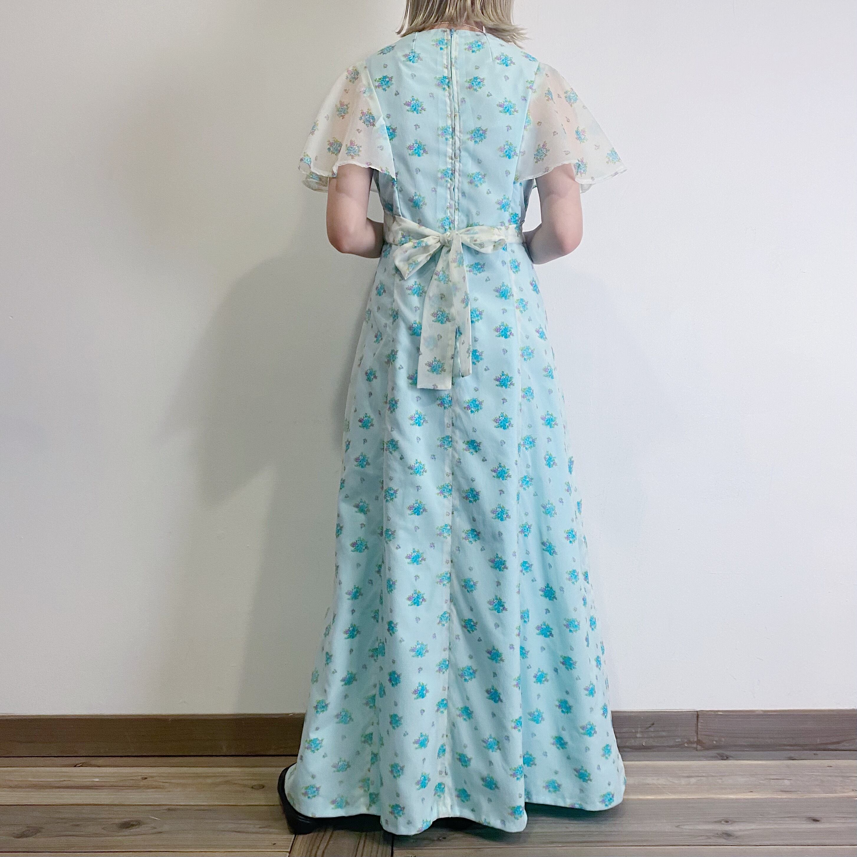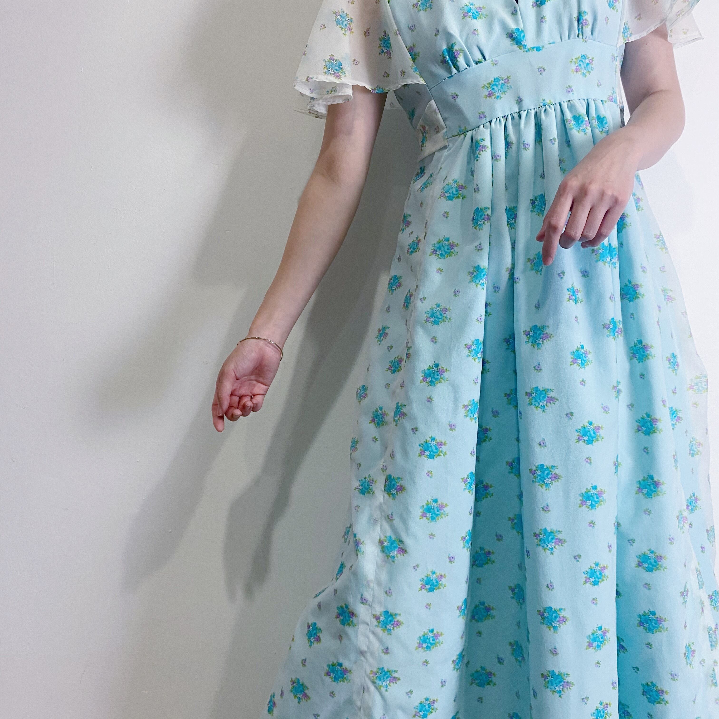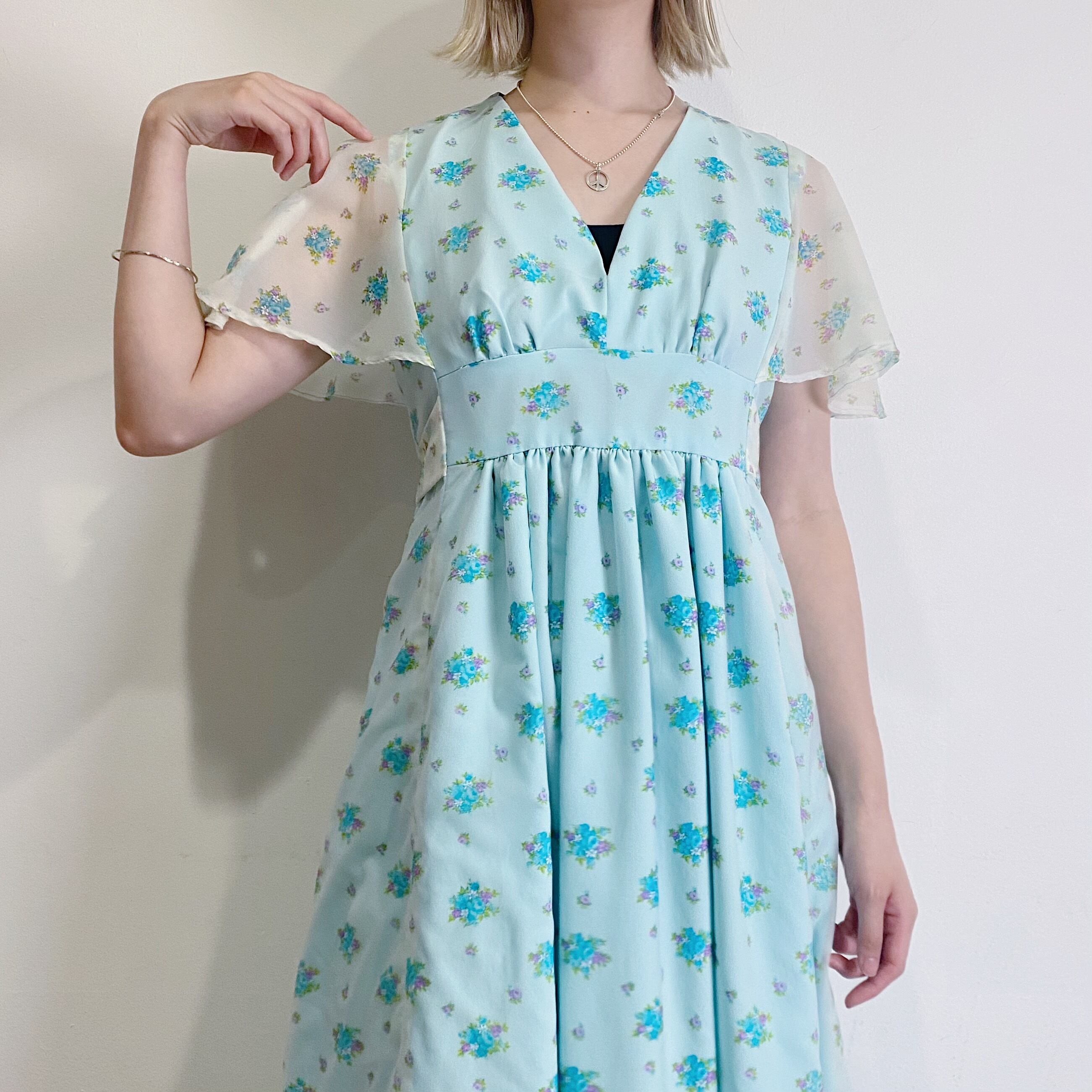 爽やかな水色にシアー素材、フレアスリーブに広がるAラインシルエットが可愛い70年代ワンピースです。