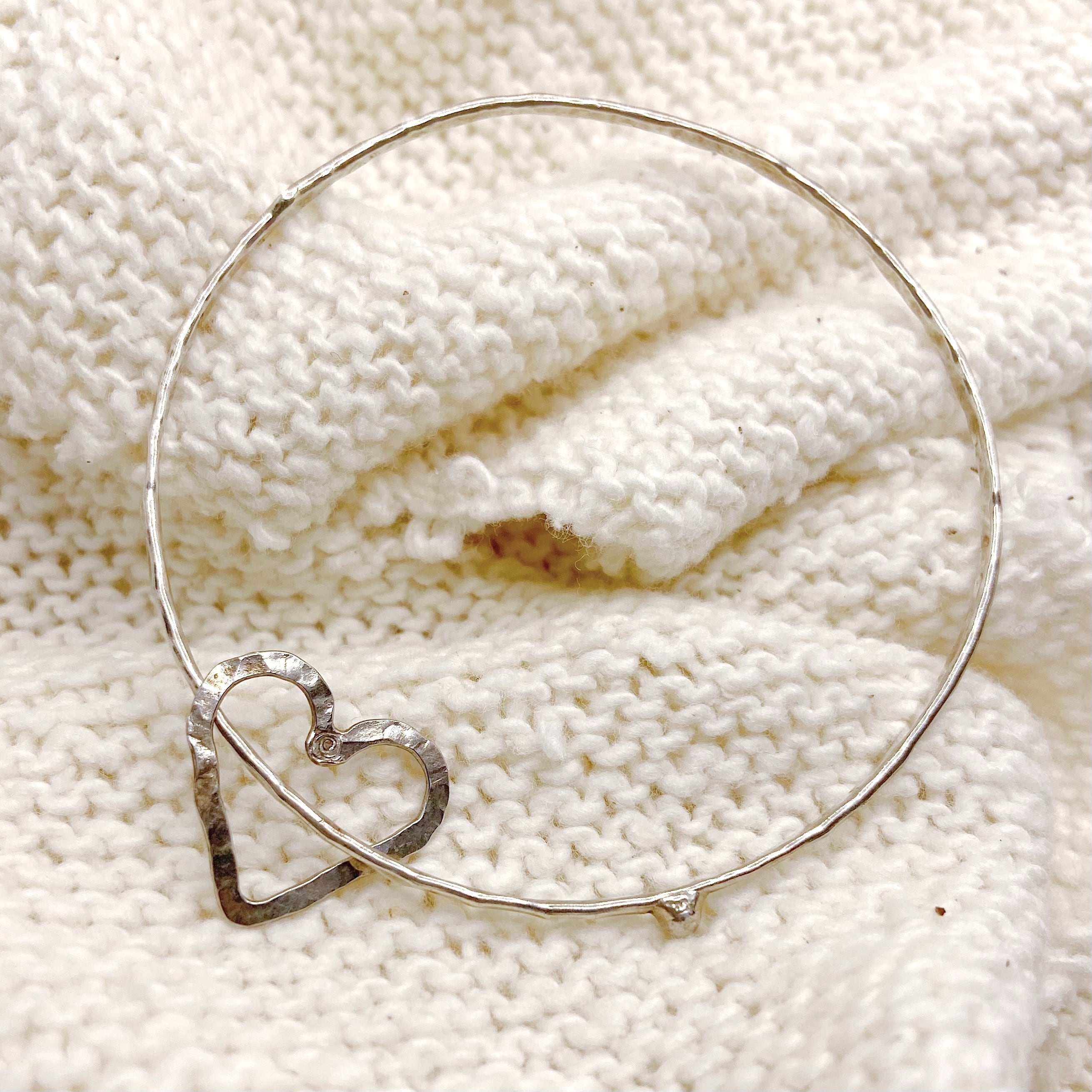輪にハートがぶら下がったデザインがなんともキュートな、925シルバーのブレスレットです。