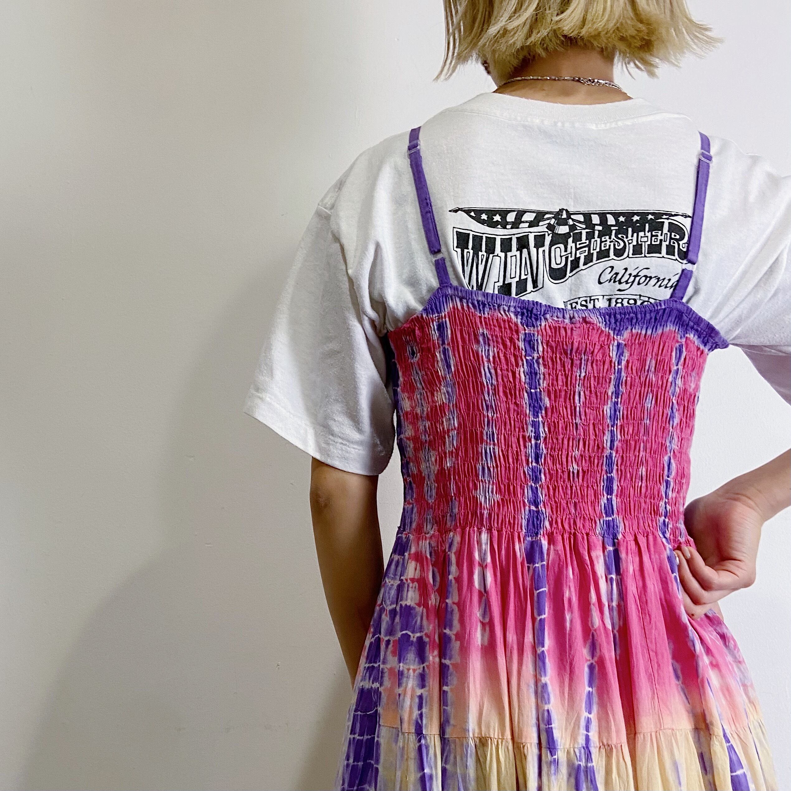 カラフルな色合いと胸のシャーリングが可愛いタイダイワンピースです。