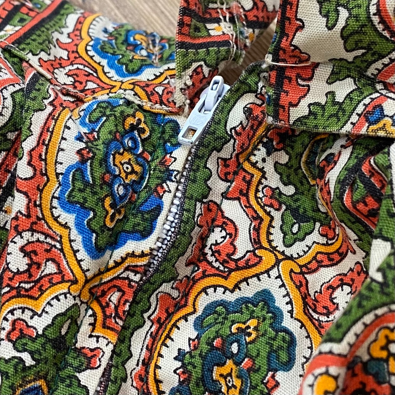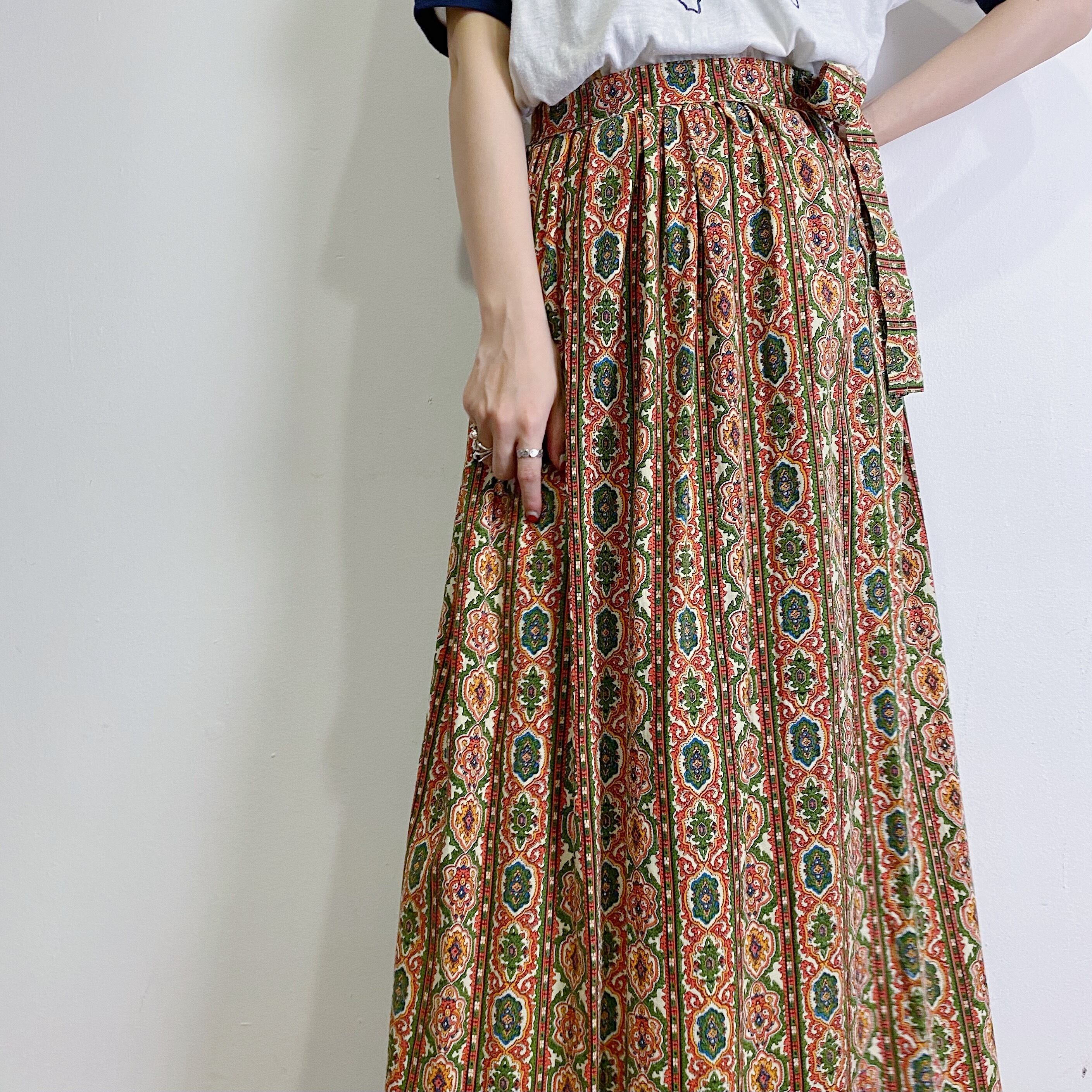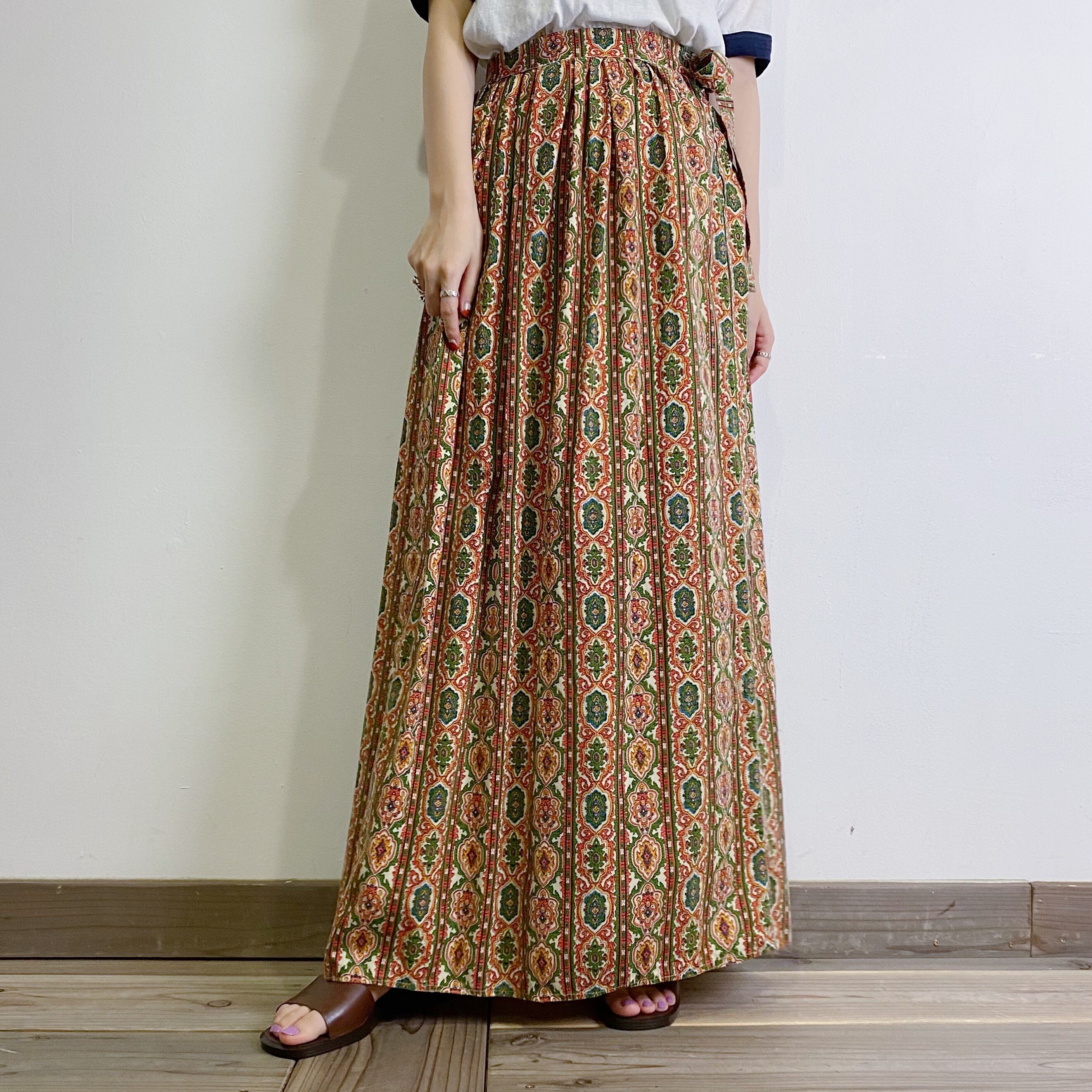 オレンジとグリーンのレトロな柄が可愛い70年代のロングスカートです。