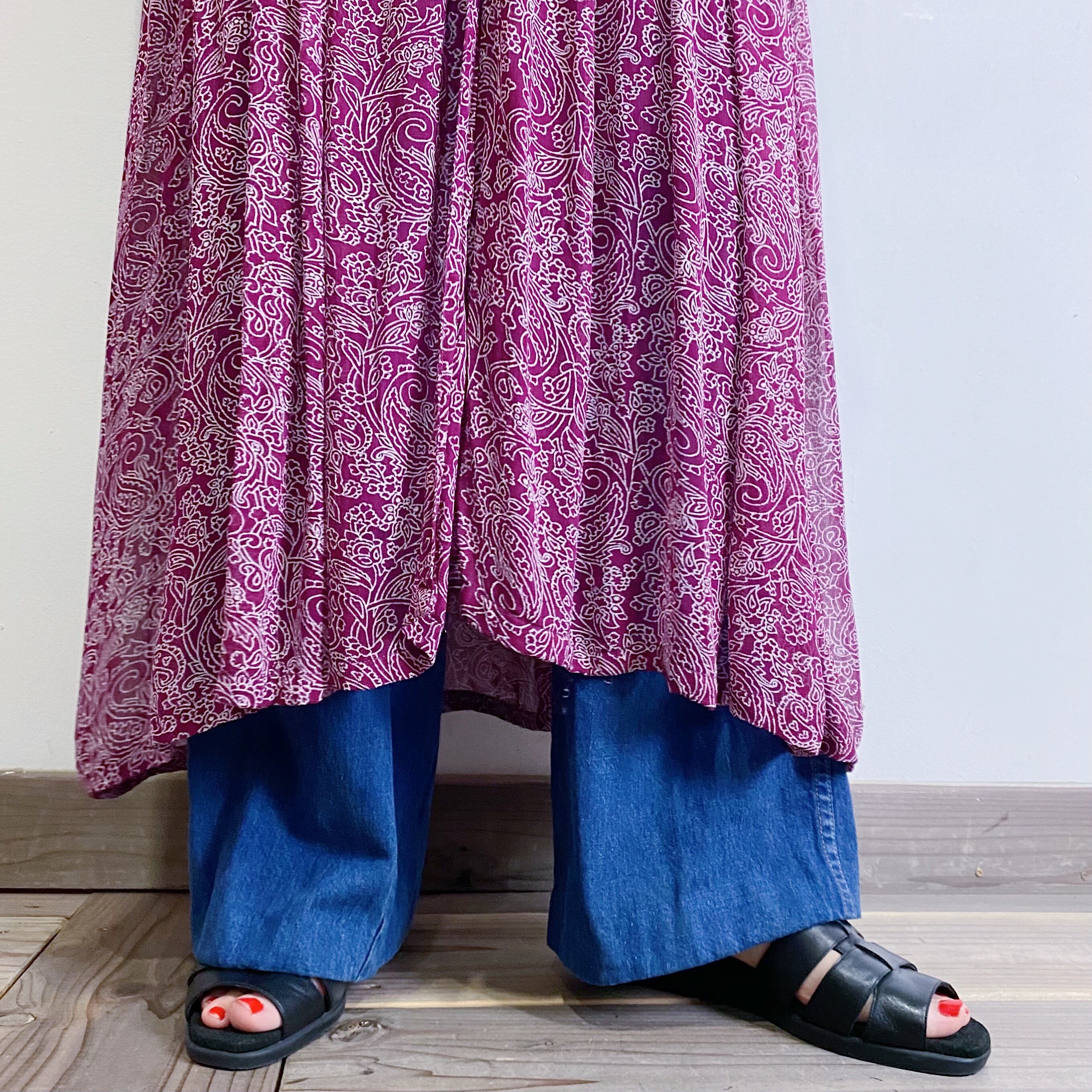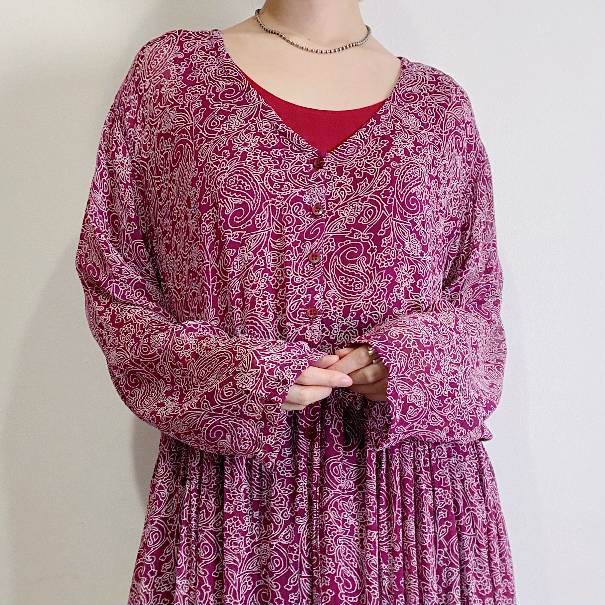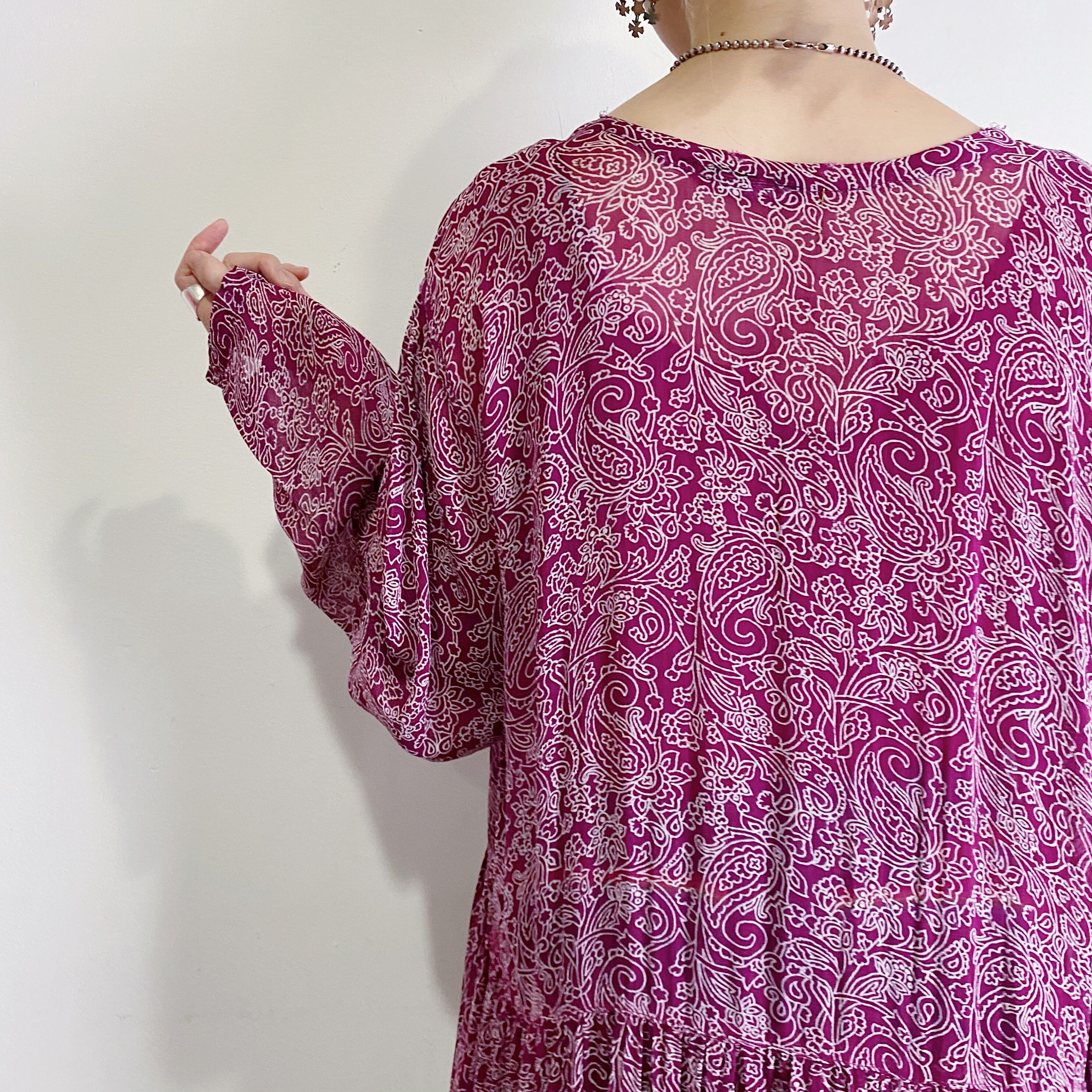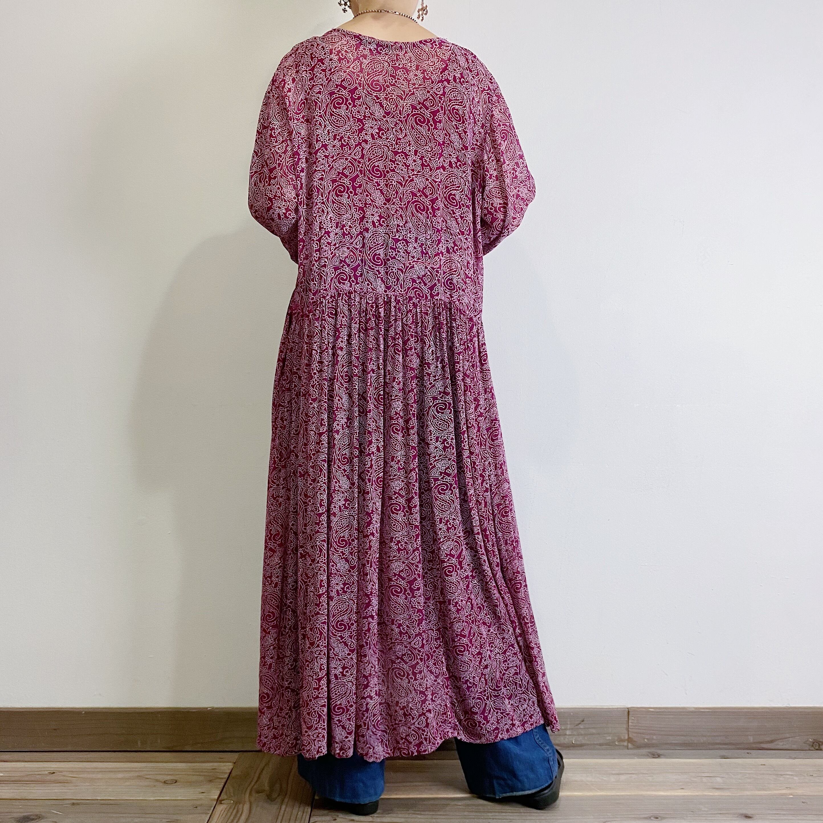 ボルドーカラーにペイズリープリントの、軽い透け感が涼やかなワンピースです。