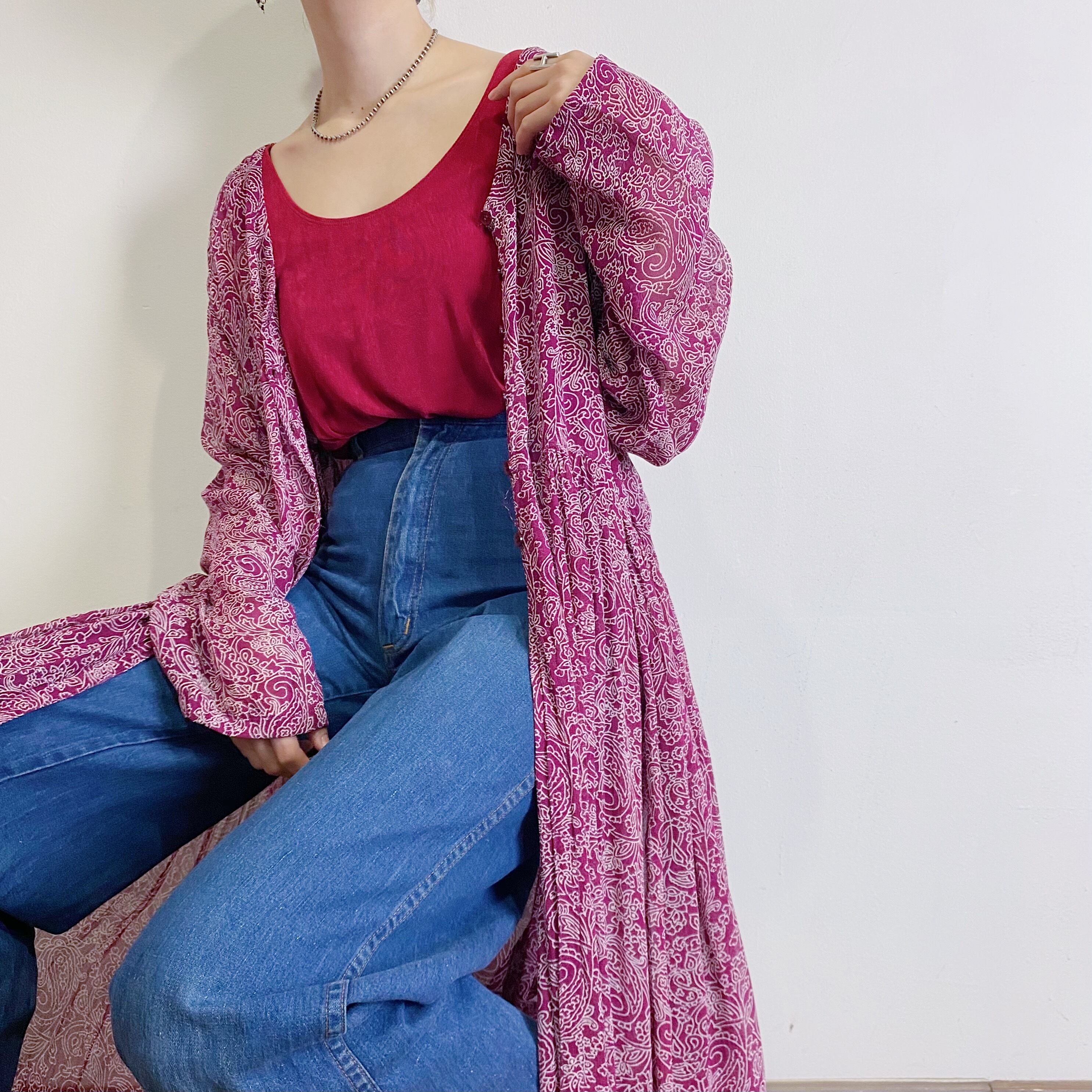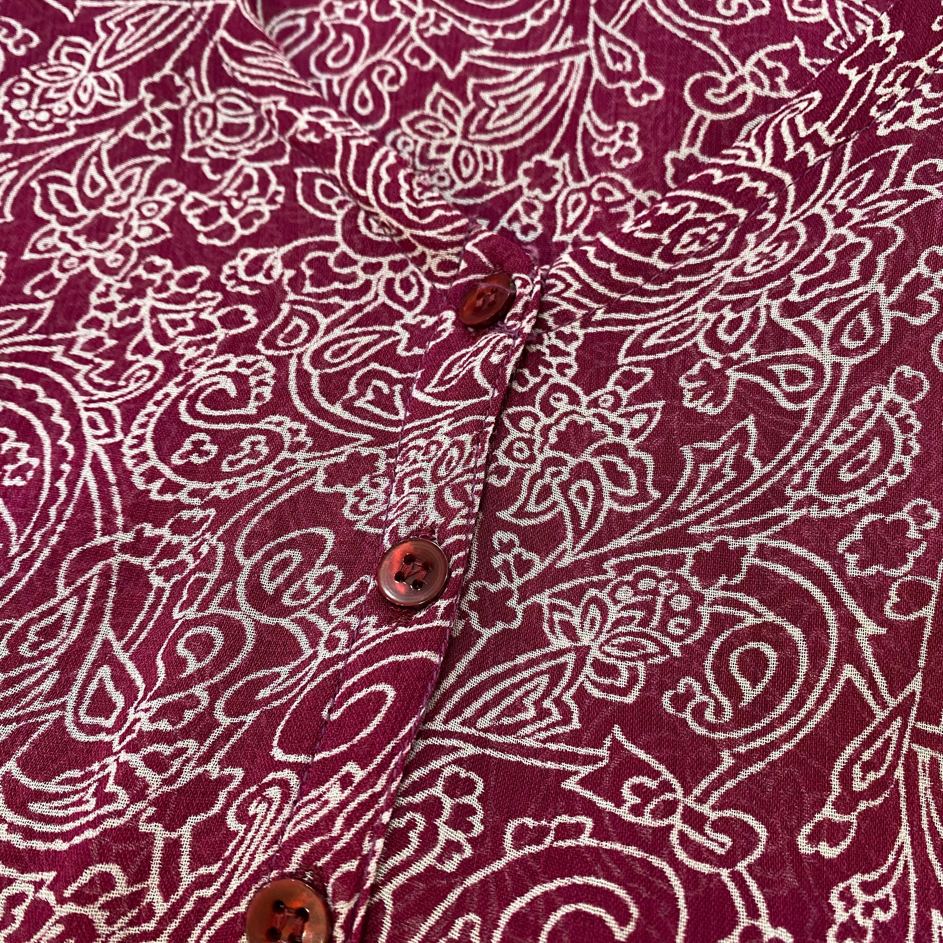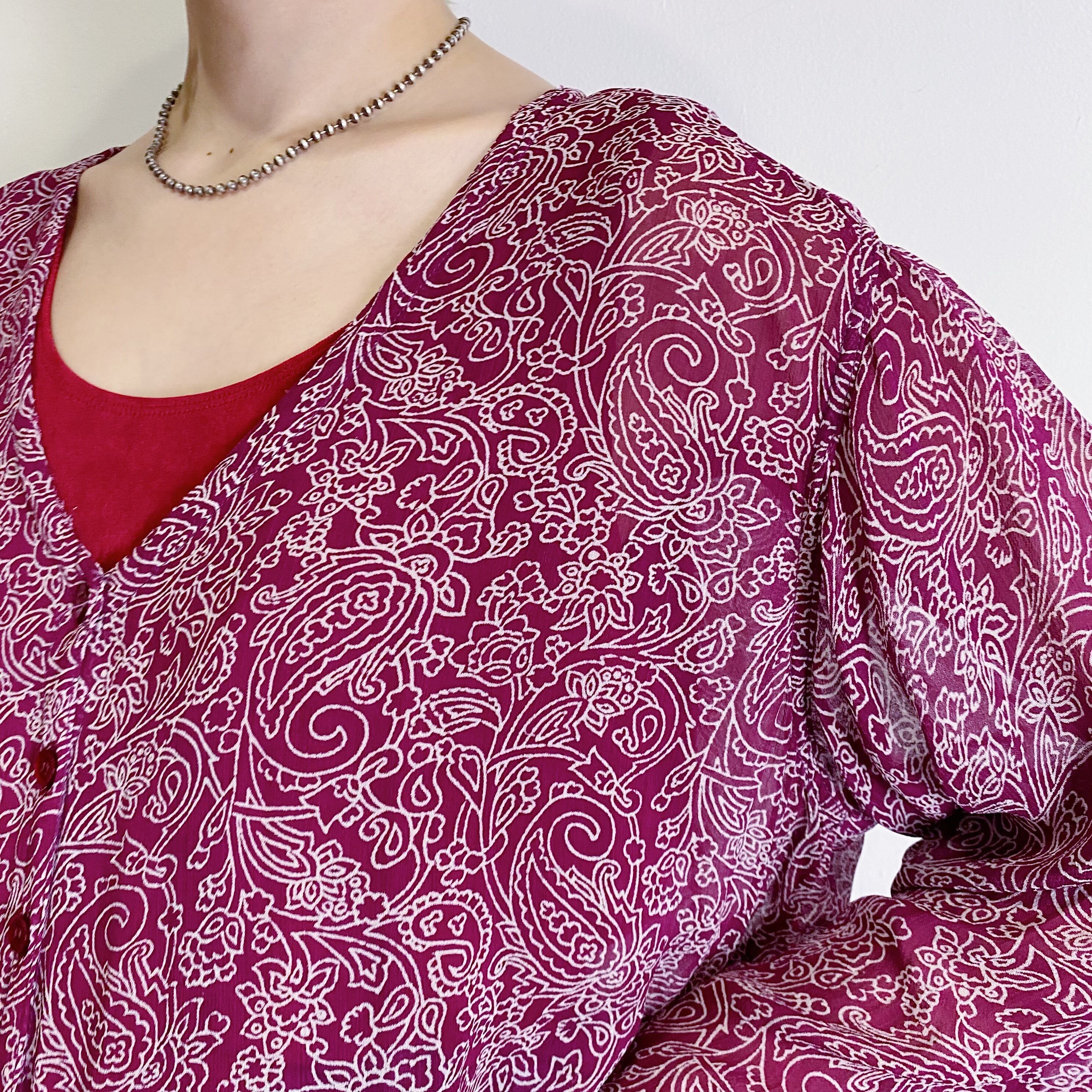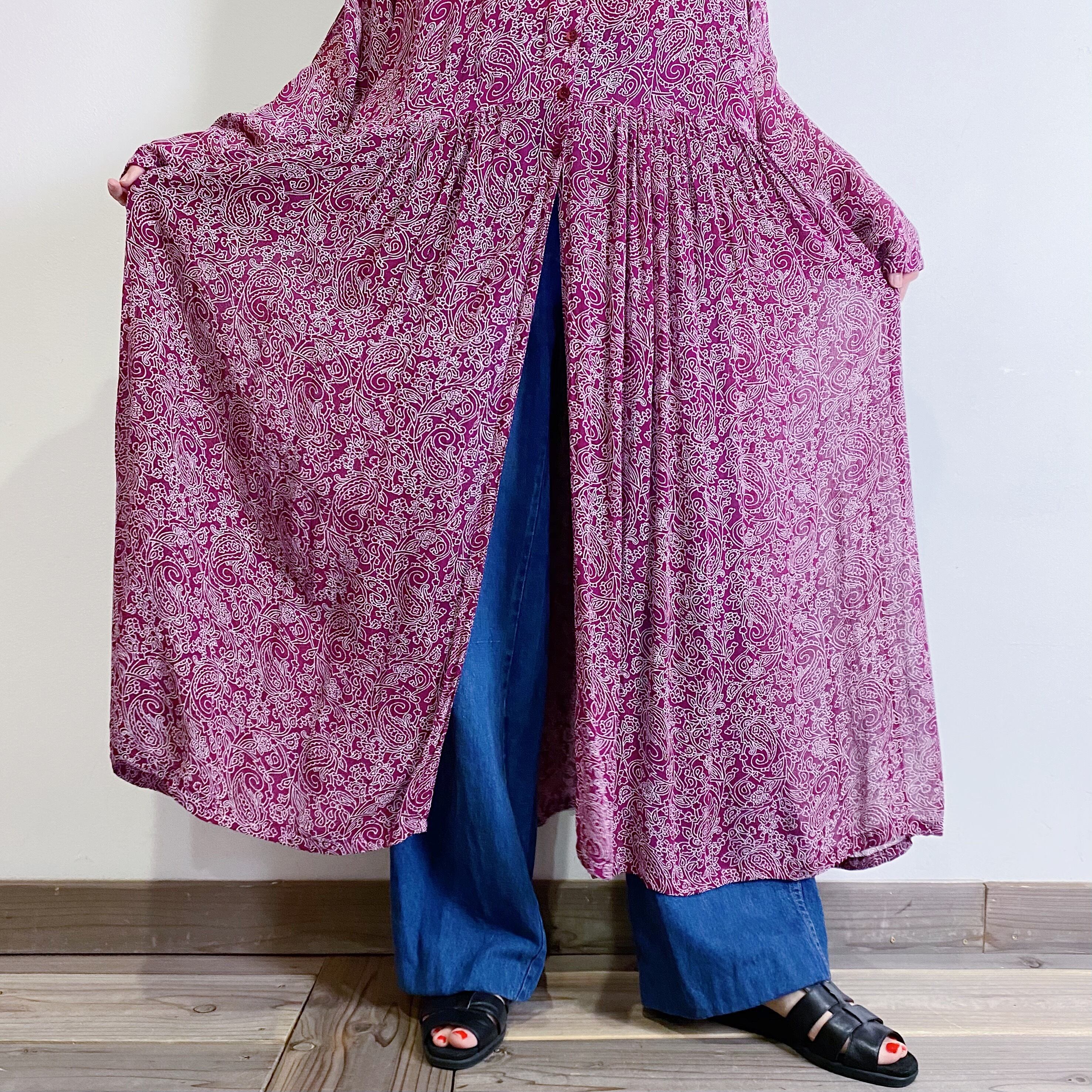 ボルドーカラーにペイズリープリントの、軽い透け感が涼やかなワンピースです。