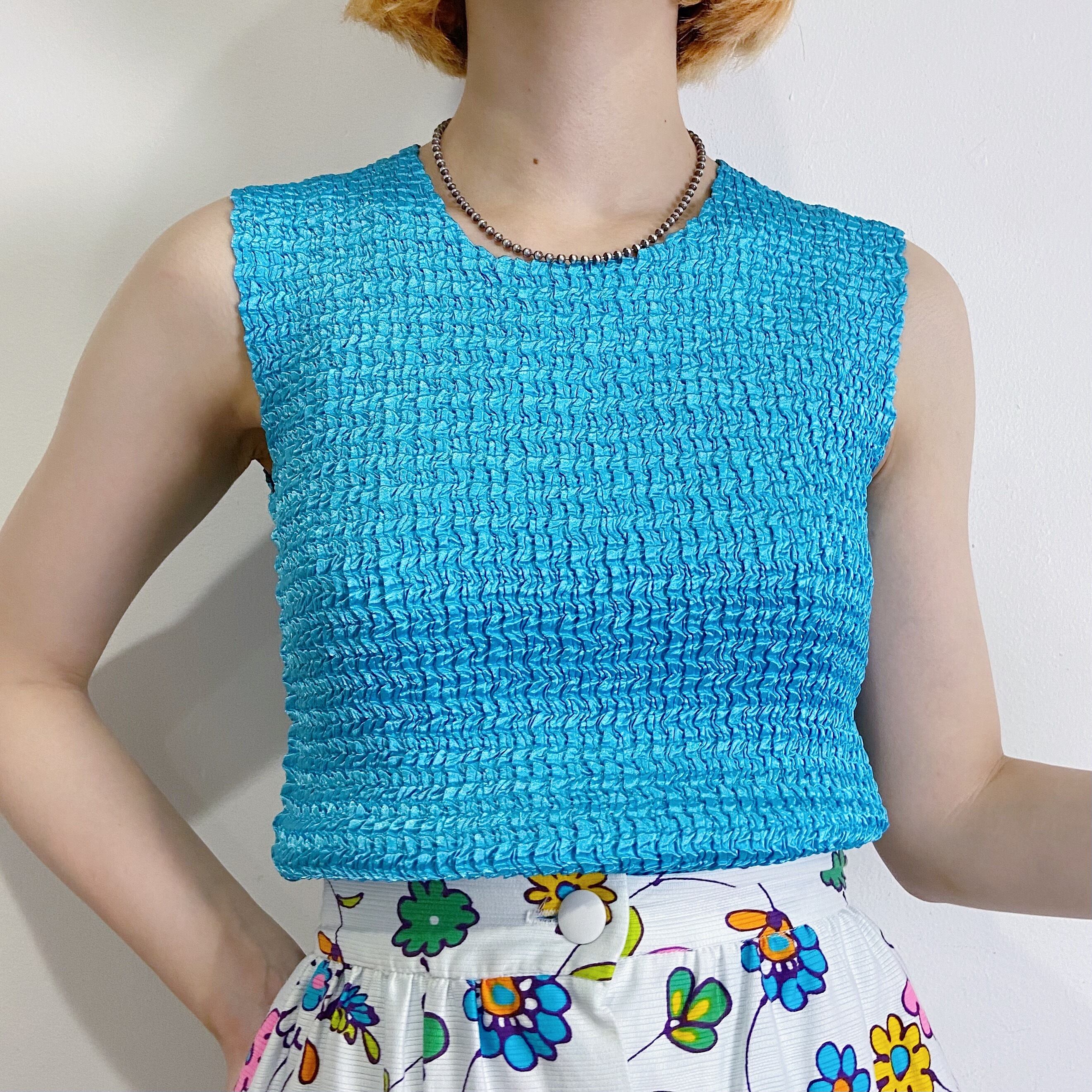 ぽこぽことしたデザインが楽しい、スカイブルーカラーのノースリーブトップスです。