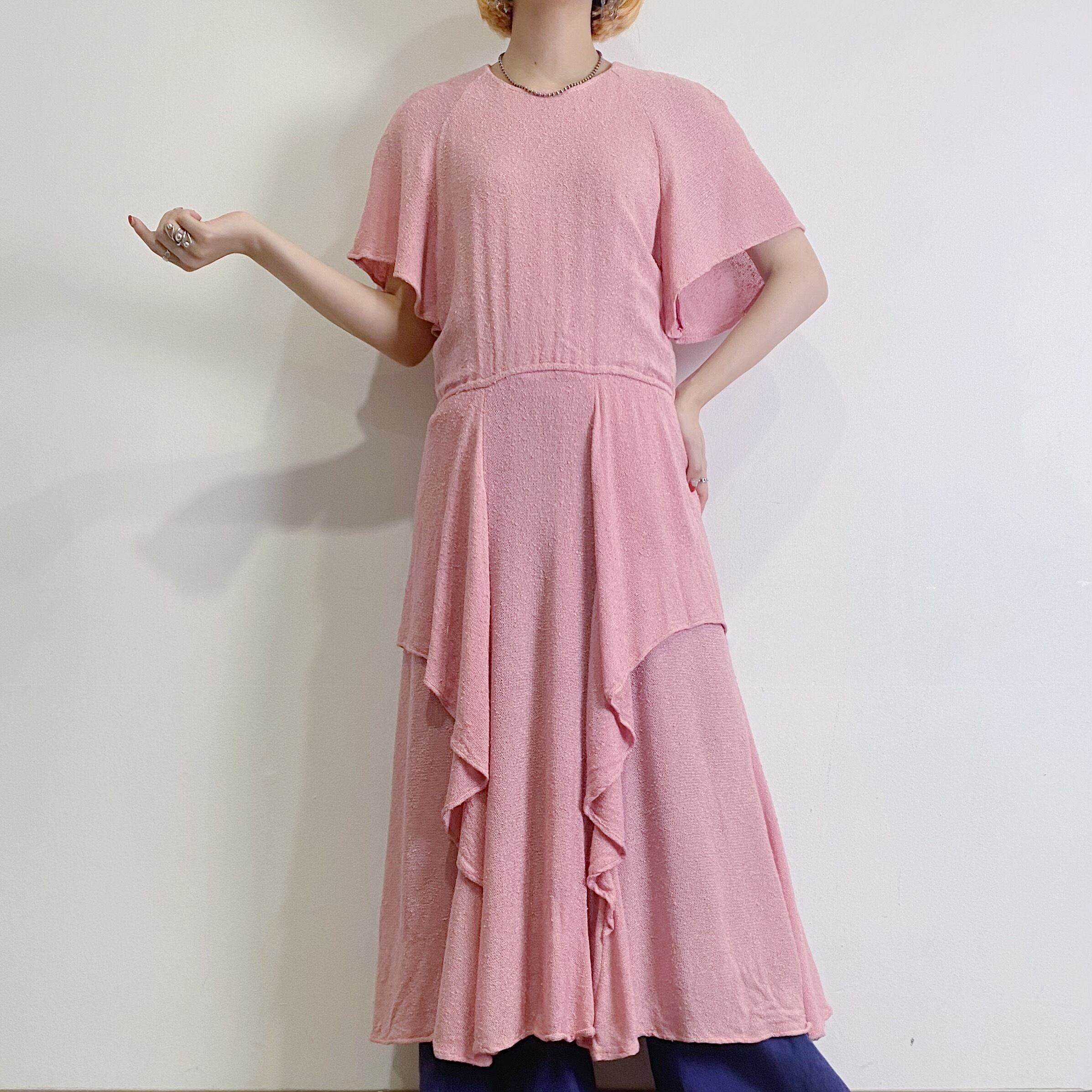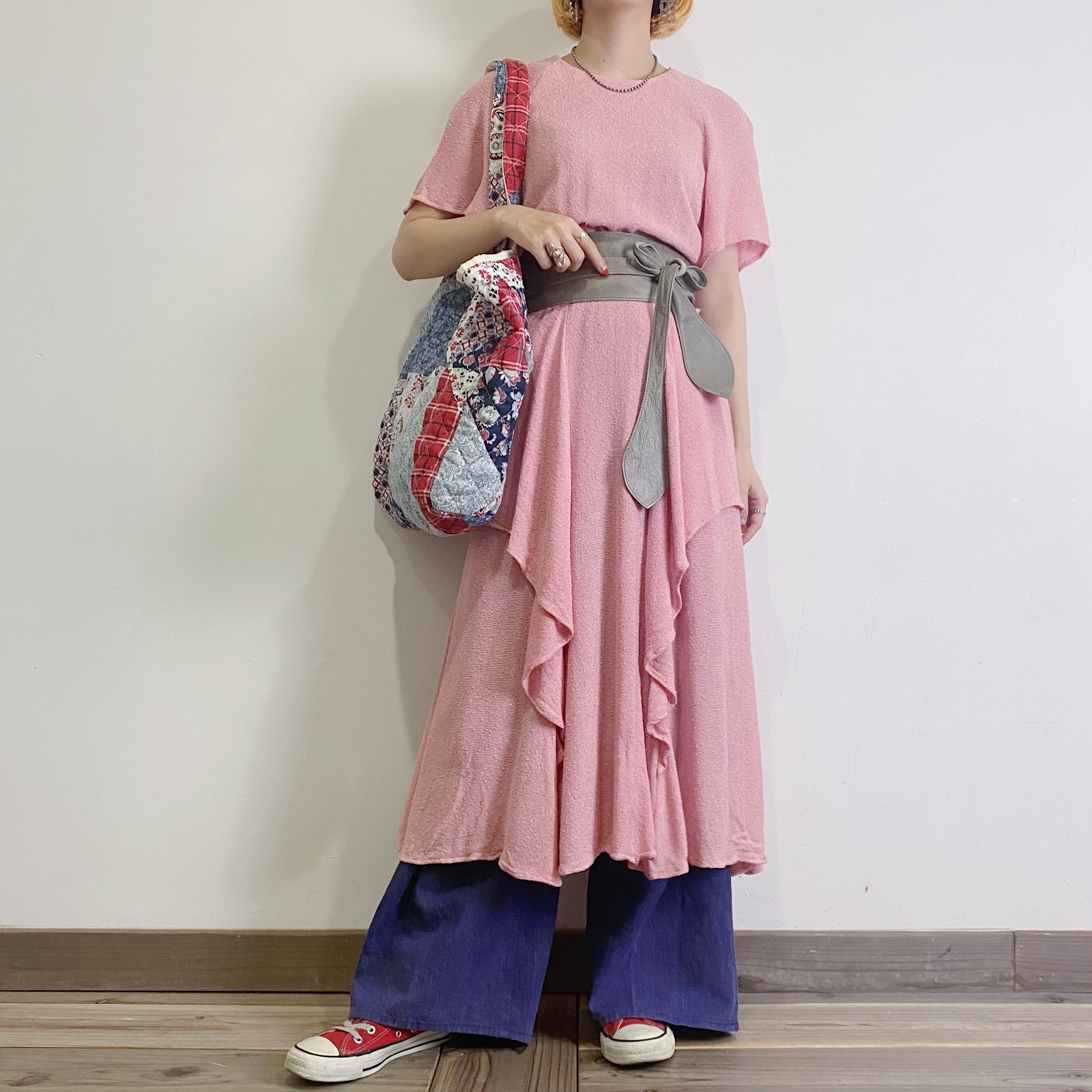 ゆったりとしたデザインにぽこぽことした不思議なコットン素材、フロントのフリルが可愛い70年代ワンピースです。