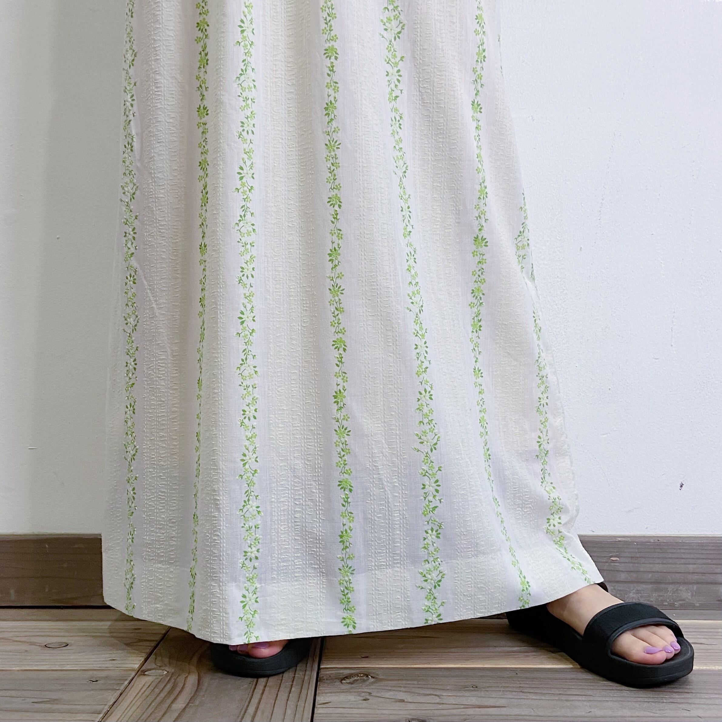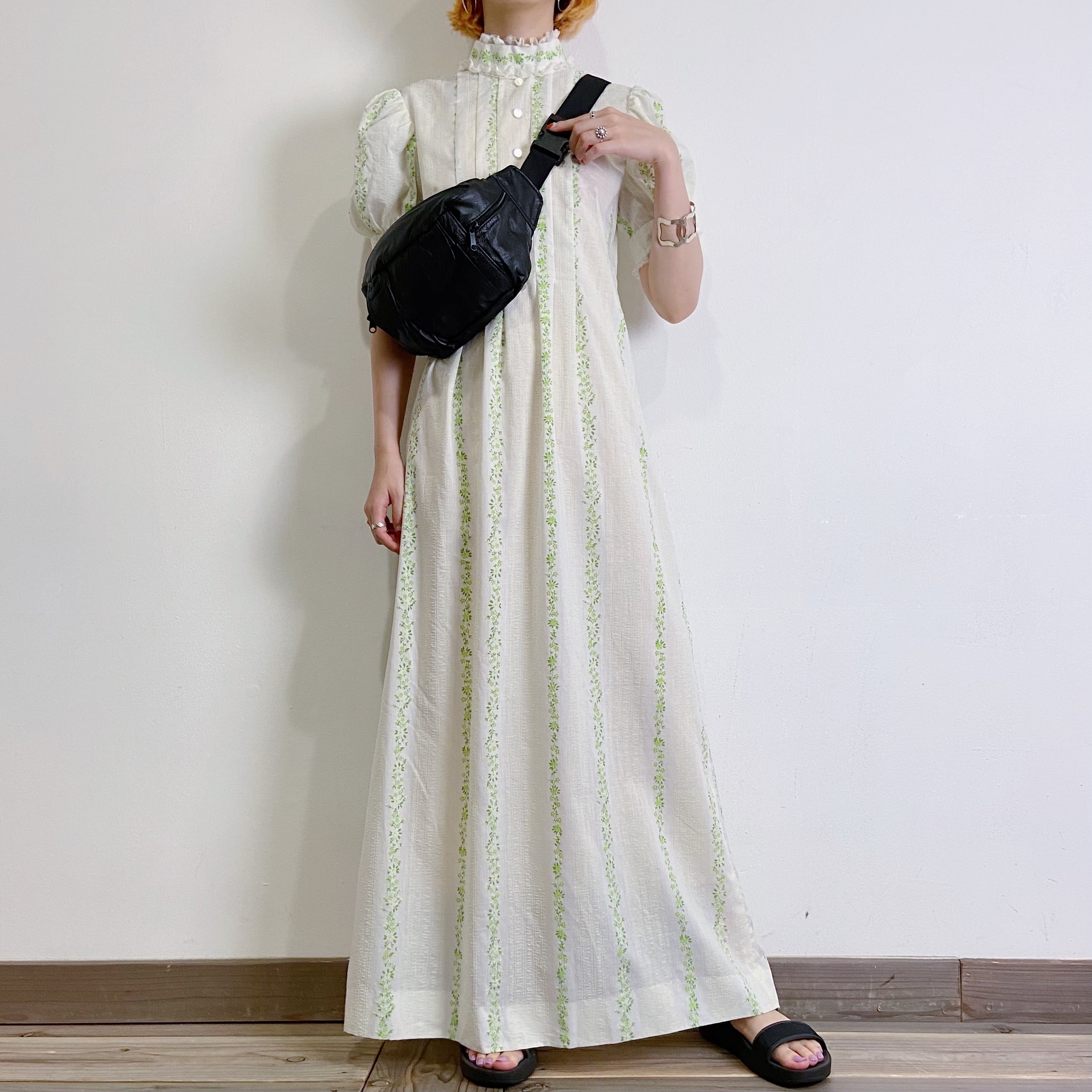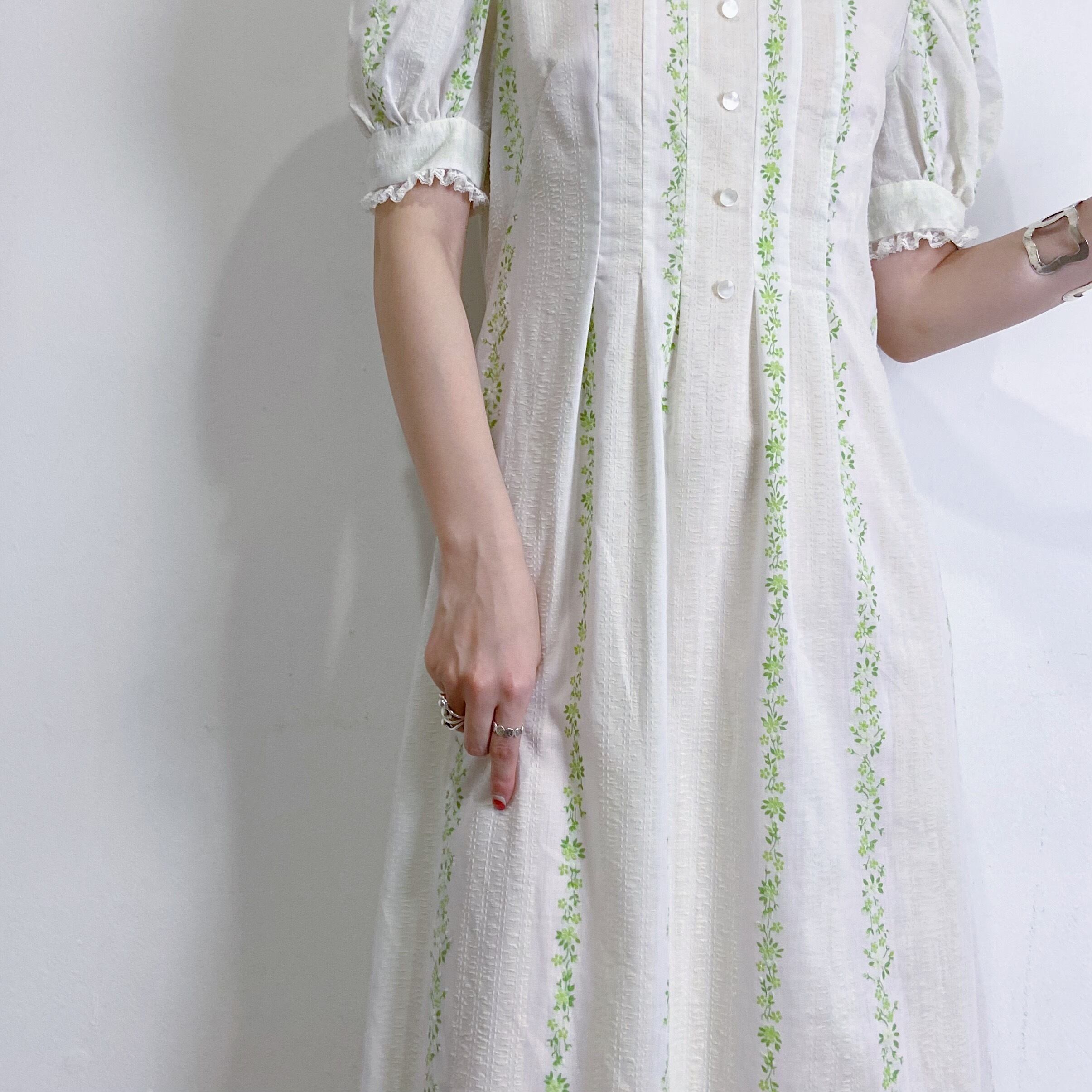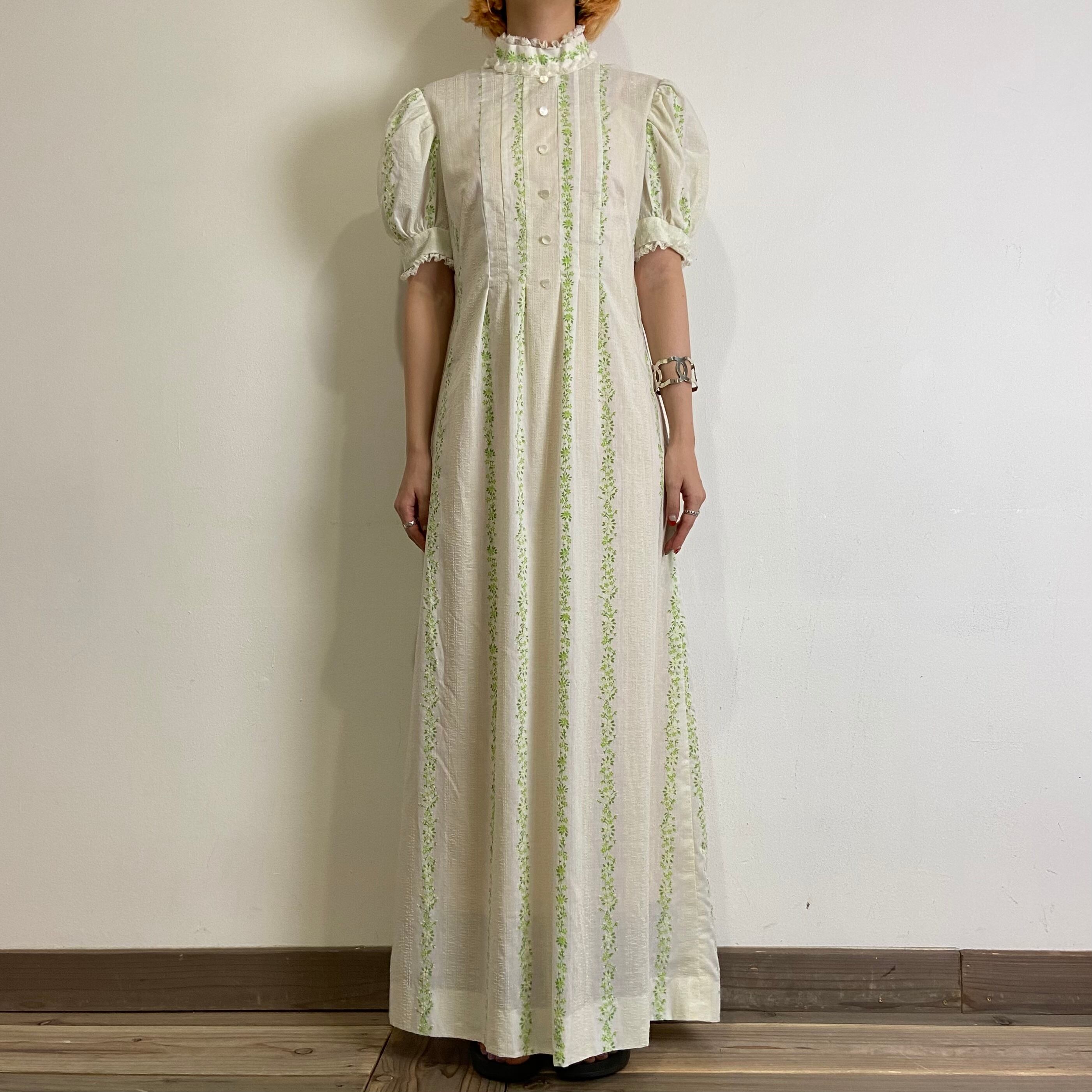 小花柄でできたストライプとミントグリーンの色合いが可愛い、70年代のワンピースです。