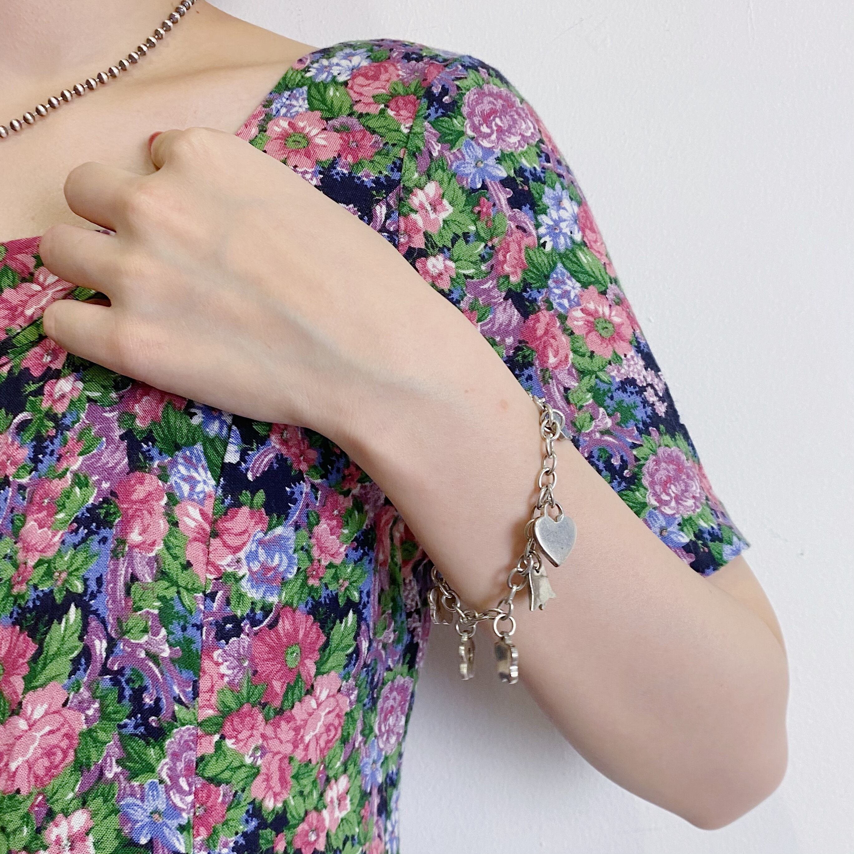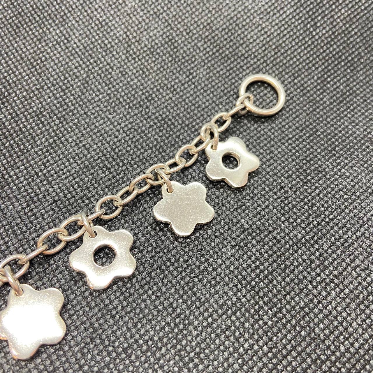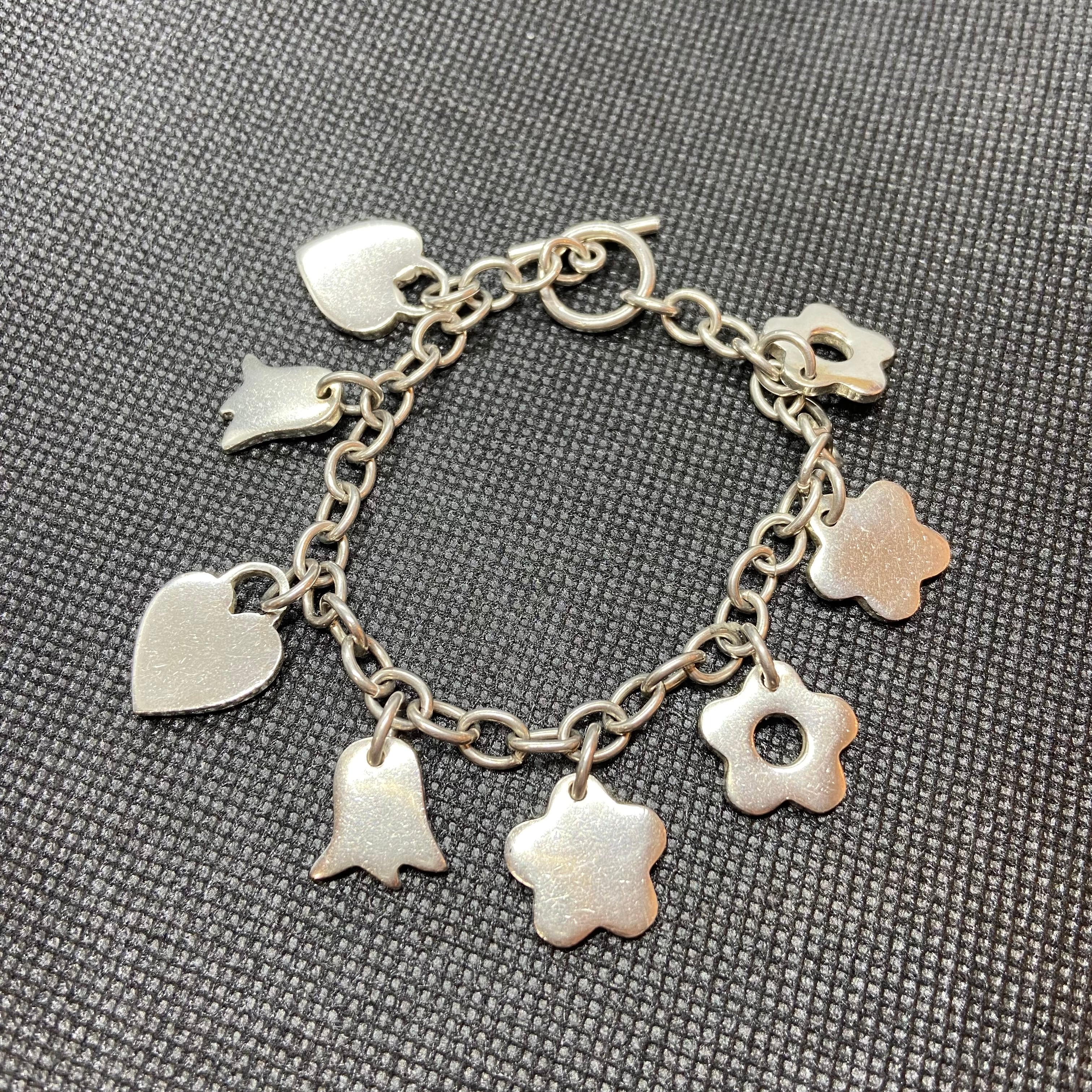 ハートやお花のモチーフがぶら下がる、キュートな925シルバーのブレスレットです。