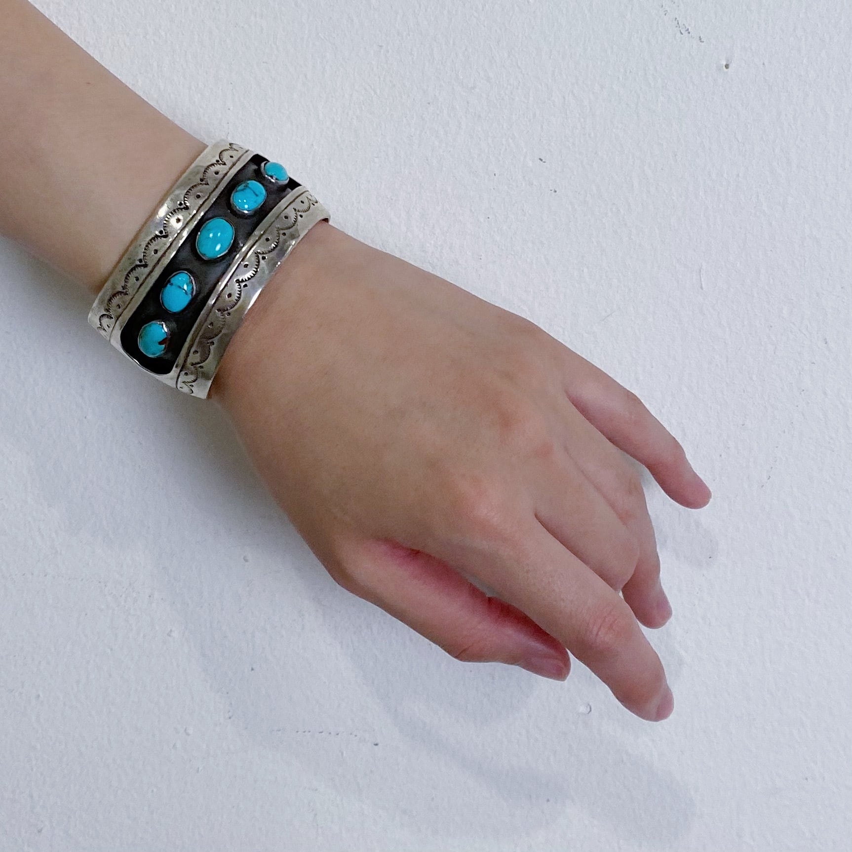 スカラップのような彫りのデザインと、並んだターコイズが可愛い。