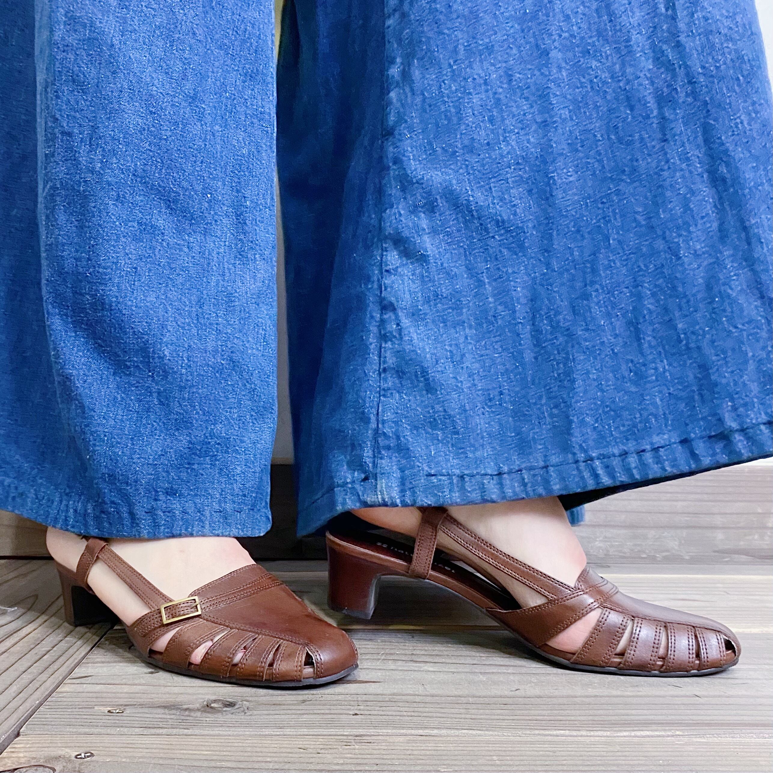 ストラップ付きで歩きやすく、程よいヒールの高さでスタイルアップな一足。