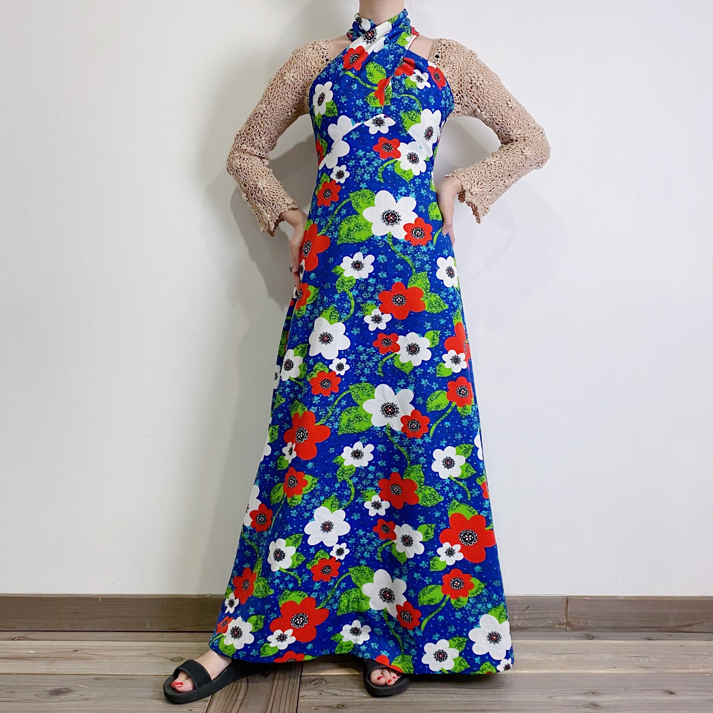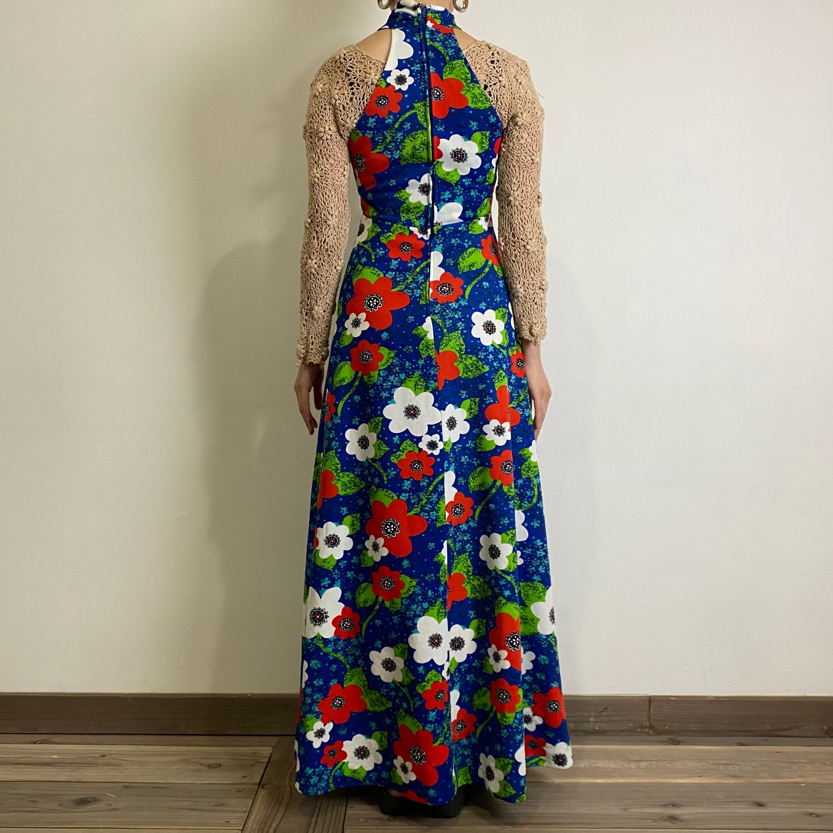 ポップな色合いの花柄が可愛い、70年代のロングワンピースです。