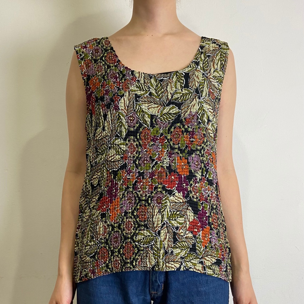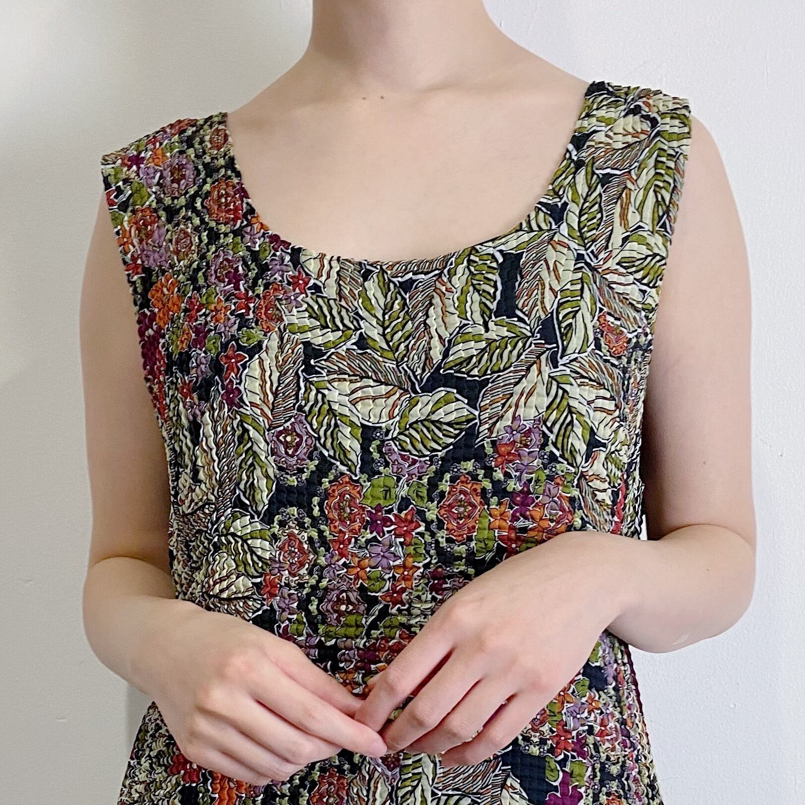 ボタニカル柄が可愛いユニークな素材感のノースリーブトップです。
