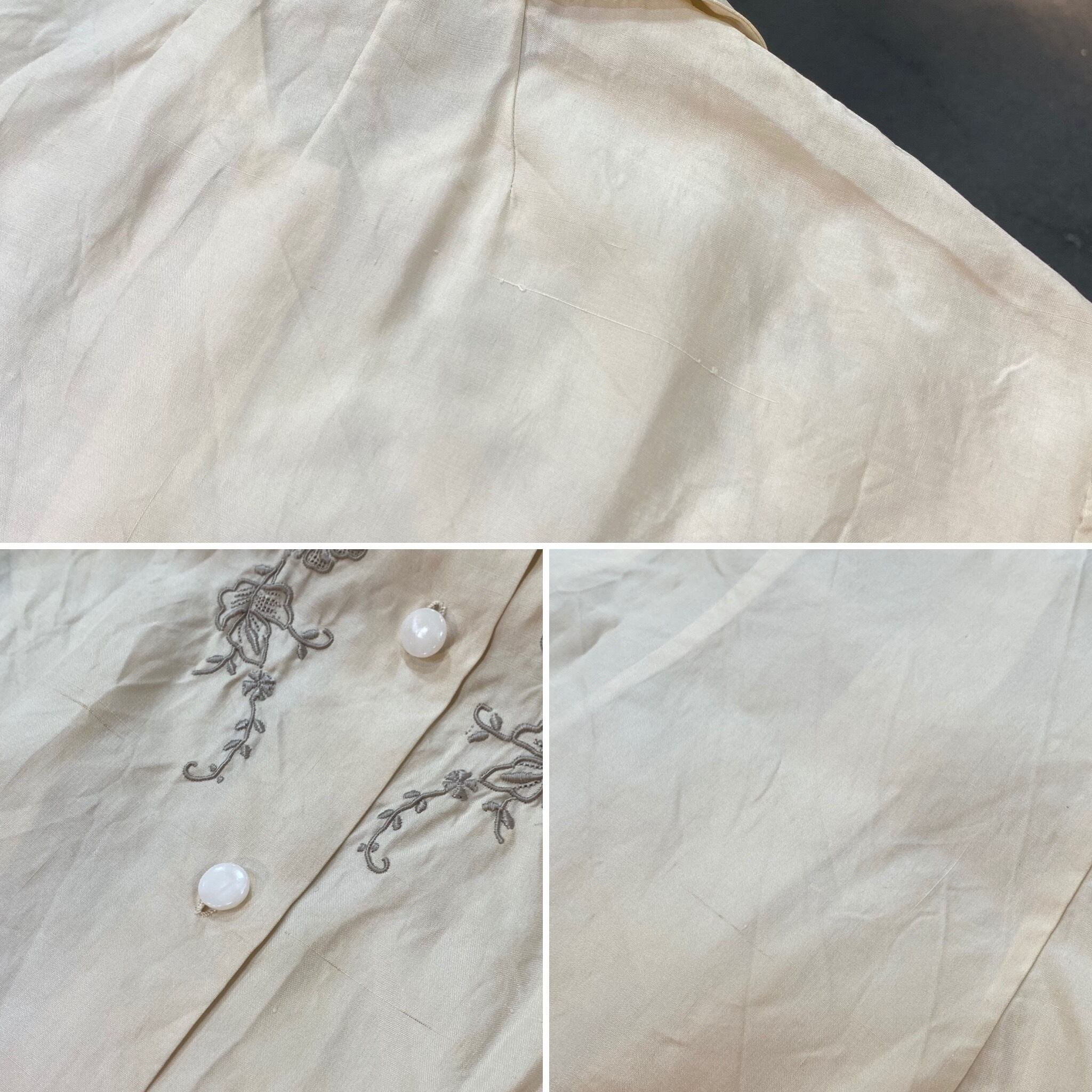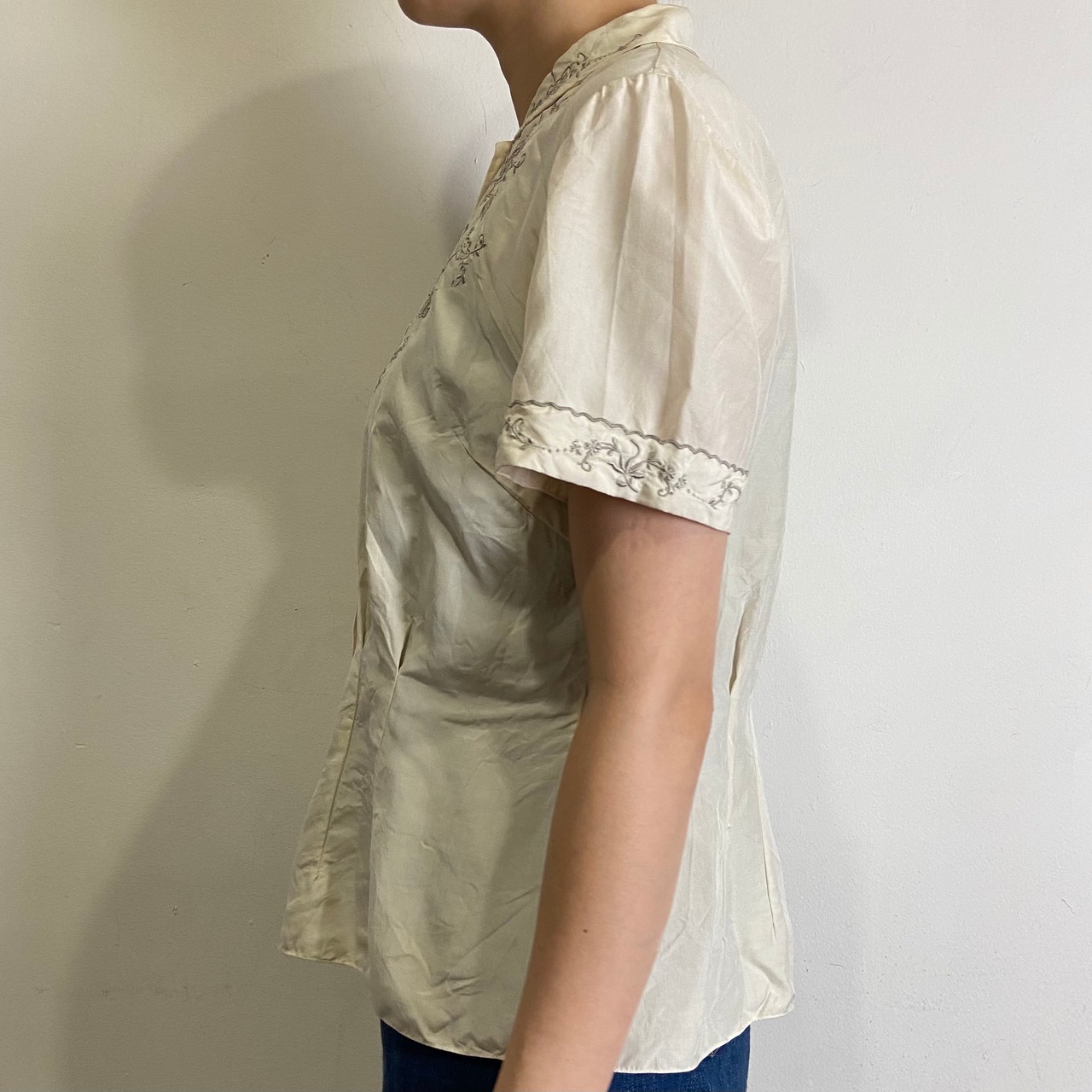 柔らかいシルクにベージュの糸で繊細な刺繍が施された、チャイナのシャツです。