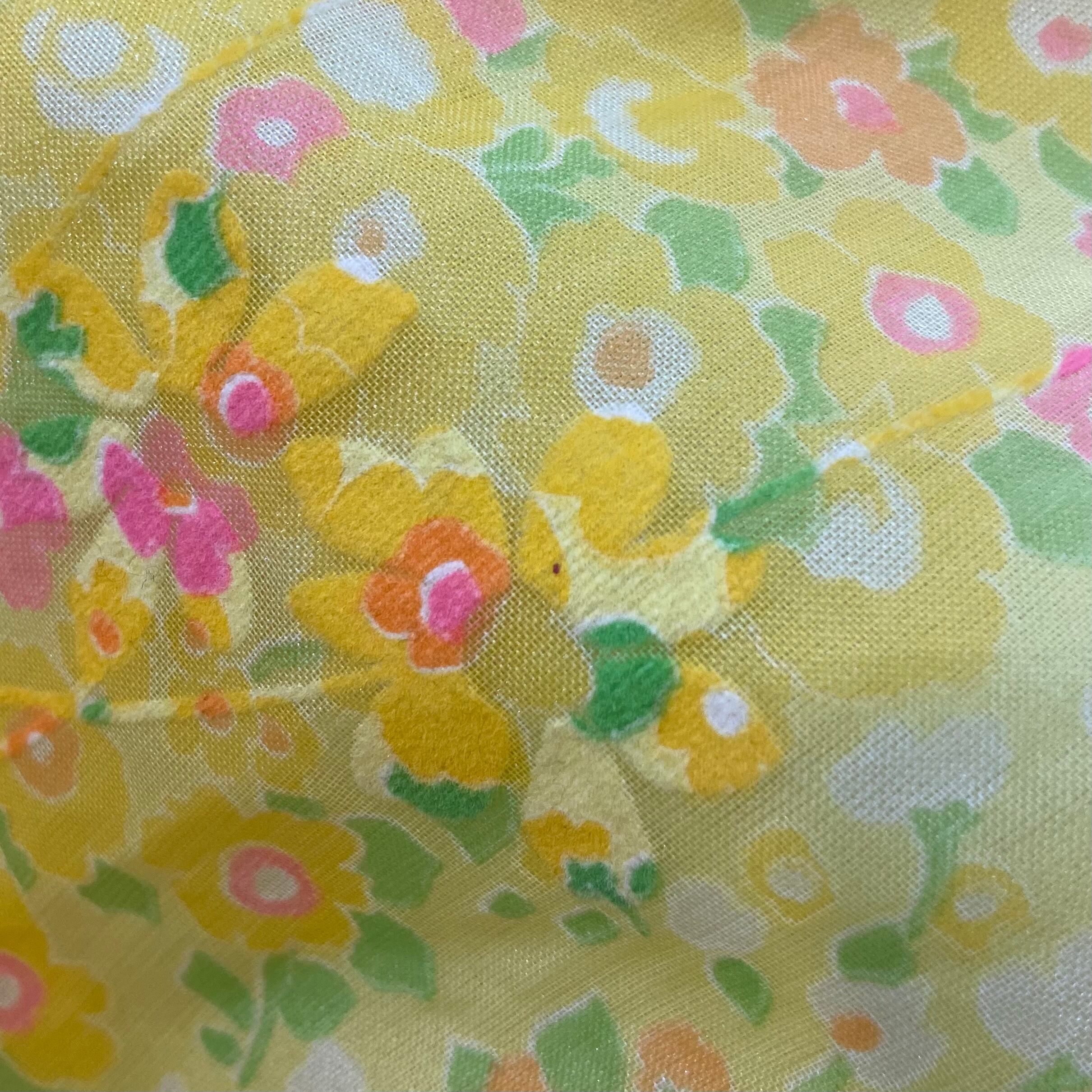 黄色にカラフルな小花柄がキュートで、首周りのフリルもポイントになっております。