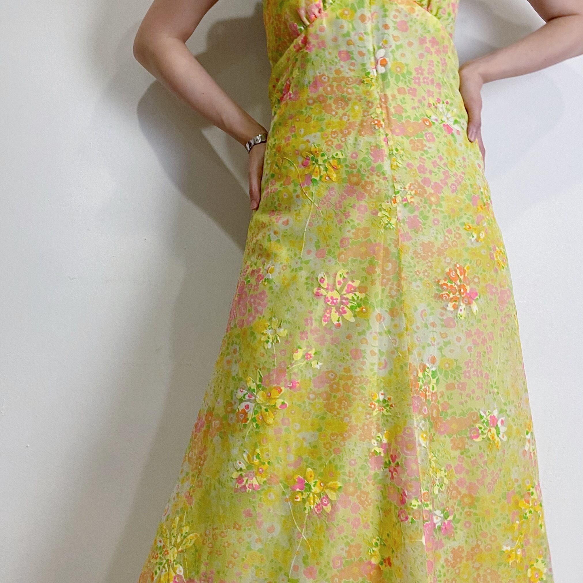 ハッピーな花柄が可愛い、70年代のホルターネックワンピースです。