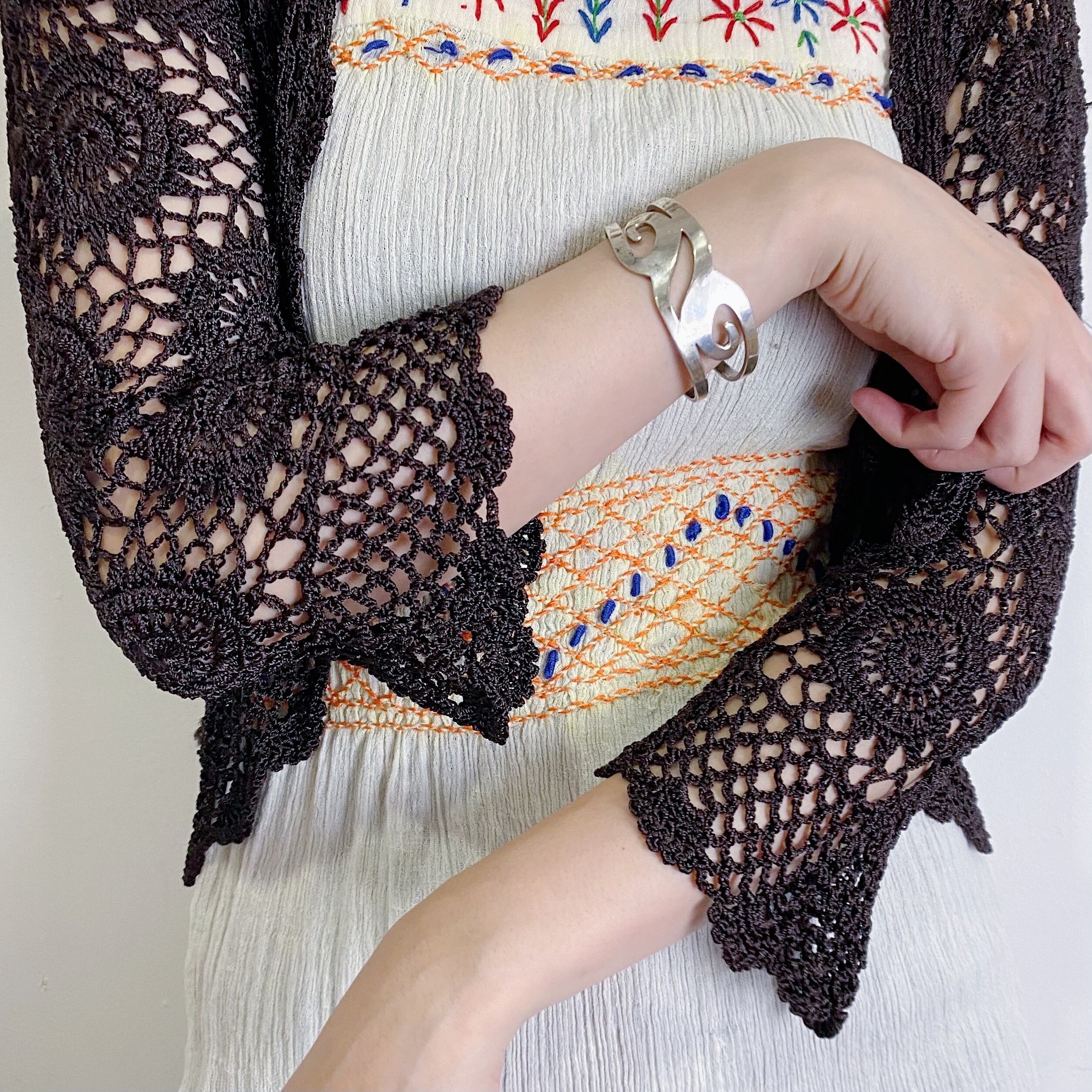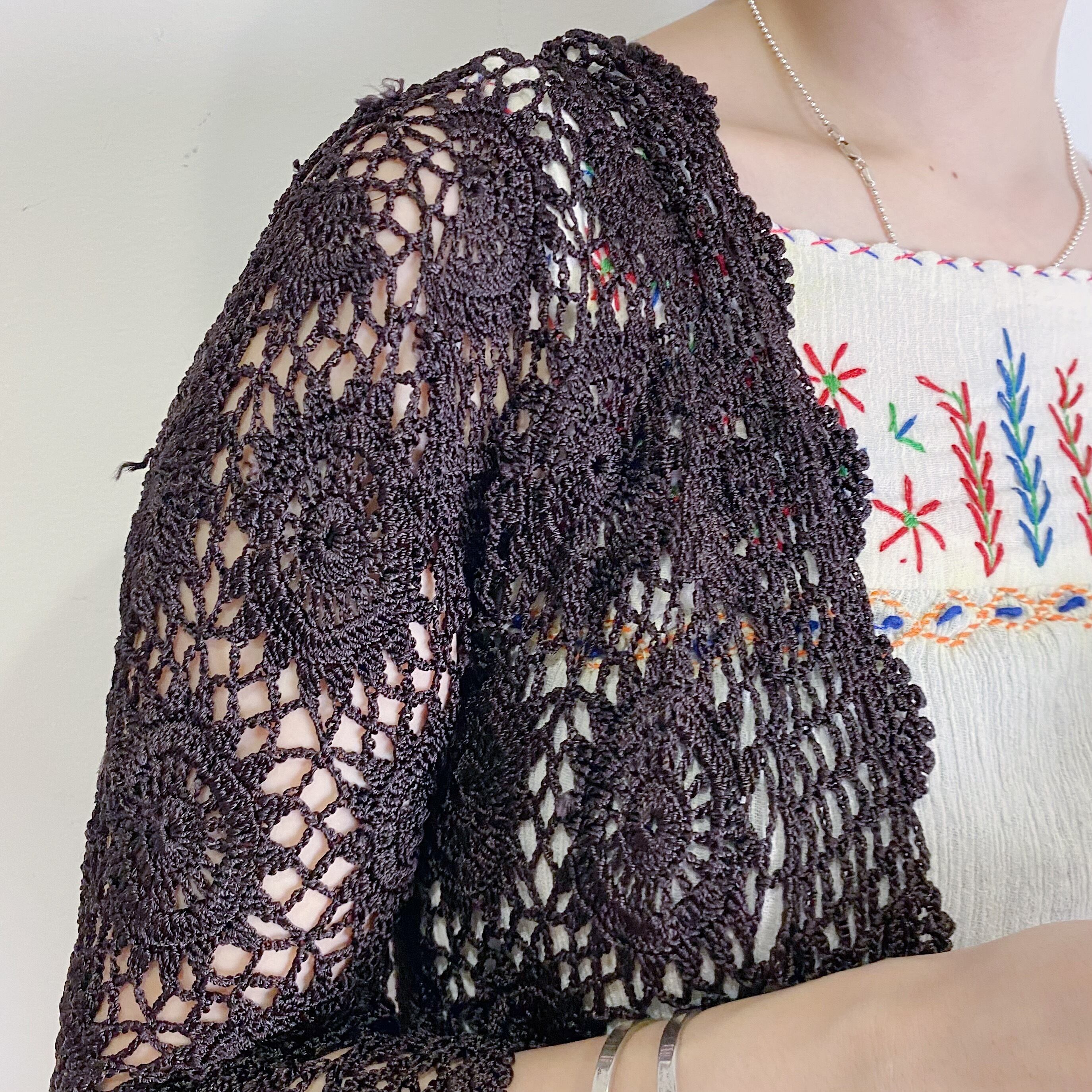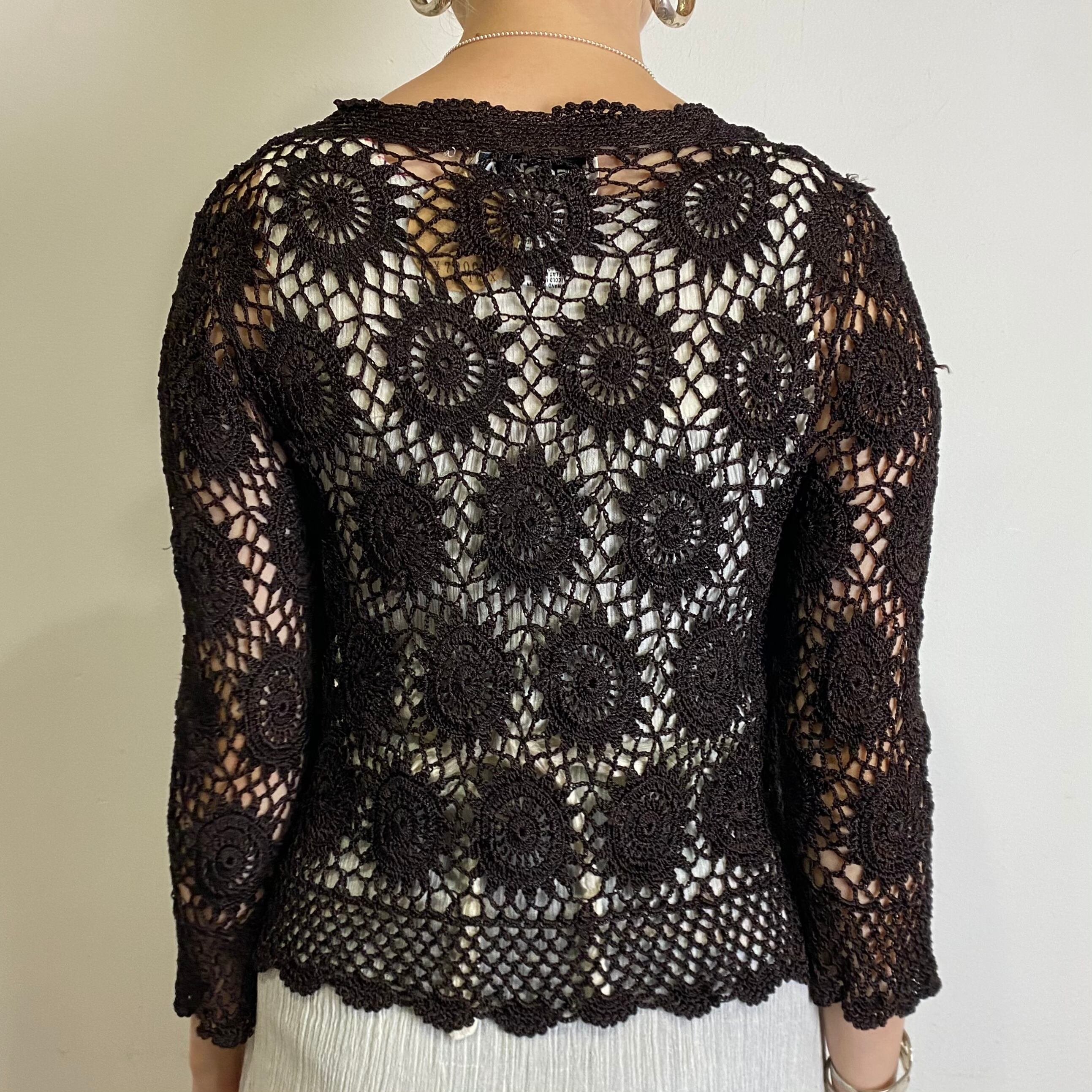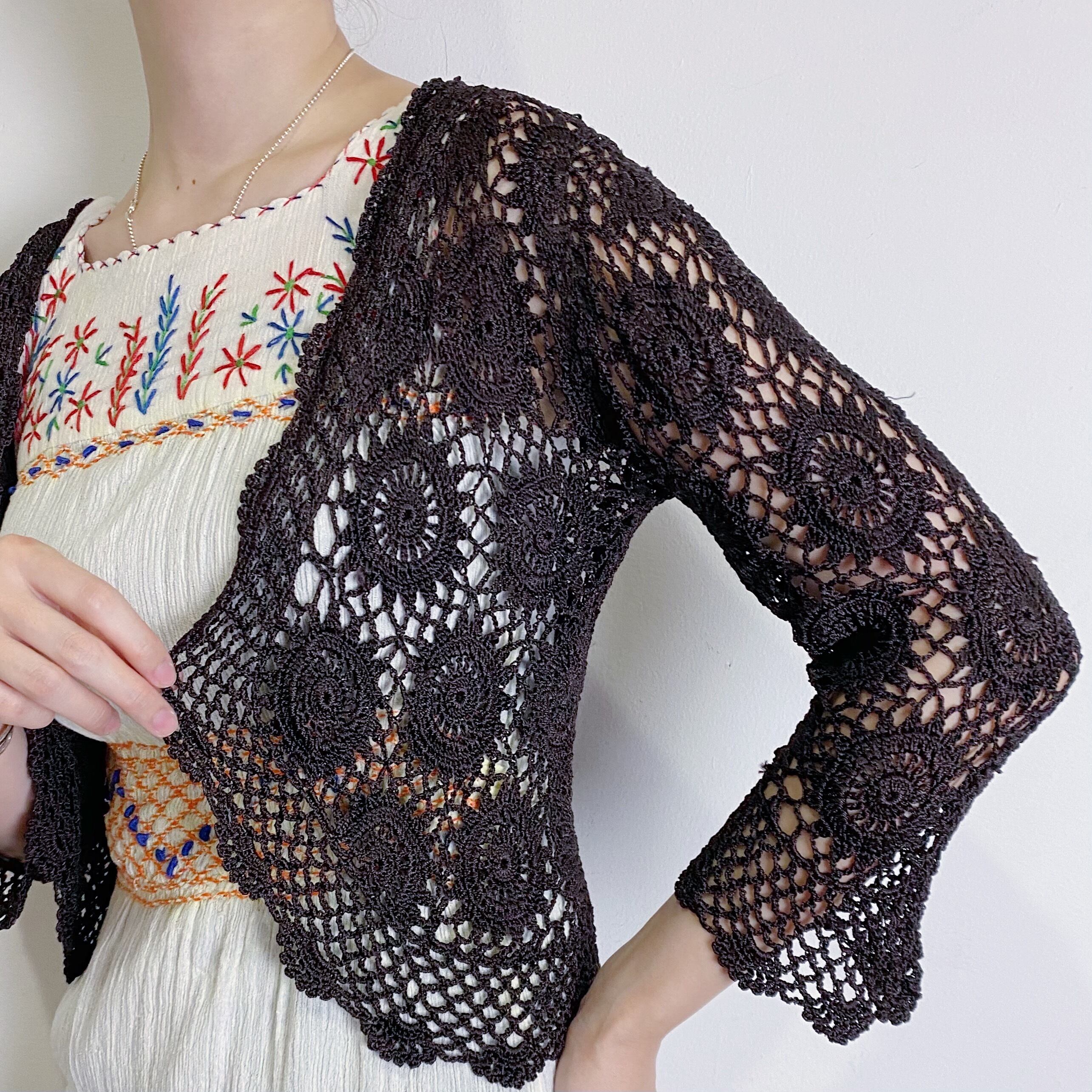 編み目が可愛い、焦げ茶色のクロシェニットカーディガンです。