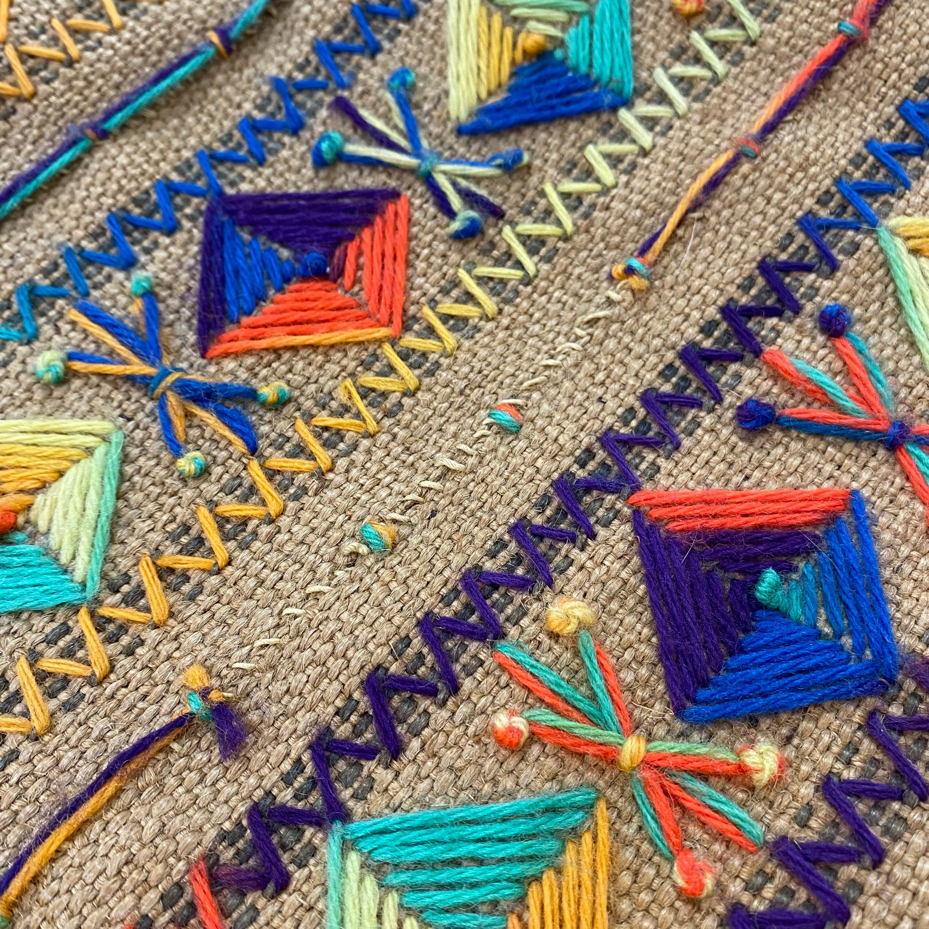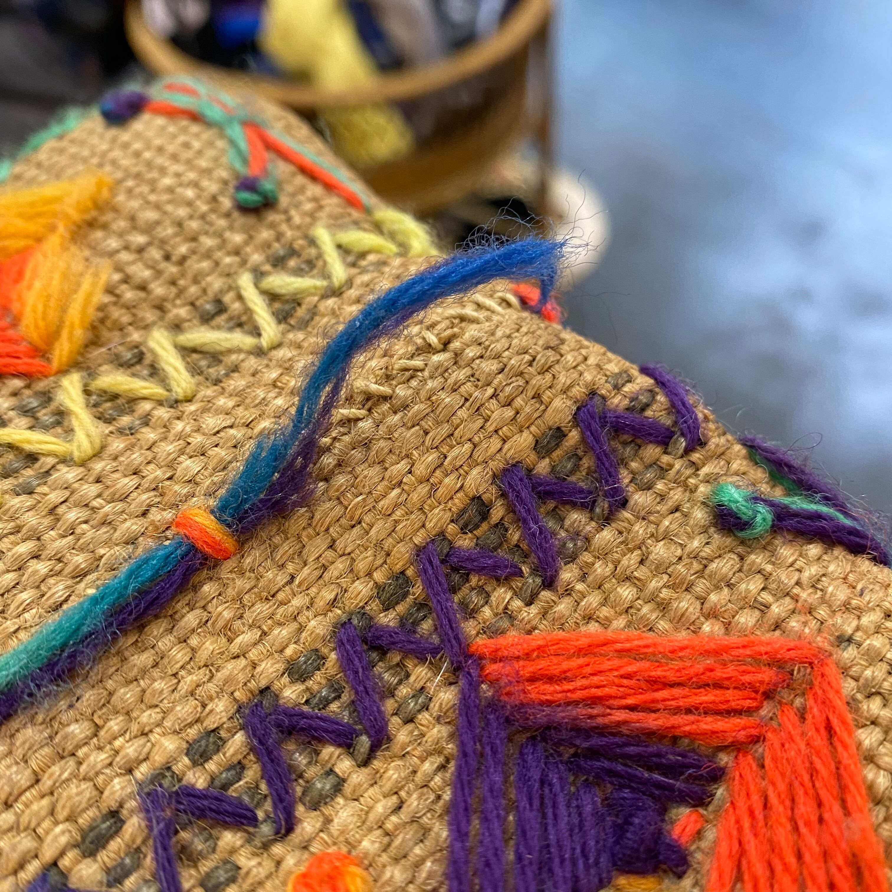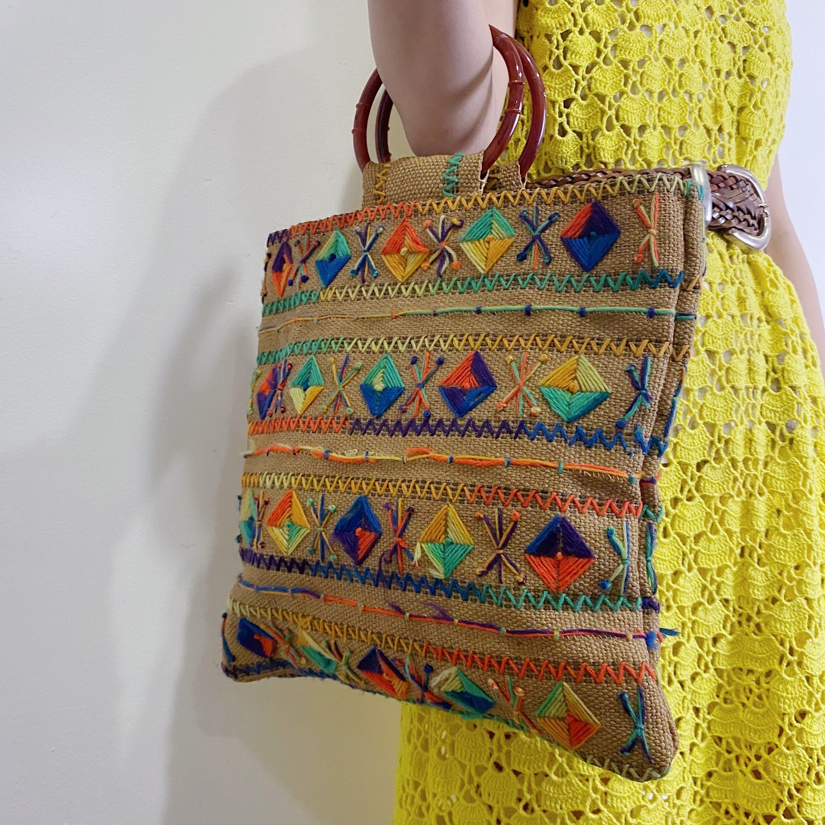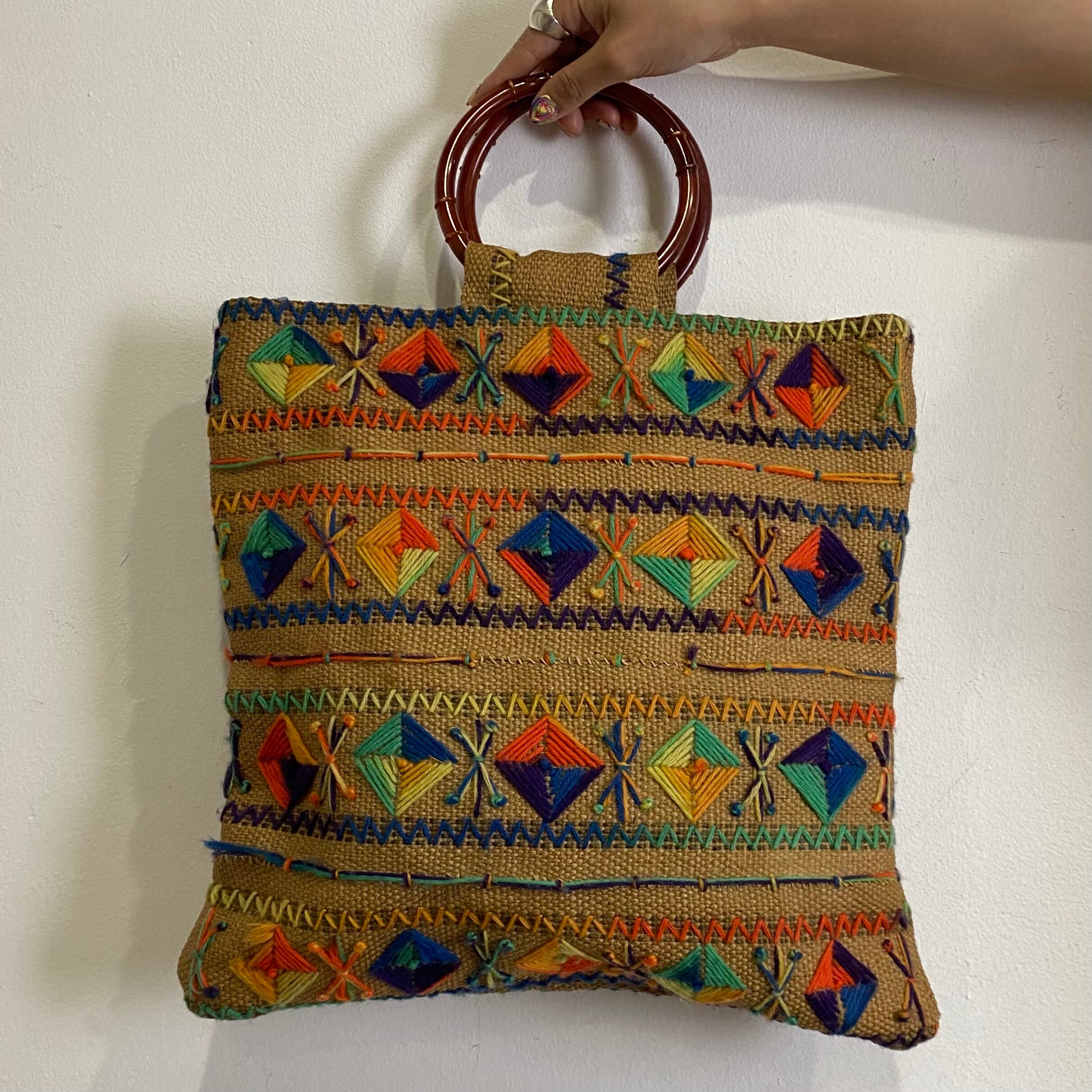 麻のような素材にハンド刺繍が可愛い、70年代のハンドバッグです。