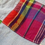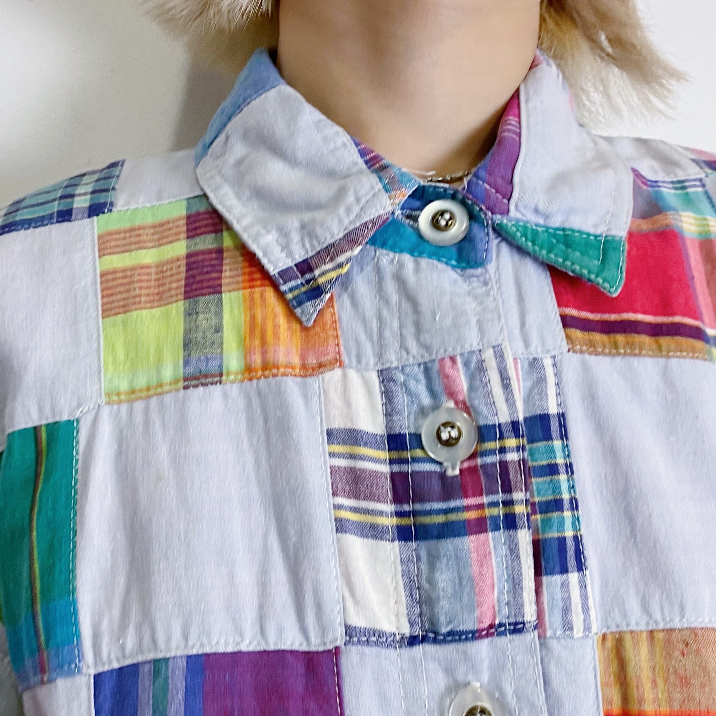 シャンブレー素材とかカラフルな布地が可愛い、パッチワークワンピースです。
