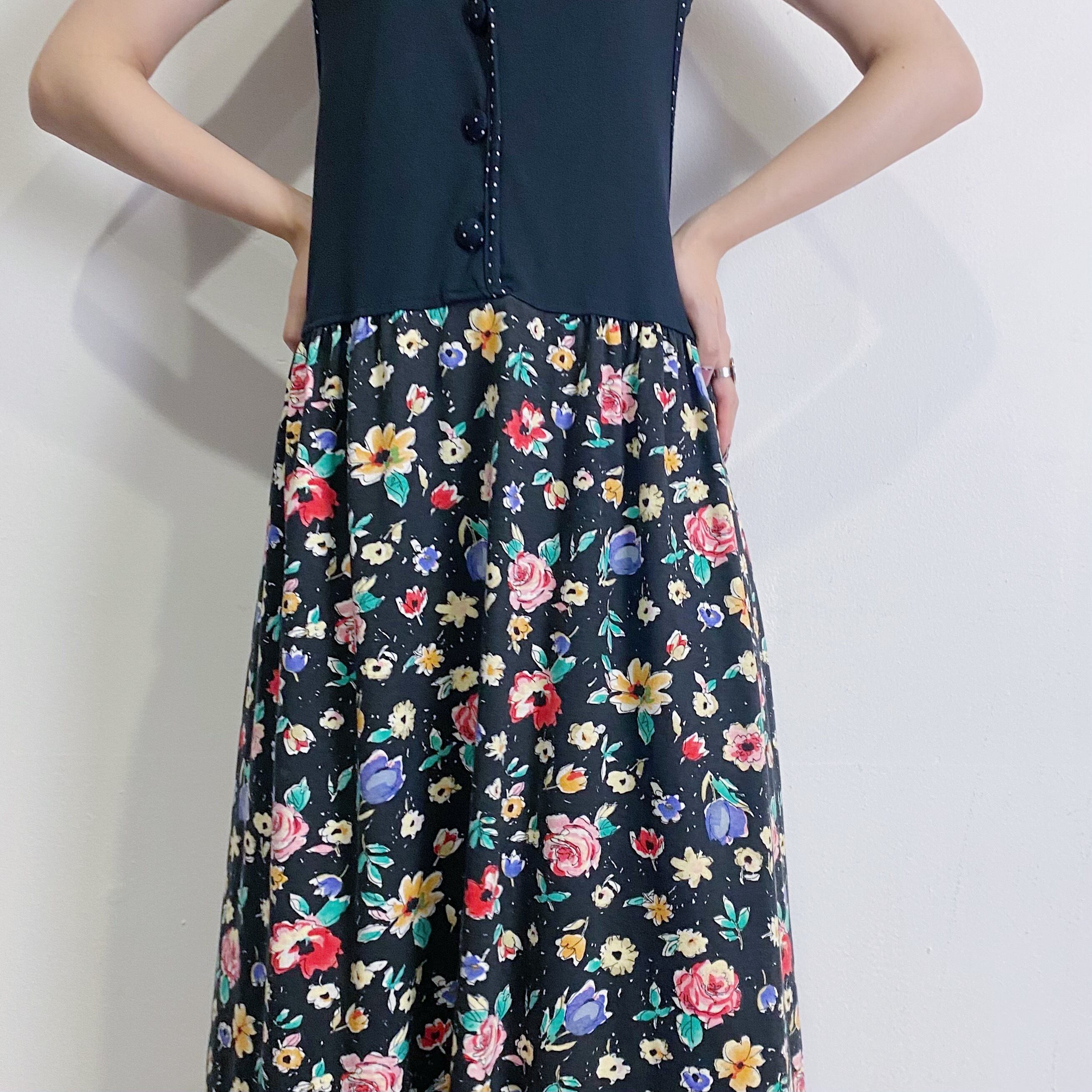 カットソー生地に黒ベースの楽しい花柄がキュートな80年代ワンピースです。