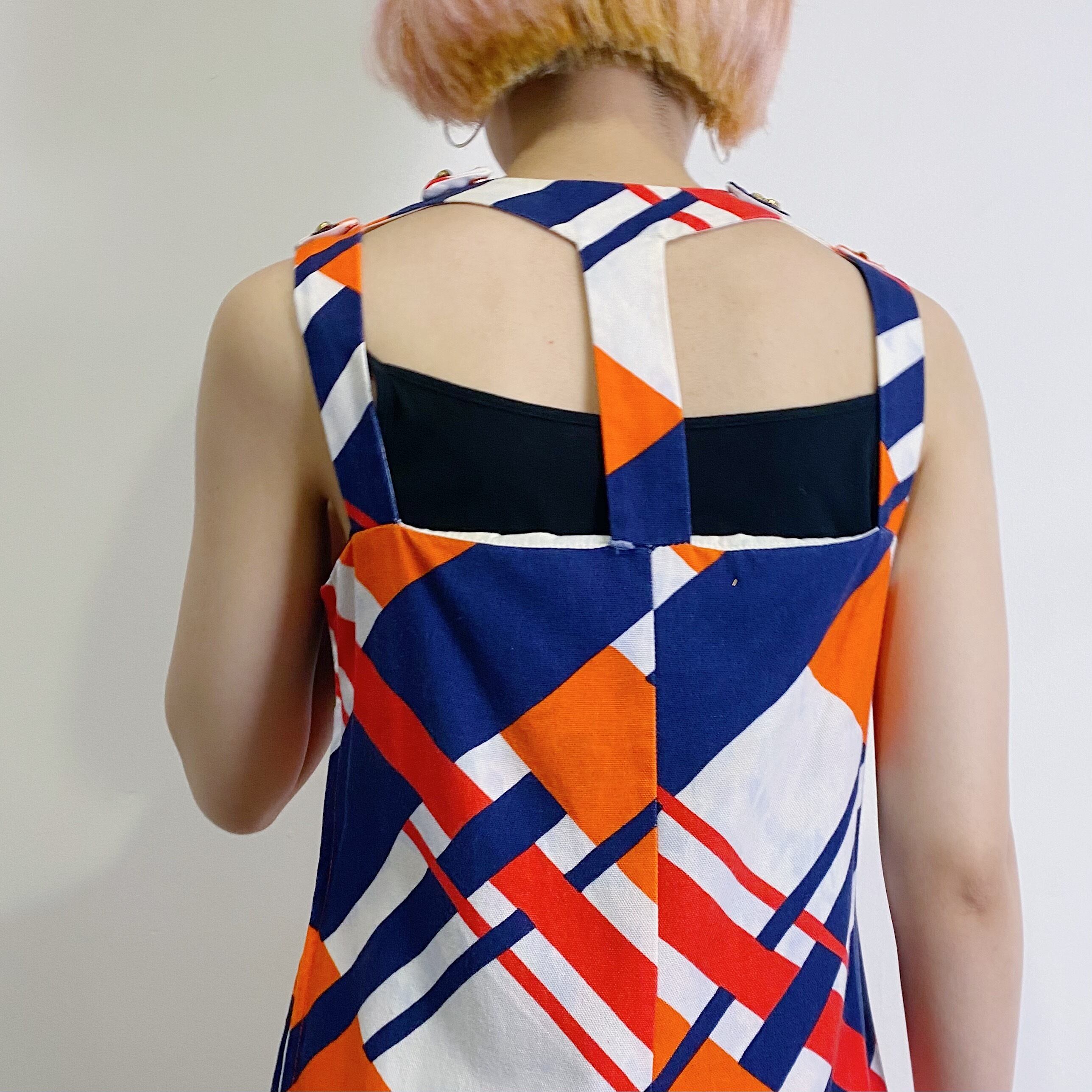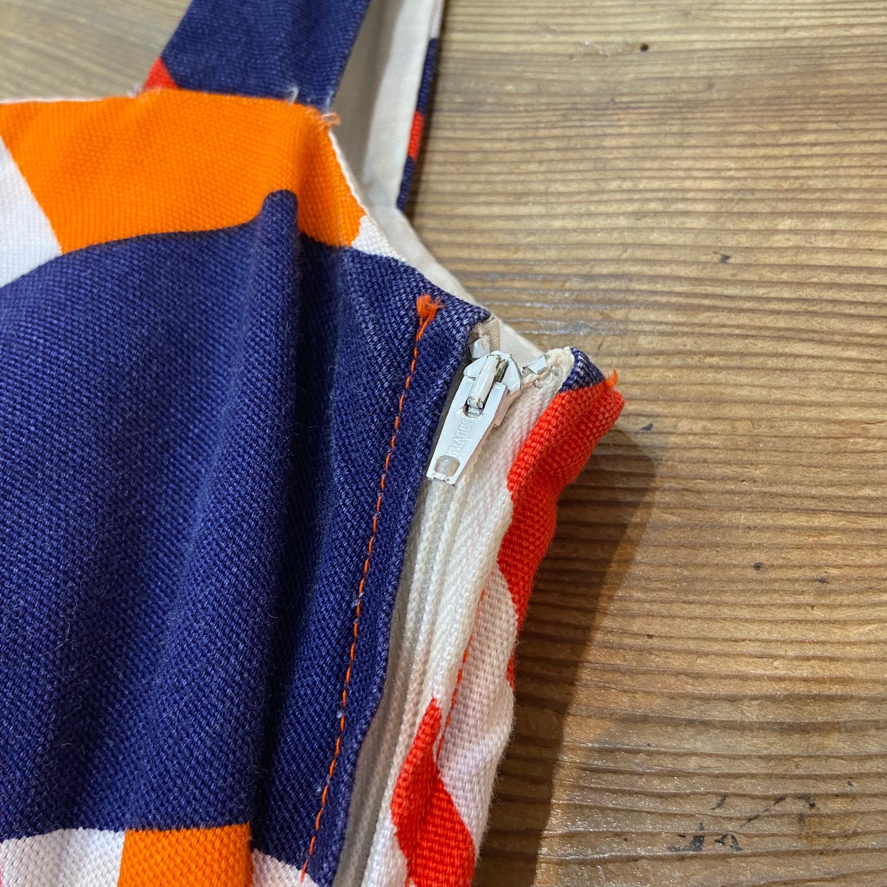 オレンジとネイビーの配色がキュートで、綺麗なAラインでスタイル良く着て頂けます。