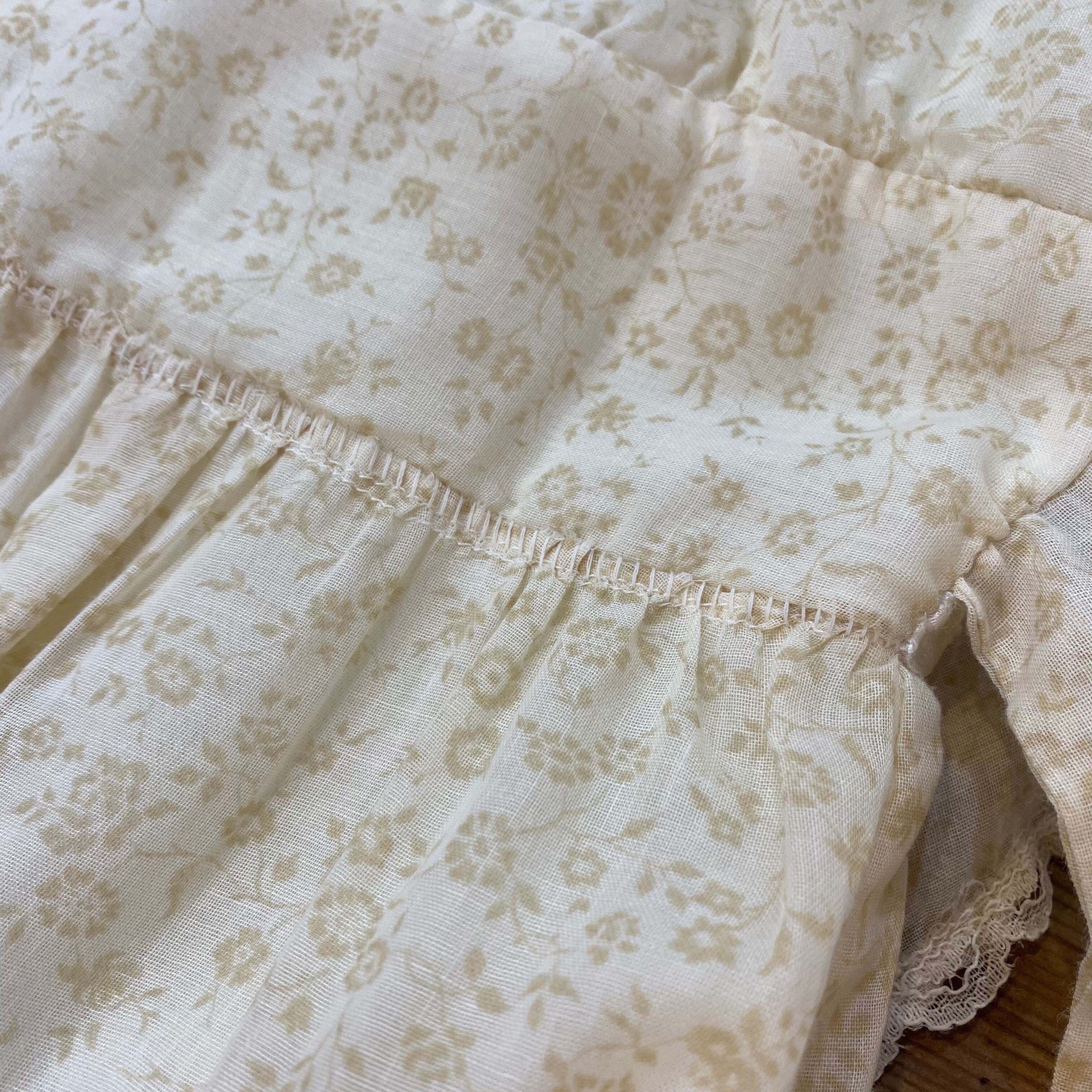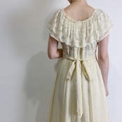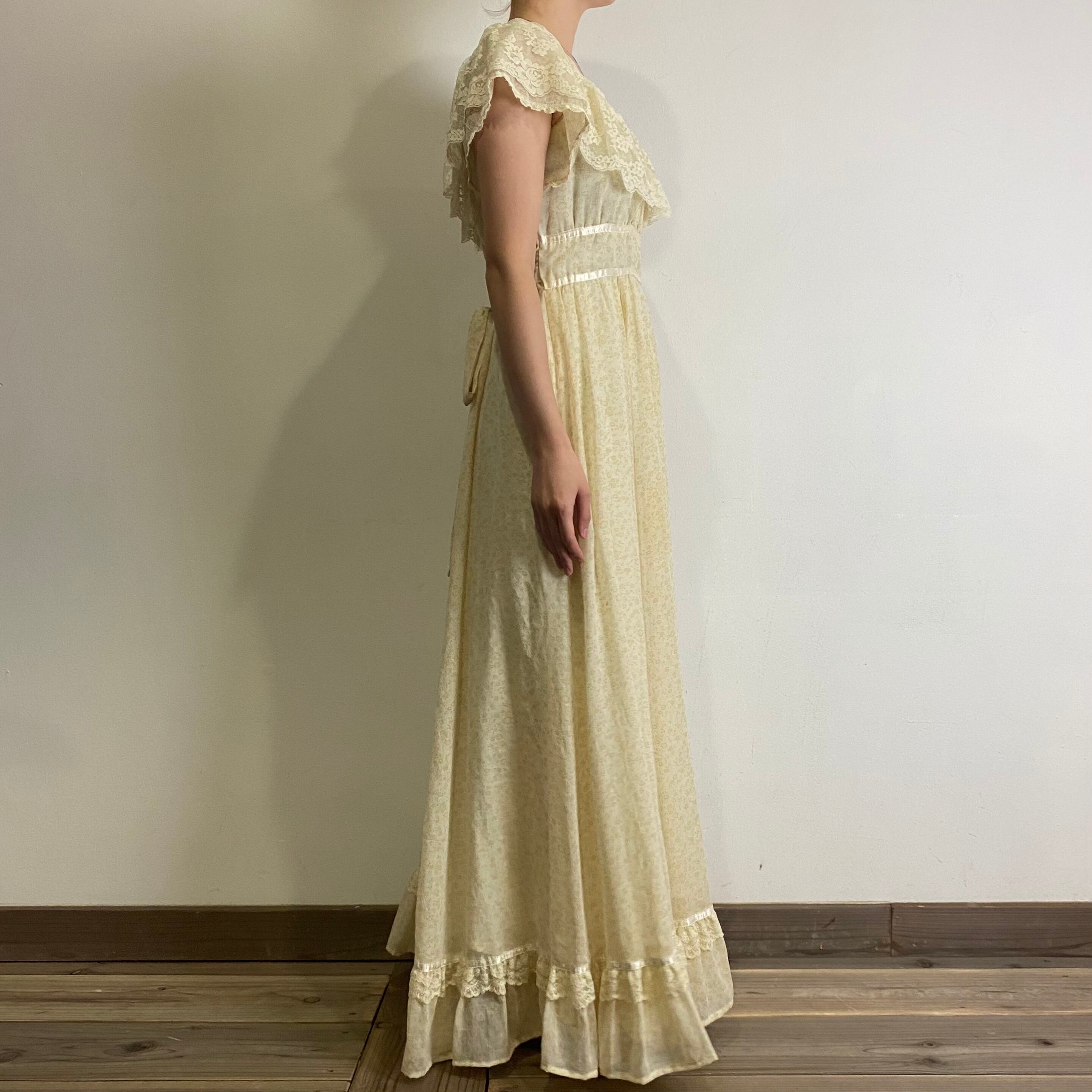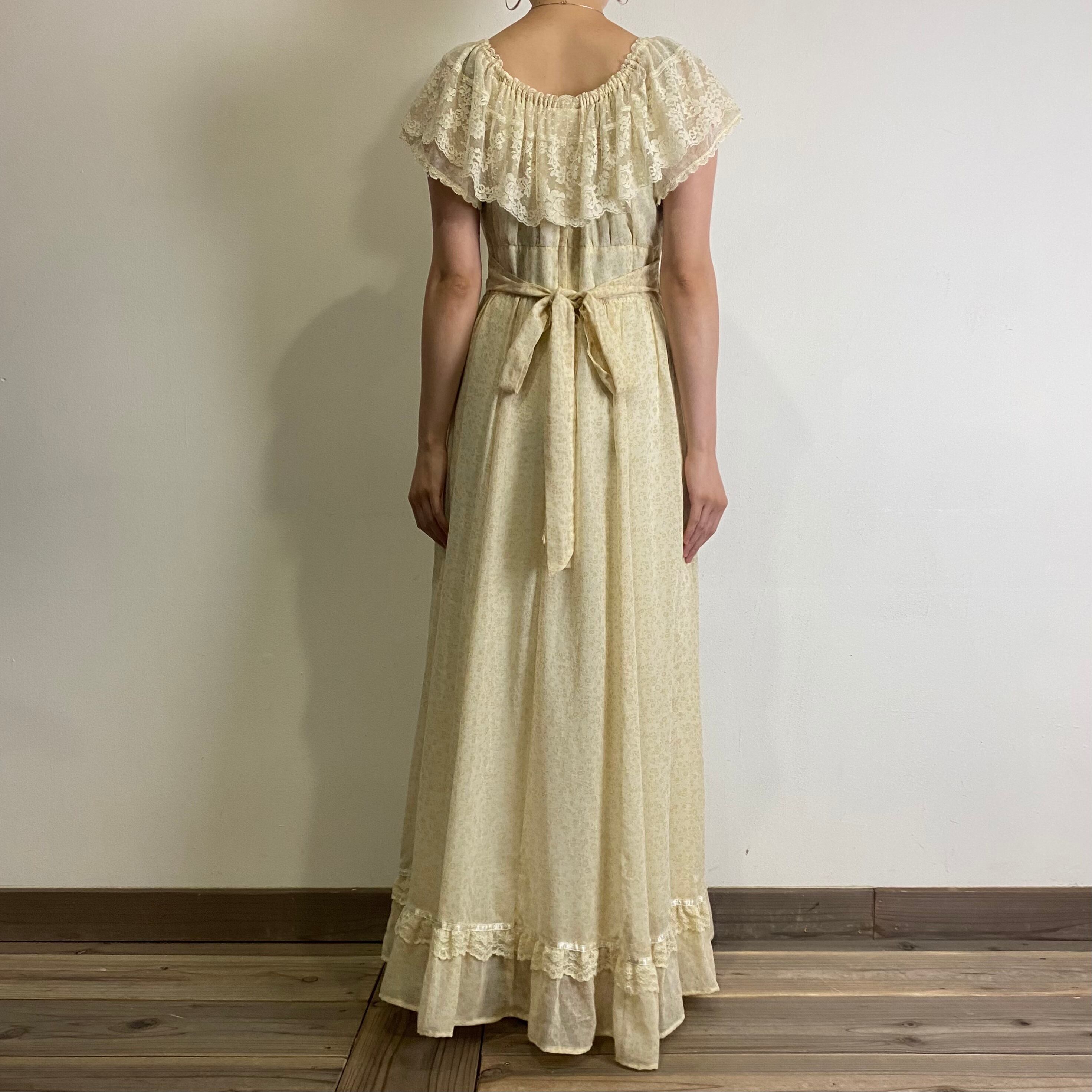優しい色合いにロマンティックなレースが可愛い70年代のGUNNESAXのワンピースです。