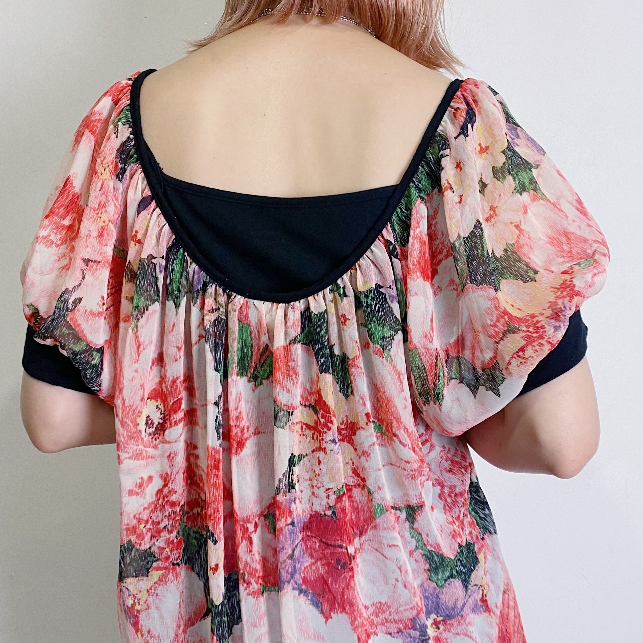 ハイビスカスのようなお花が転写プリントされた、70年代のトップスです。