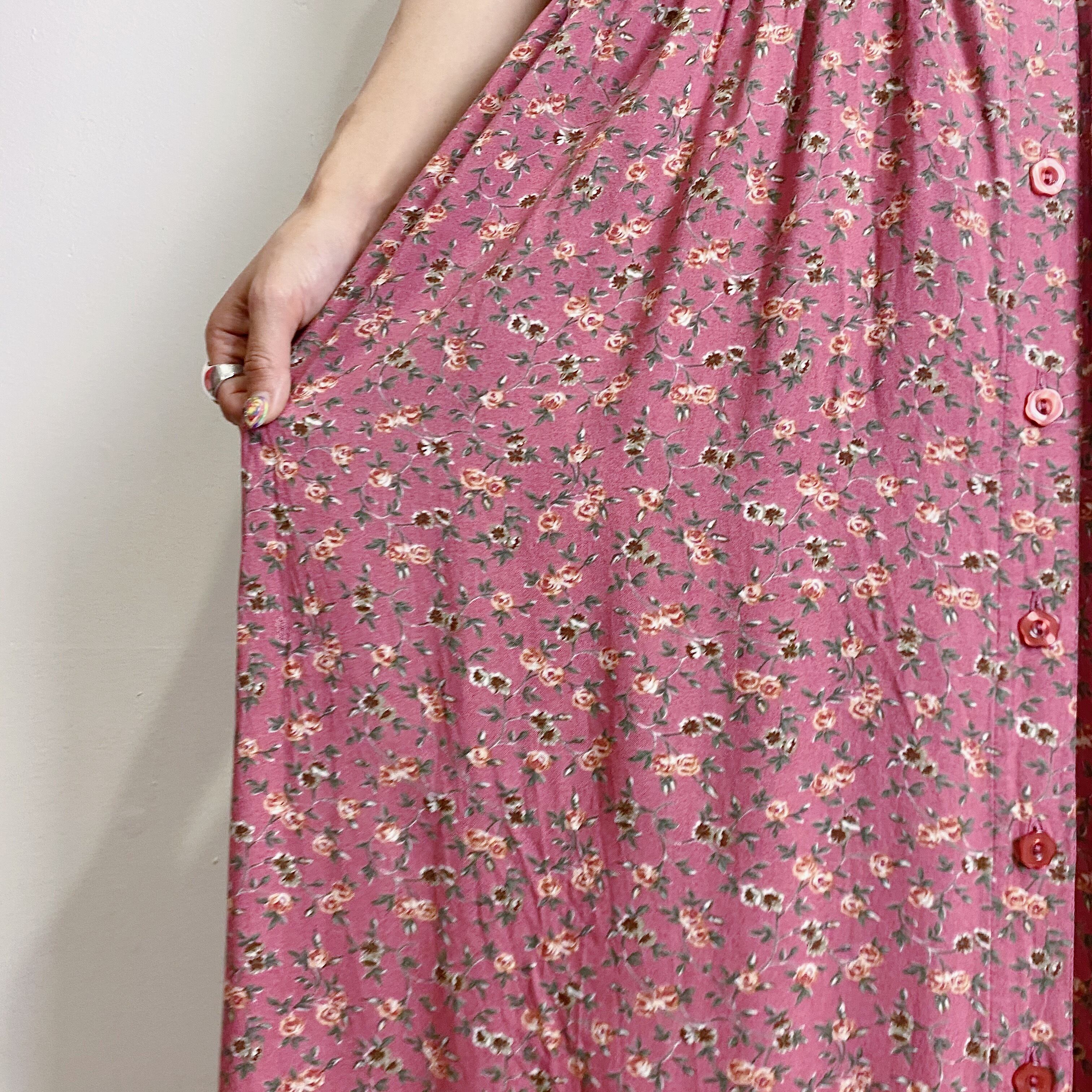 ちょっぴりスモーキーなピンクカラーに花柄が可愛いレーヨンワンピースです。