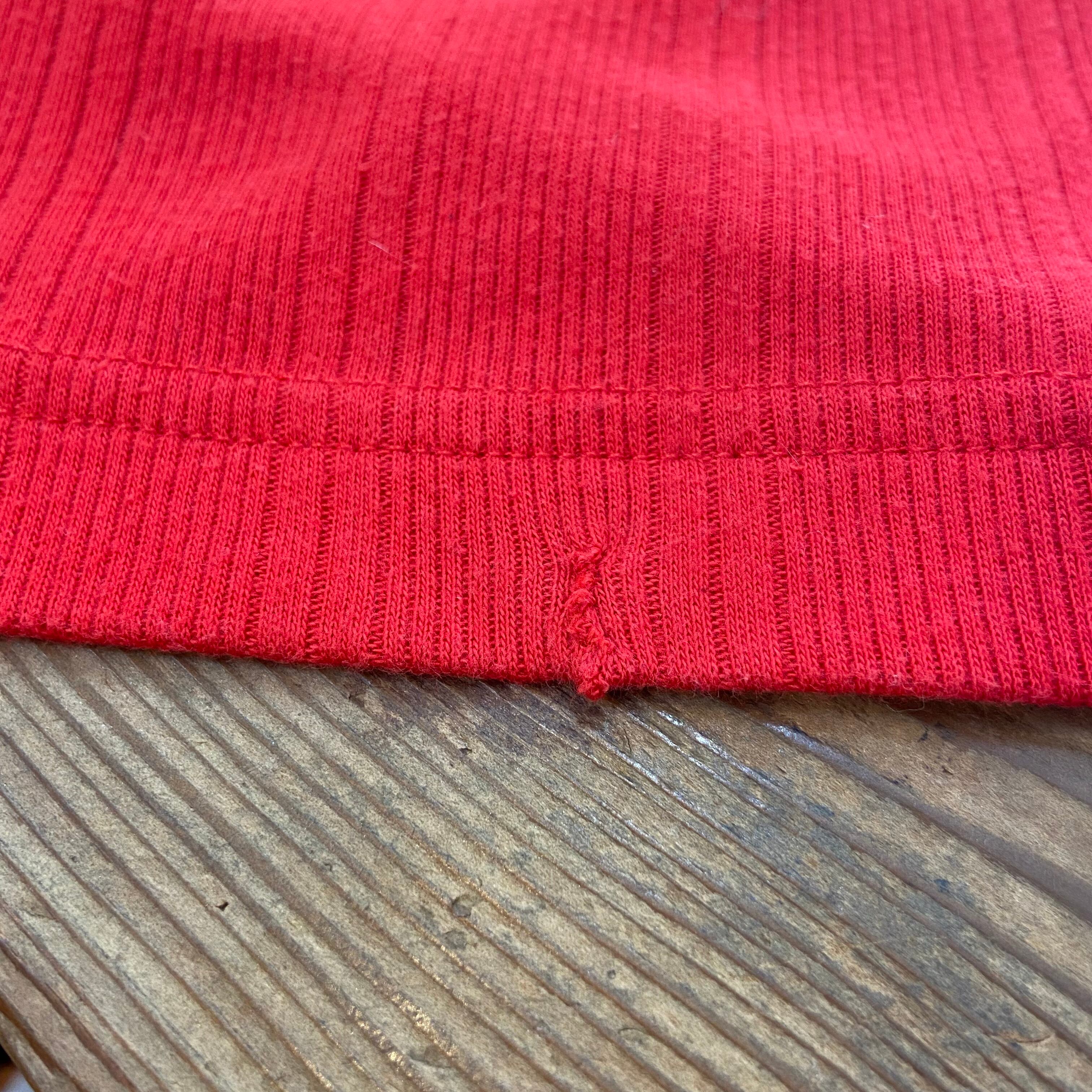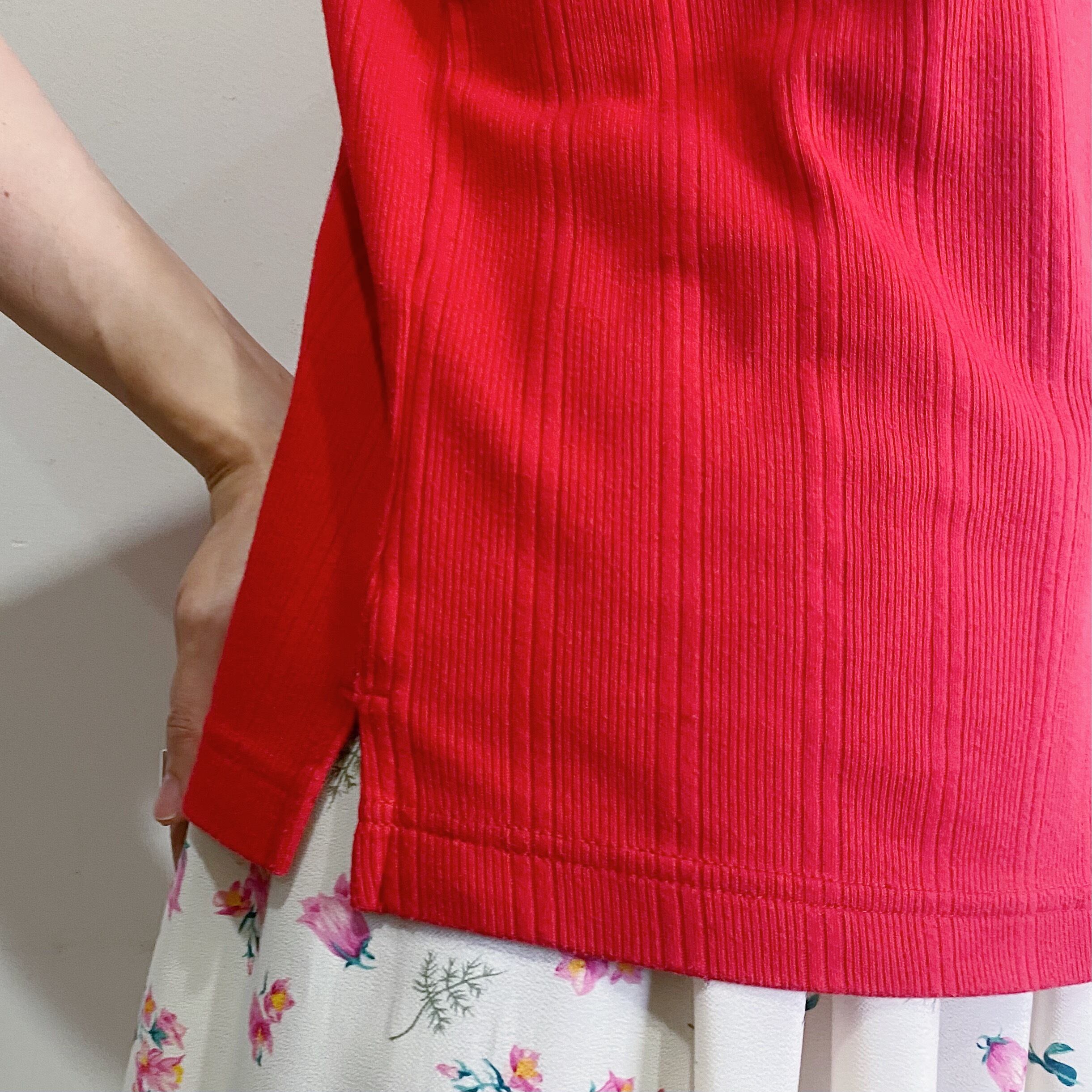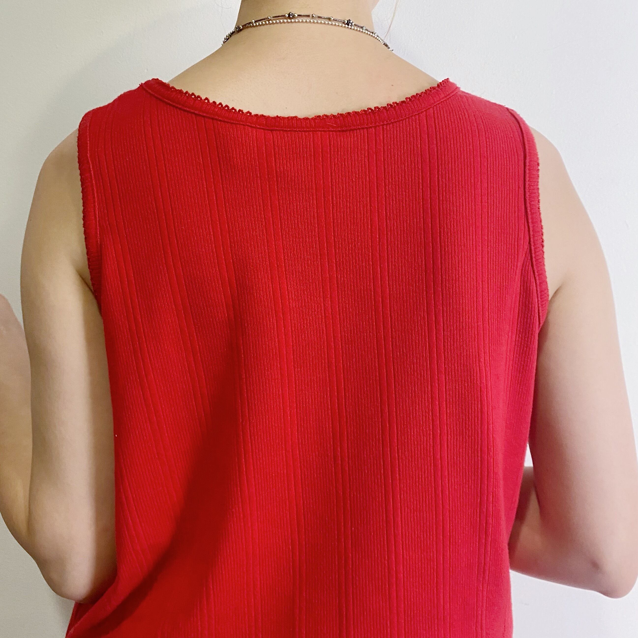 アクセントになるレッドカラーにリブ素材が可愛いノースリーブトップスです。