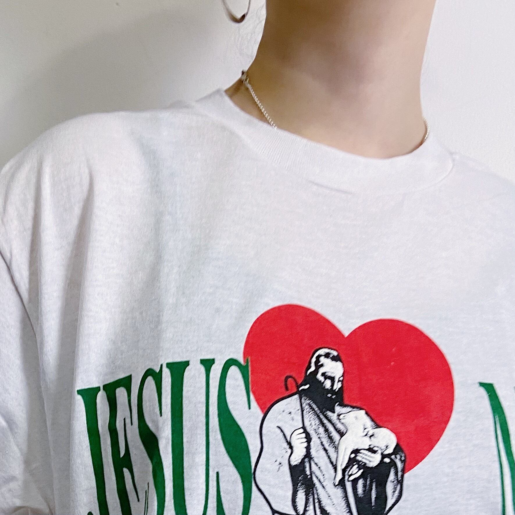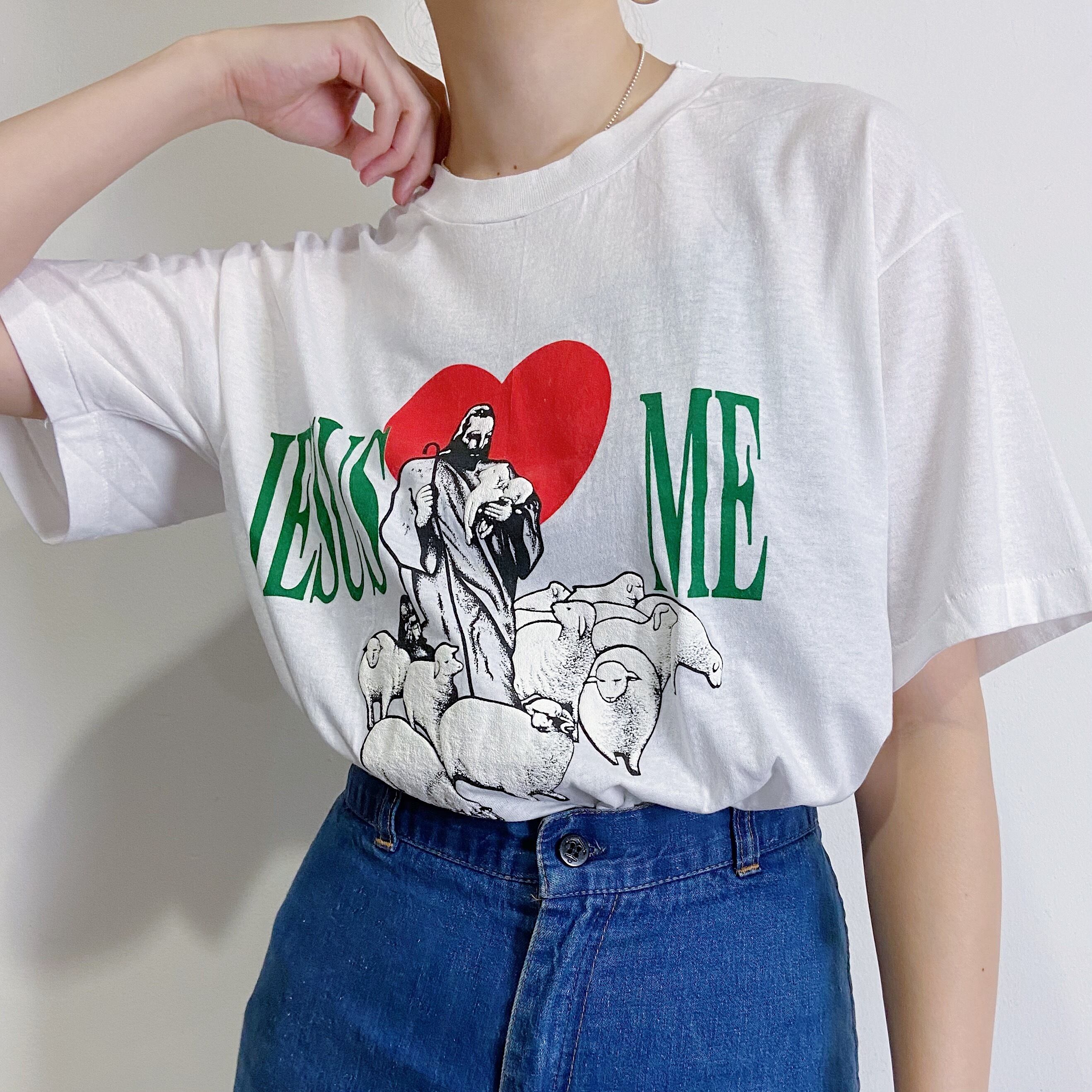 白ボディにハートとジーザスプリントが可愛いTシャツです。