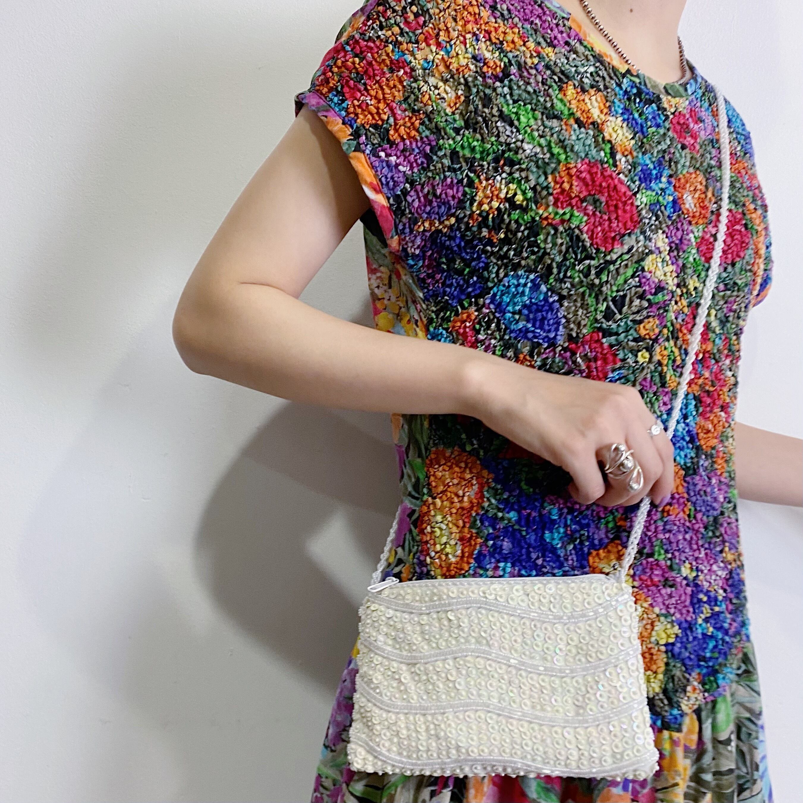 白ベースに白いビーズやスパンコールが可愛い80年代のミニポシェットです。