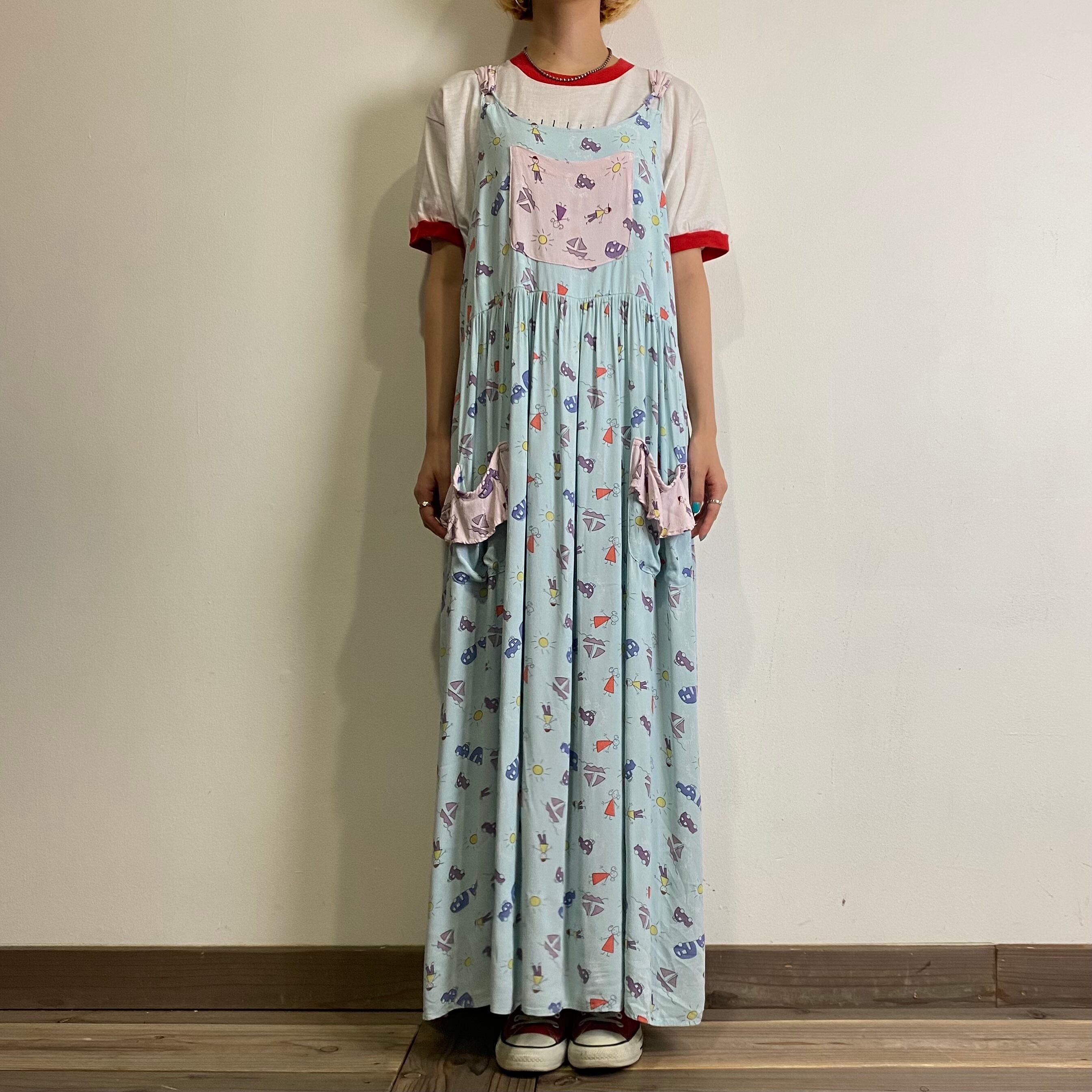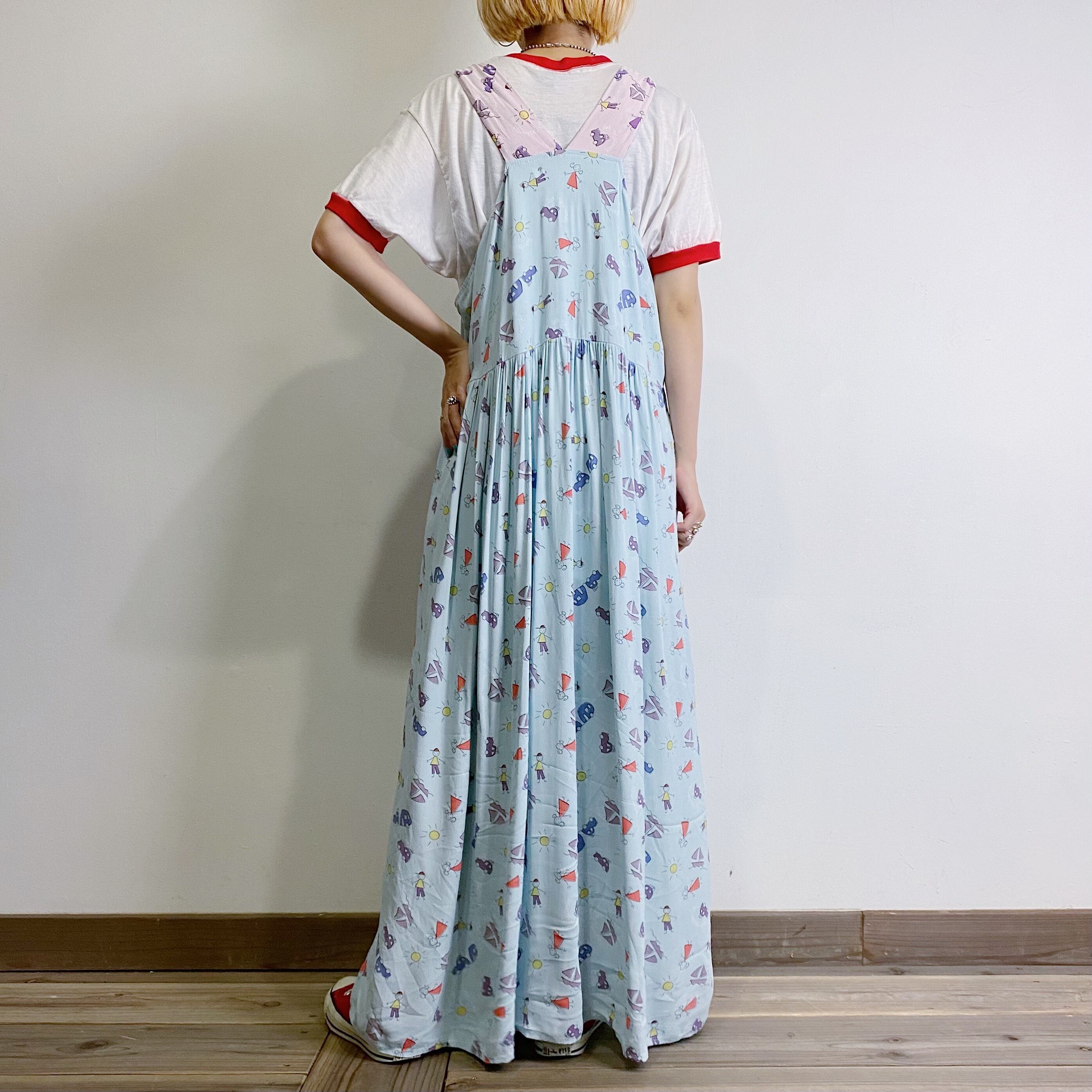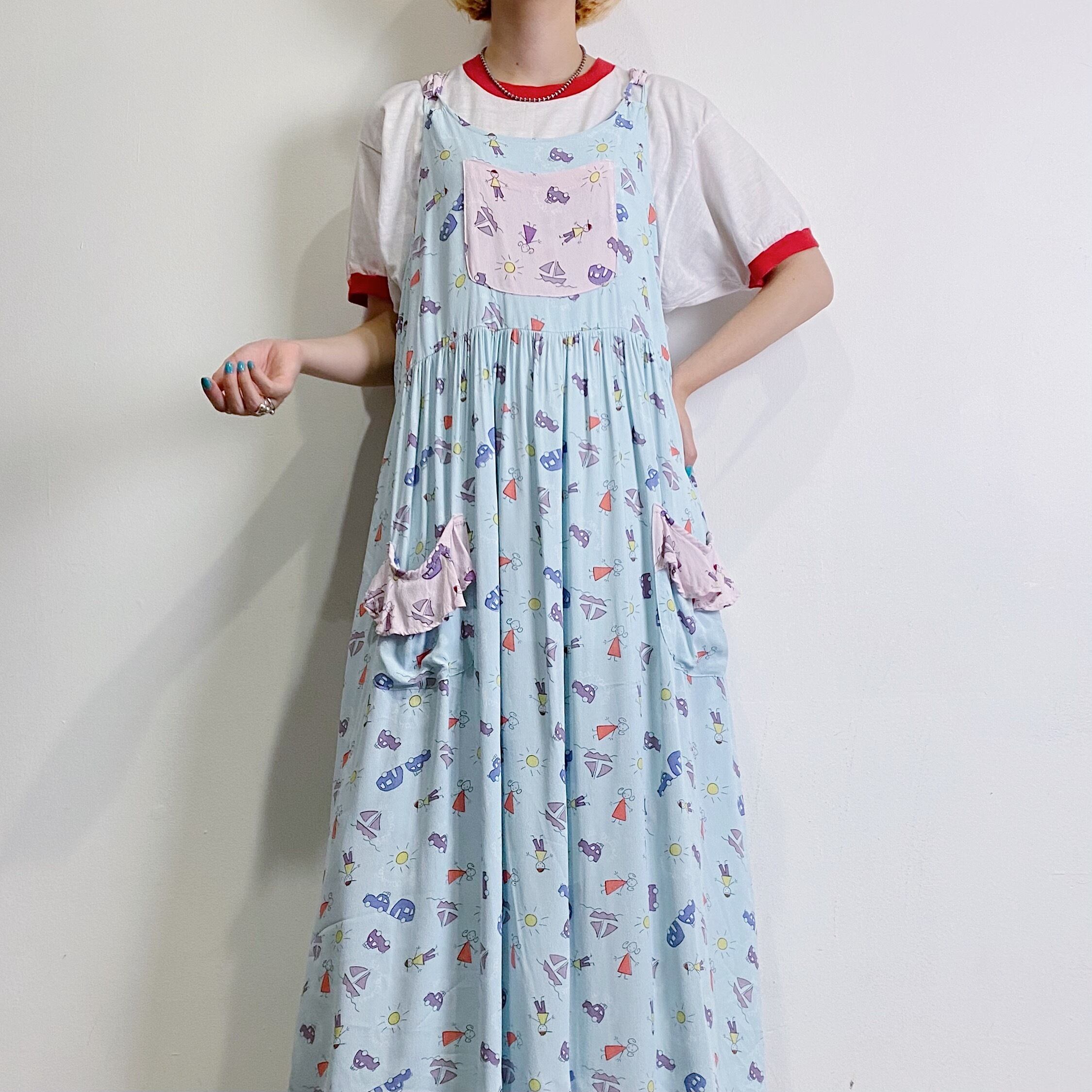 子供の落書きのような、車や人、太陽などが総柄になったユニークなジャンパーワンピースです。