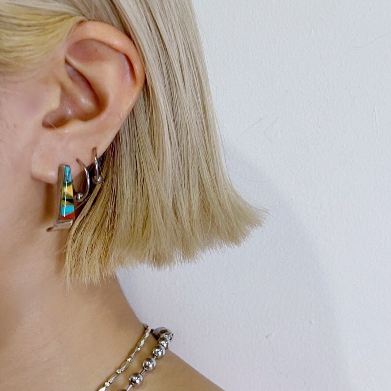 ターコイズやコーラル、その他さまざまなストーンがインレイ技法ではめ込まれた、可愛いズニ族のインディアンジュエリーです。
