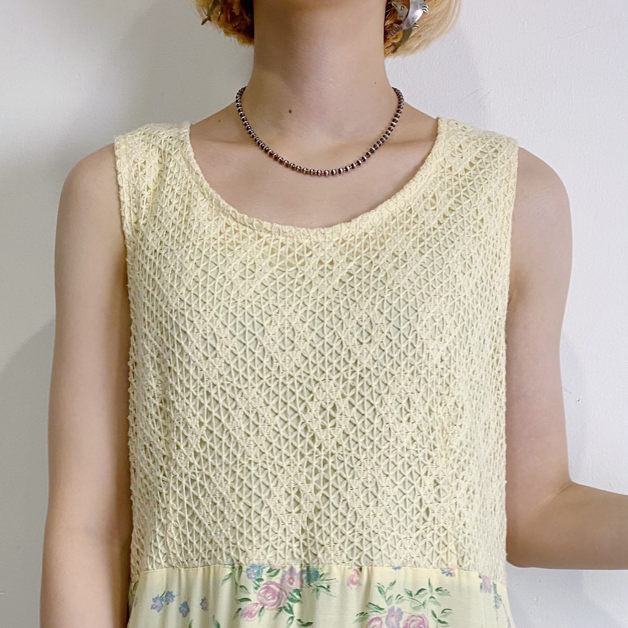 上半身がクロシェになった、レモンイエローが可愛いレーヨンワンピースです。