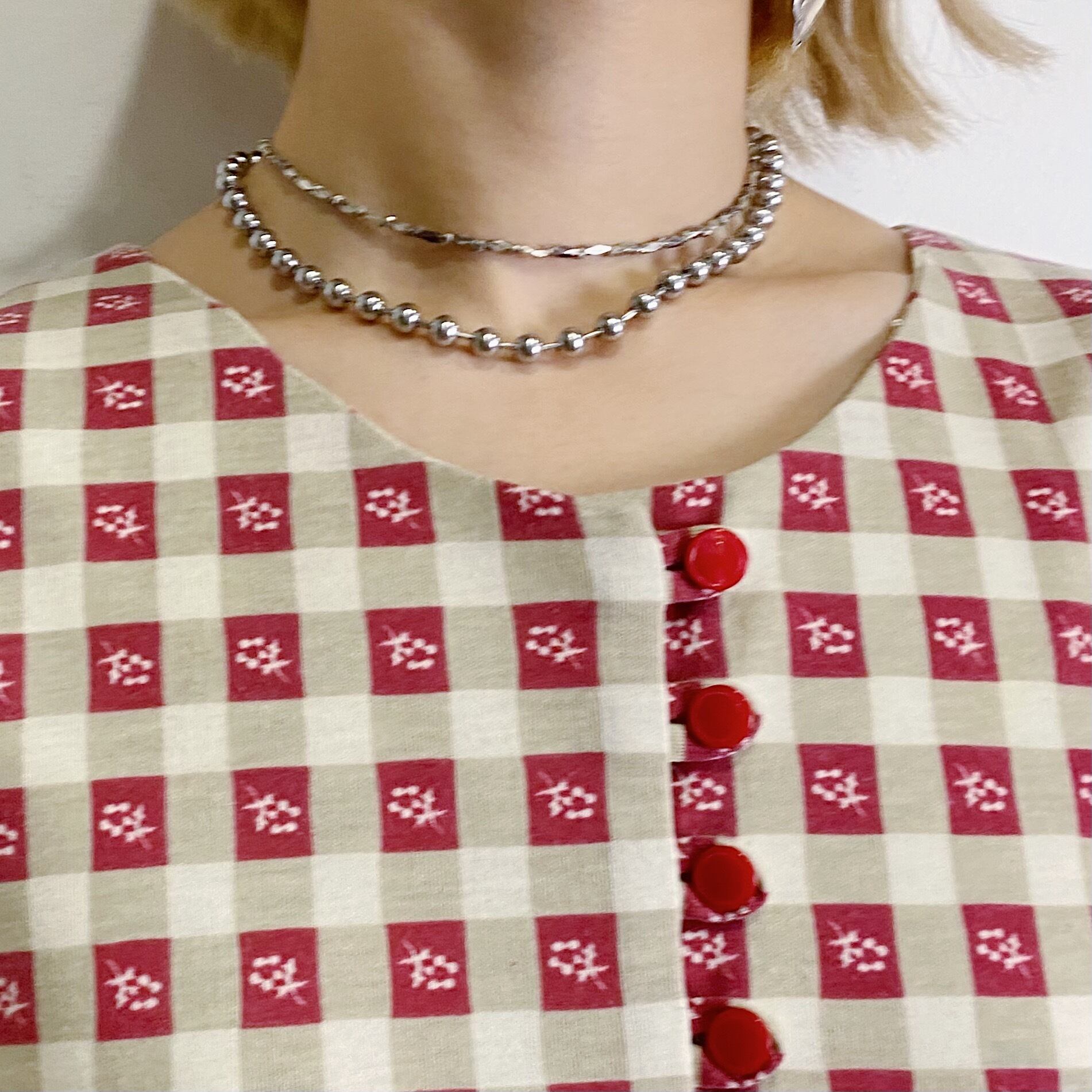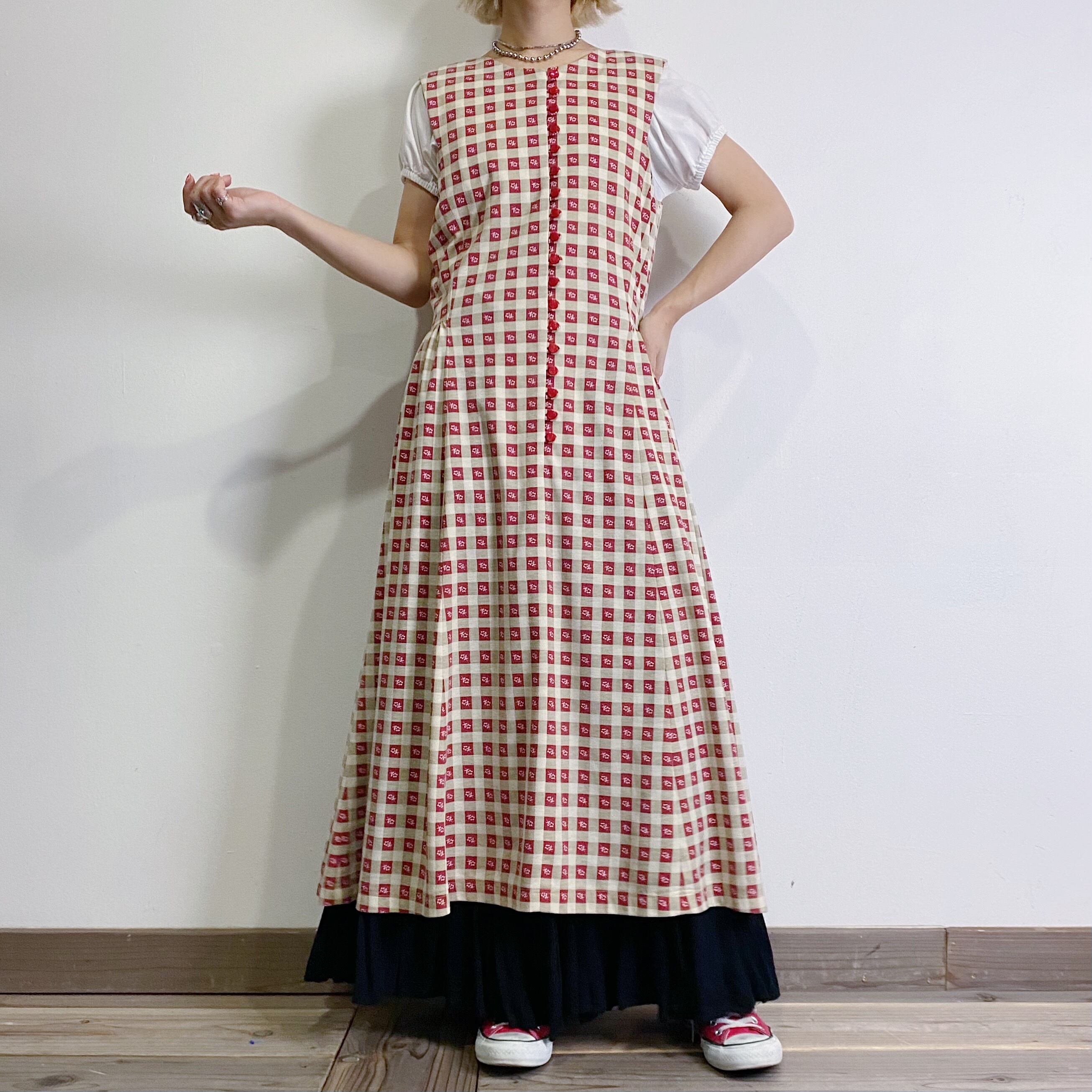 チェックとお花の組み合わせがキュートな一枚で、フロントに沢山並んだボタンも良いアクセントになっております。