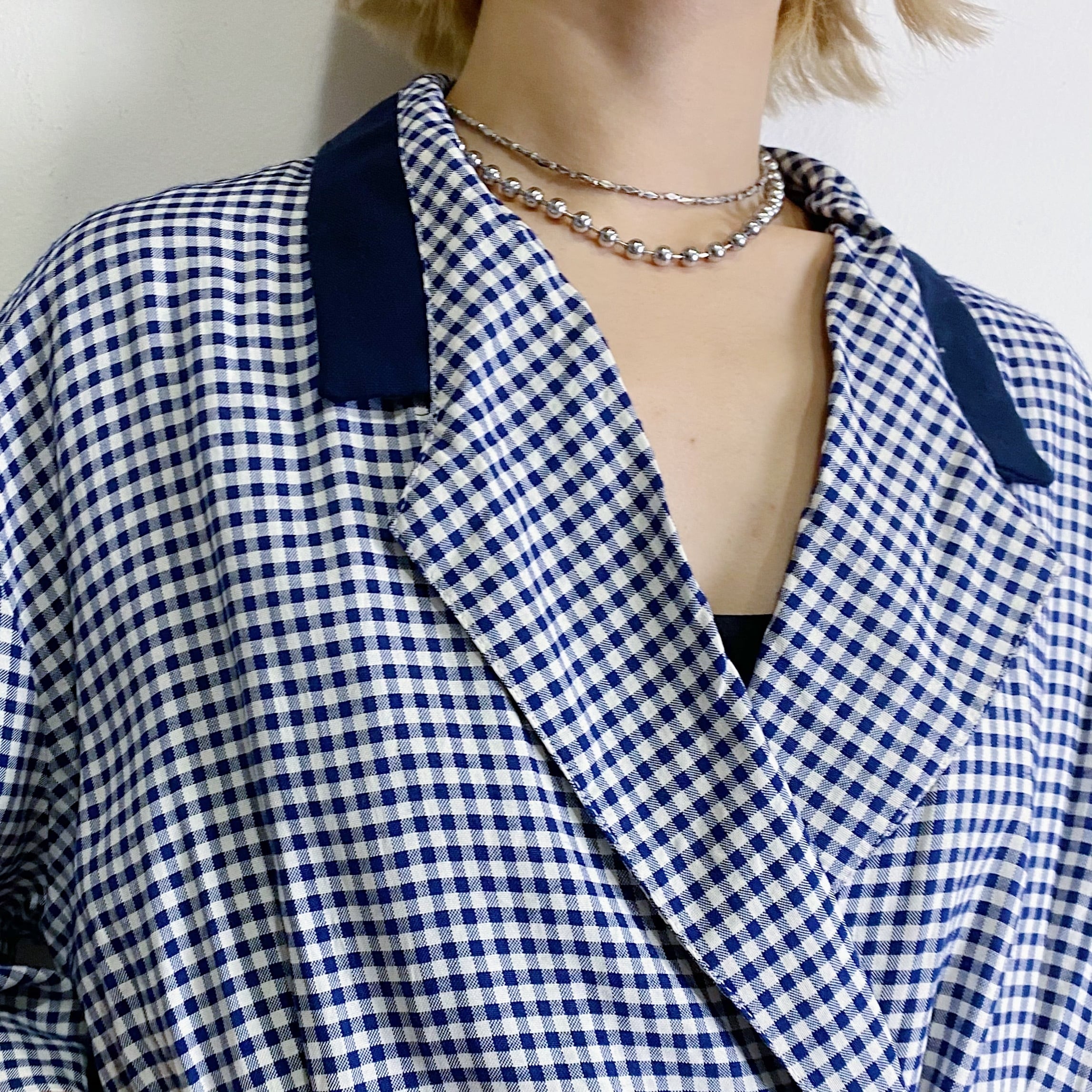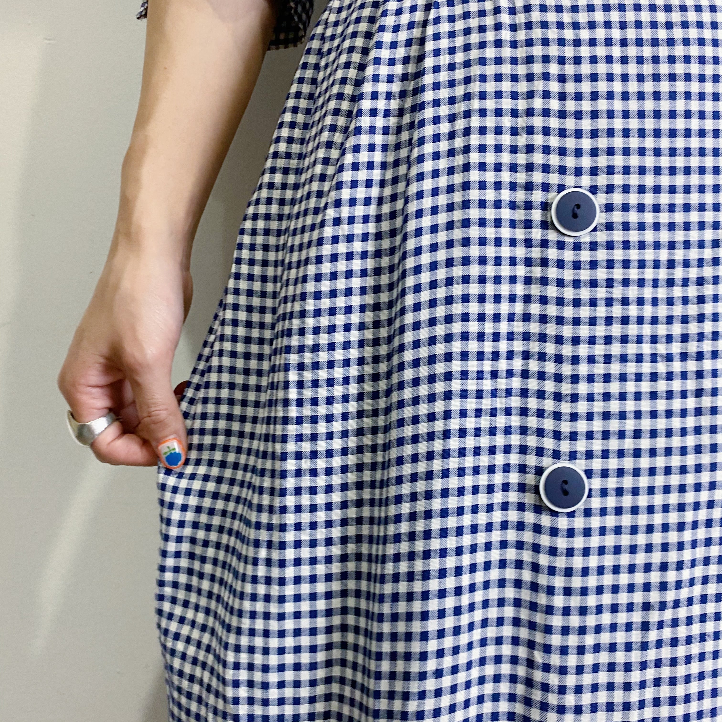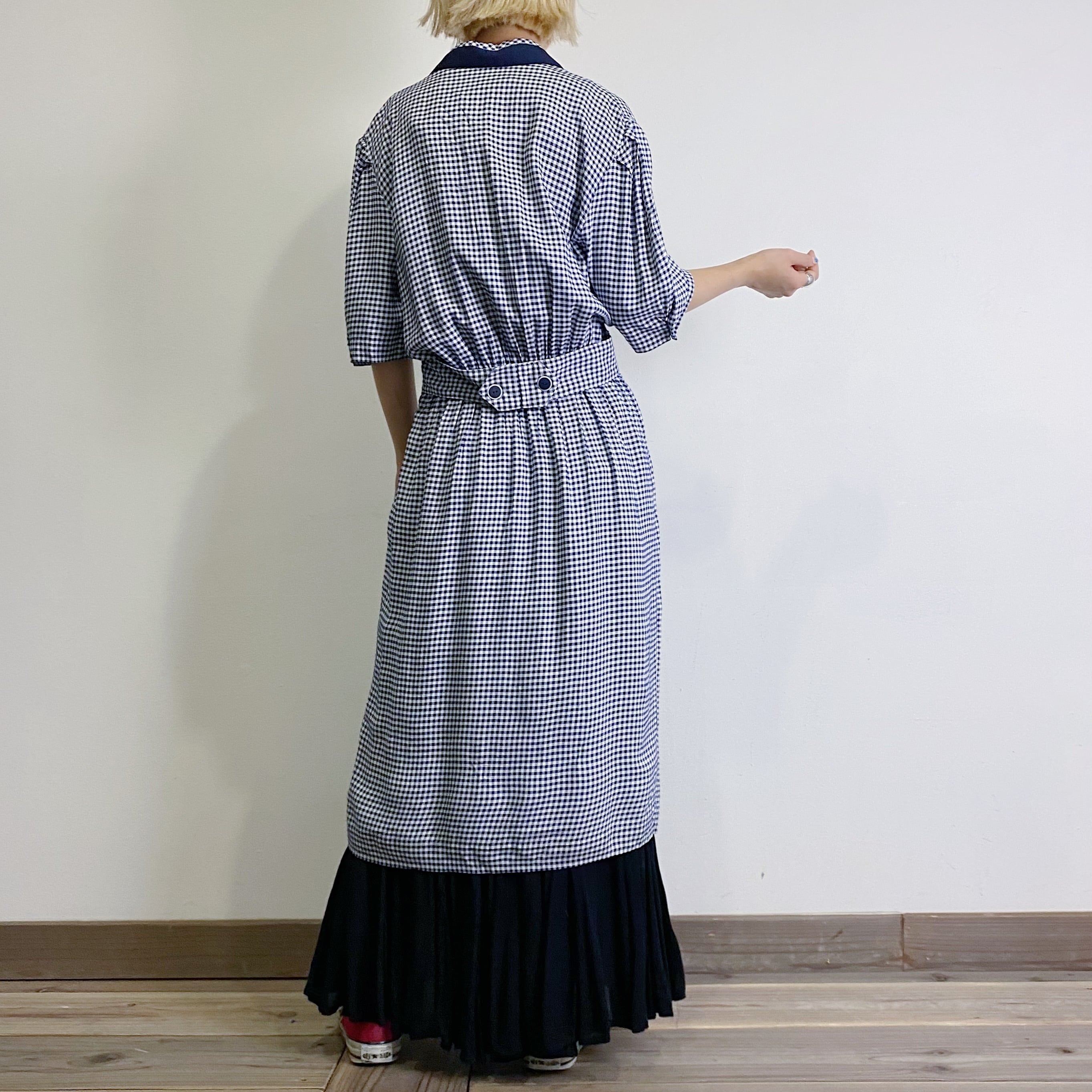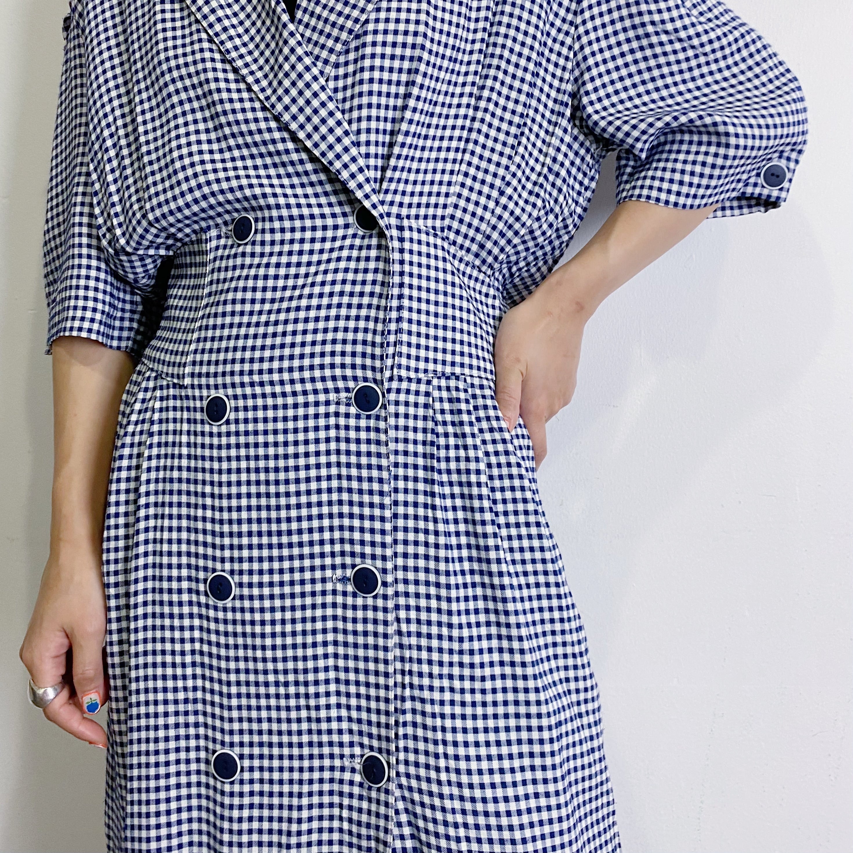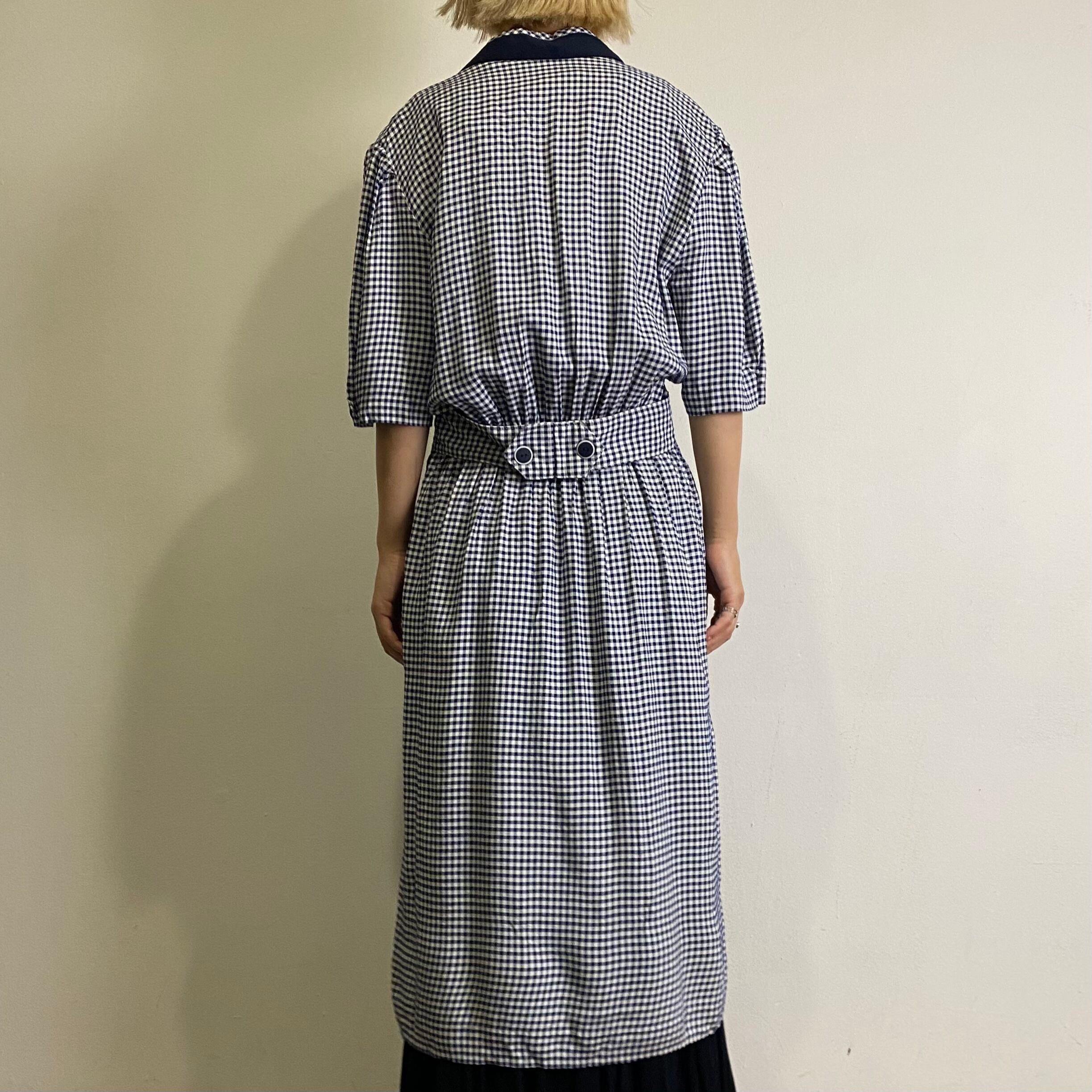 ネイビーカラーのギンガムチェックが可愛い、80年代のレーヨンワンピースです。