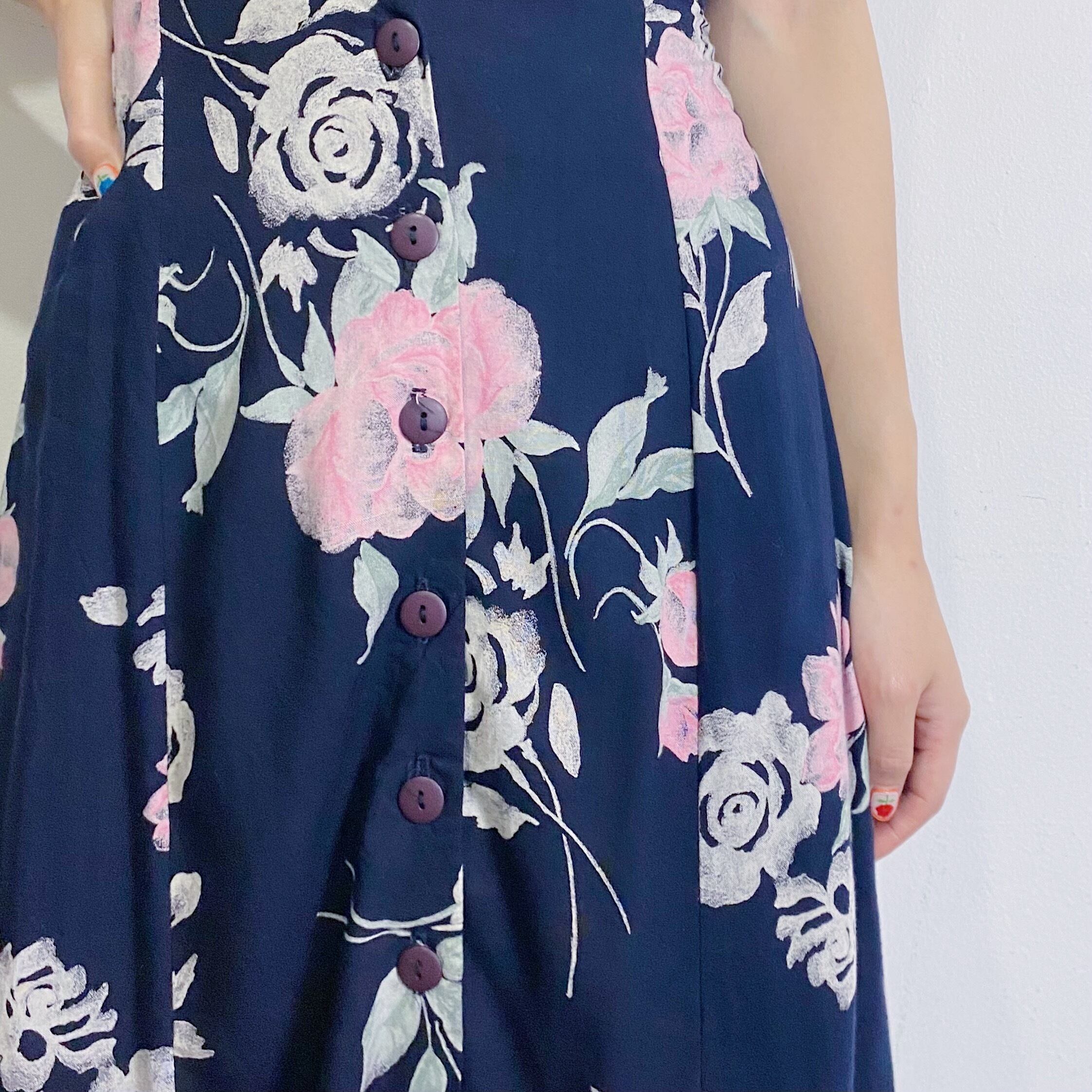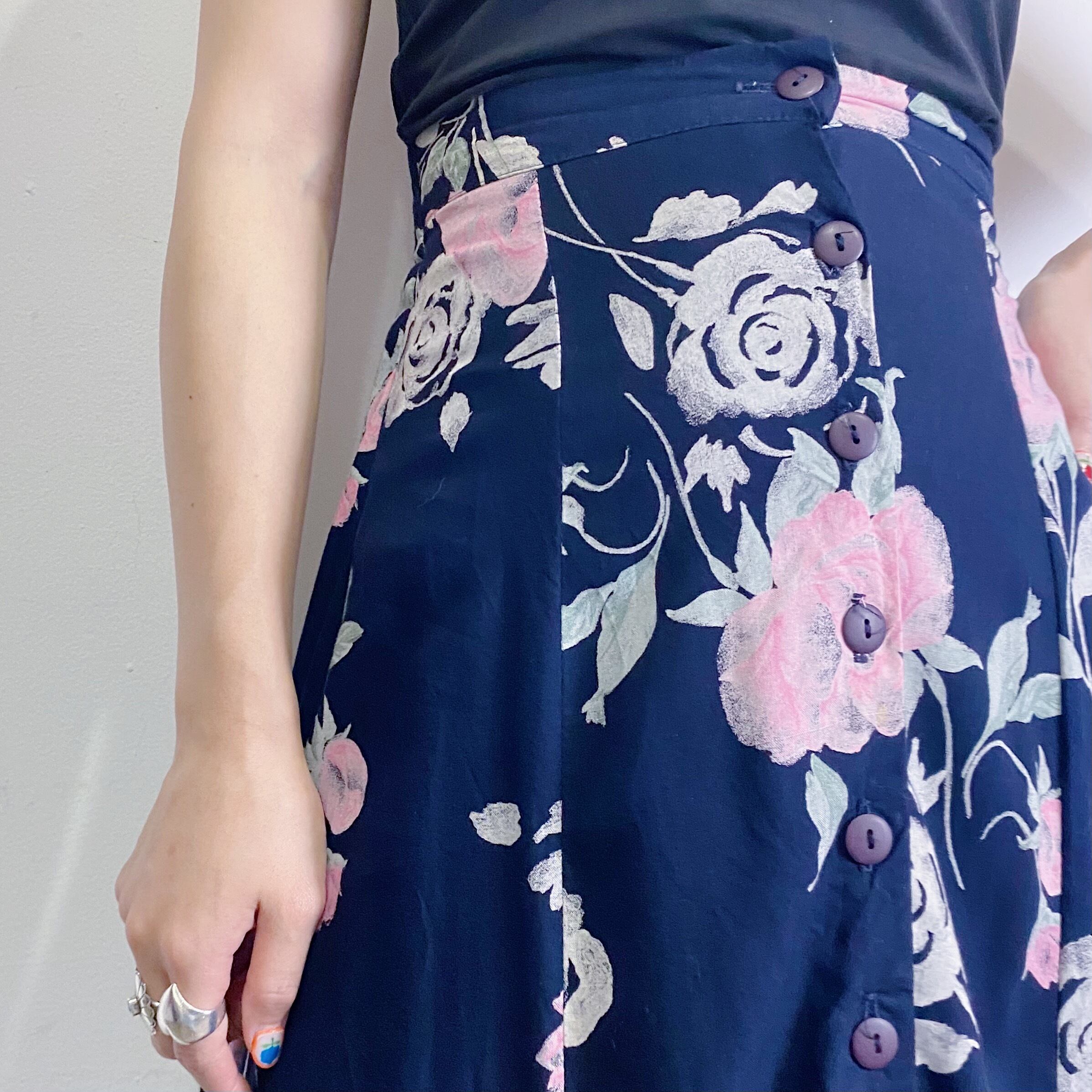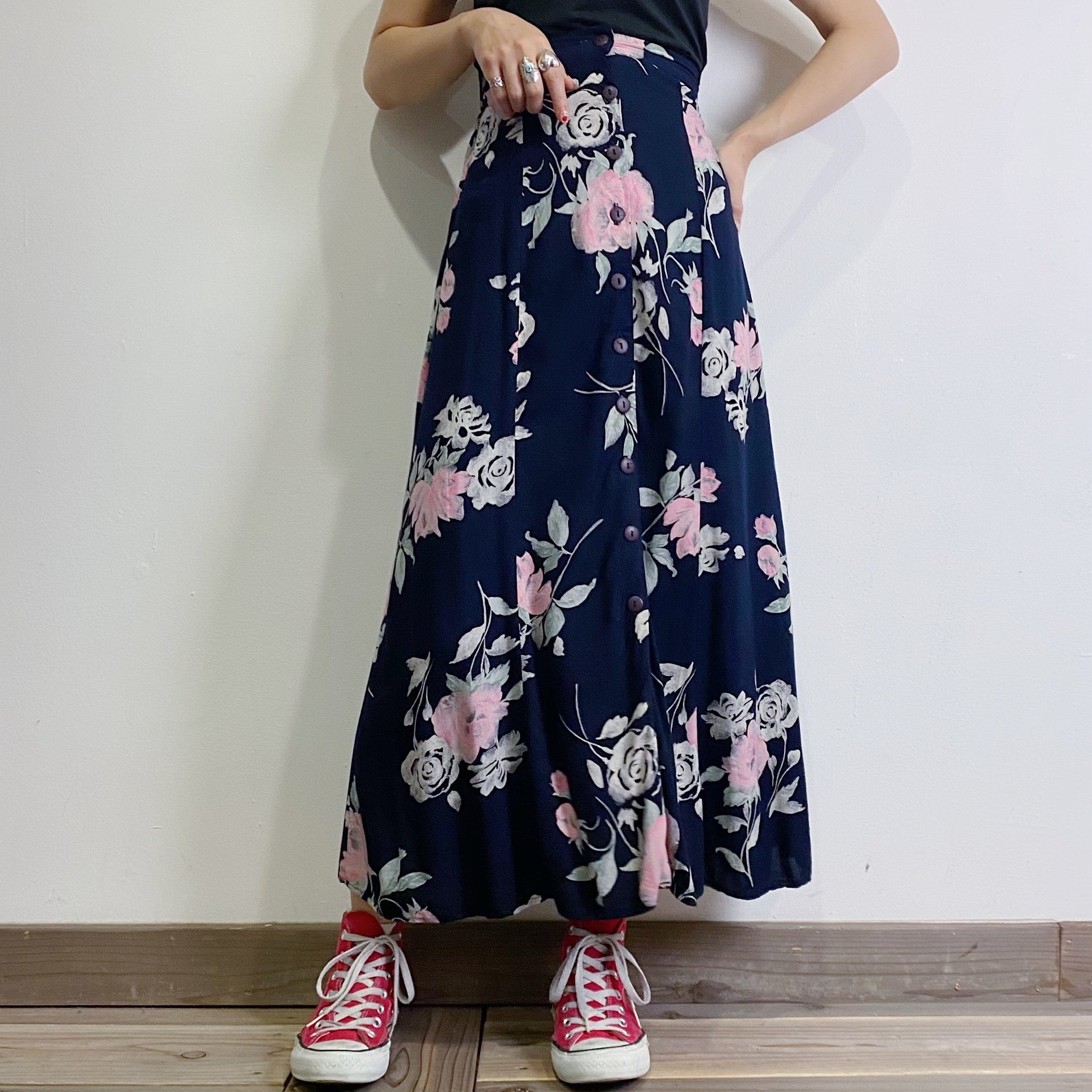 ネイビーカラーに絵画タッチの花柄が可愛い、ロングスカートです。