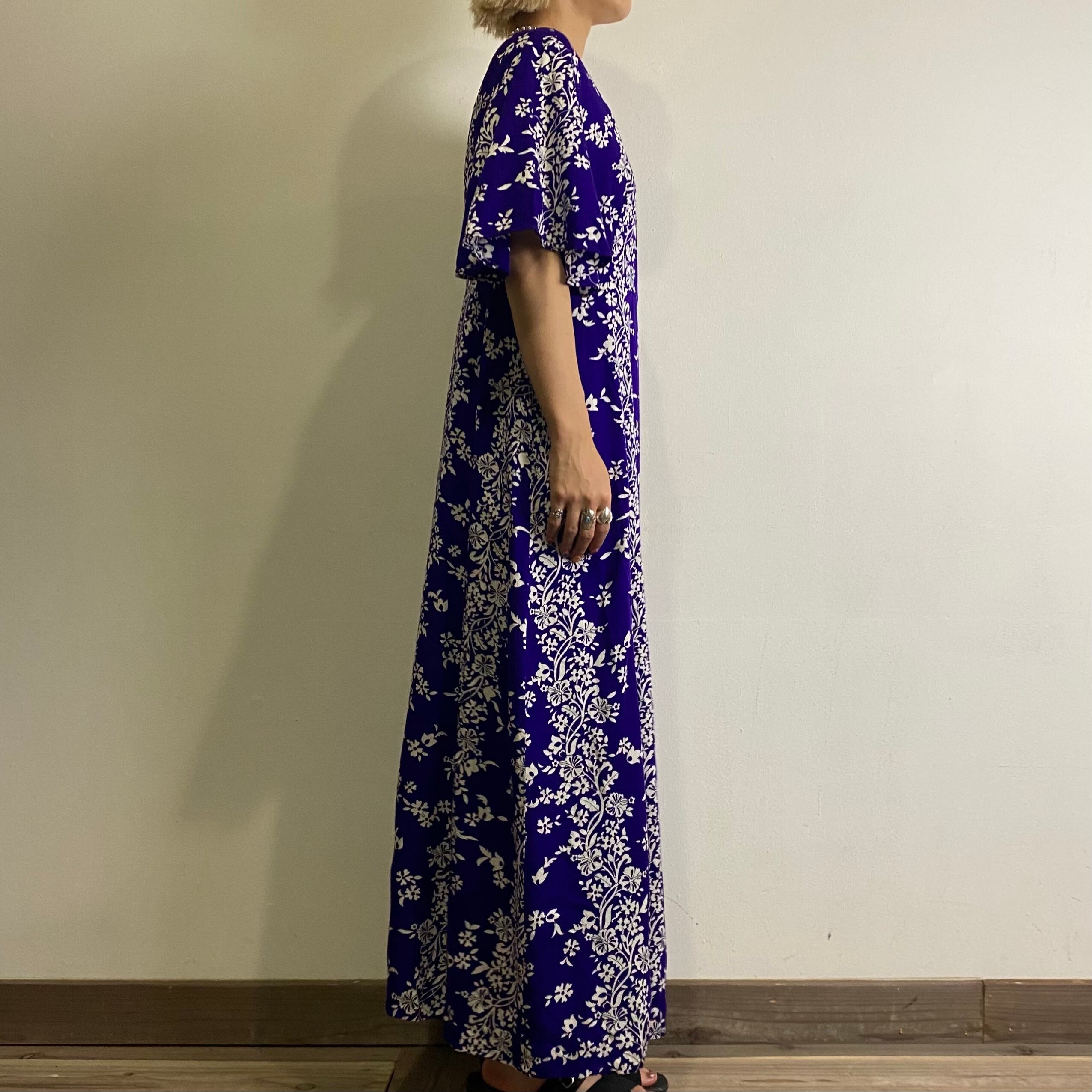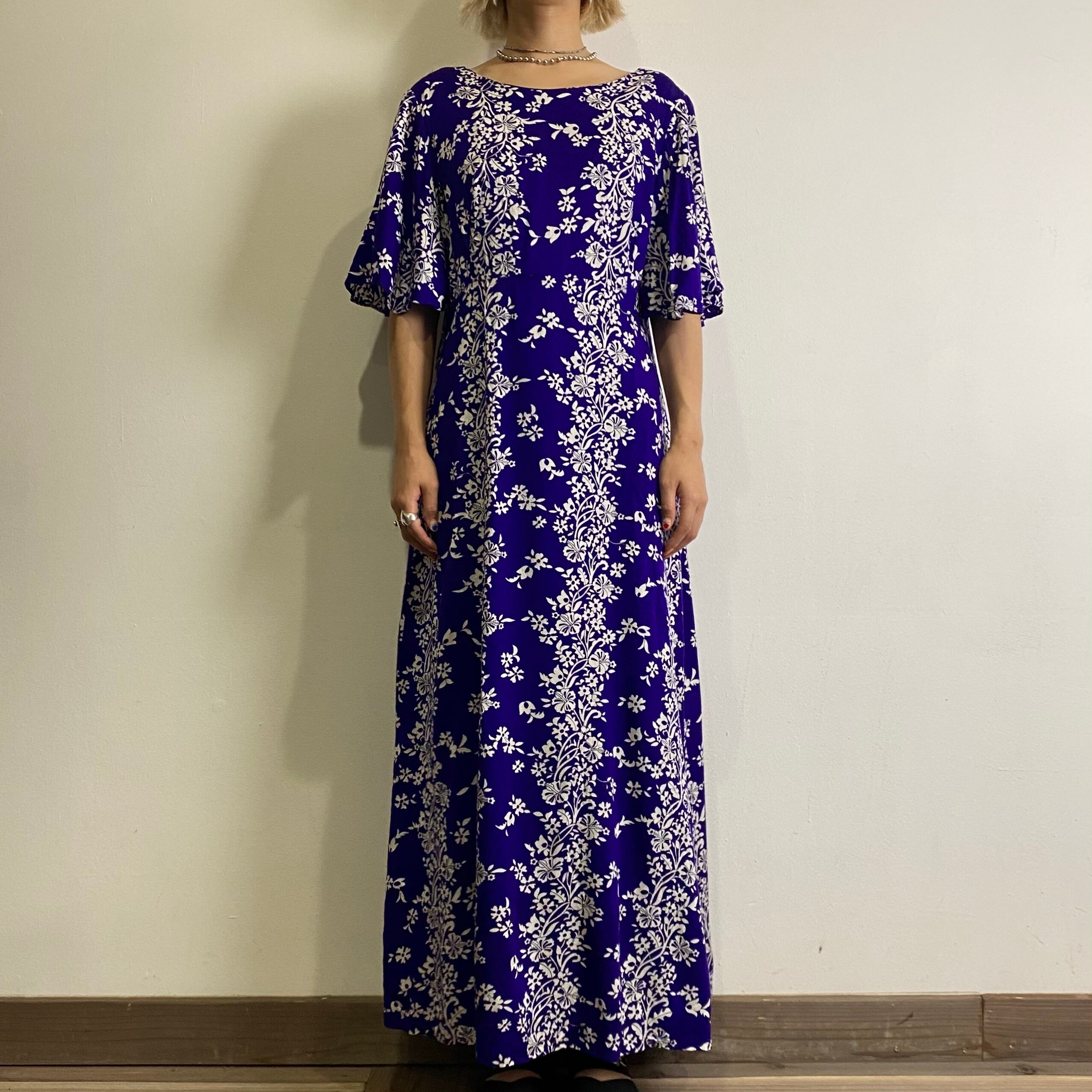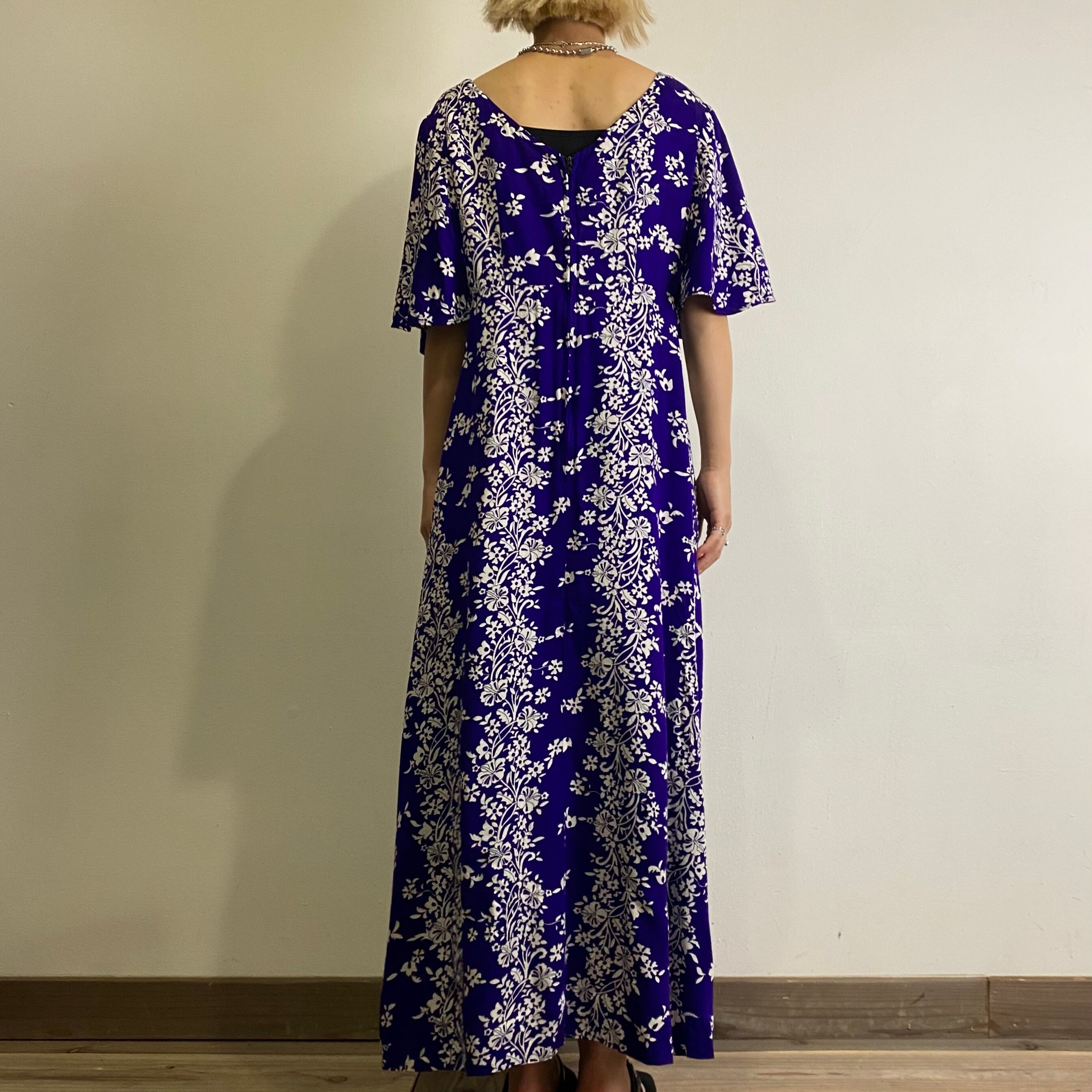 深い紫カラーに白いプリントが可愛い、ハワイアンワンピースです。