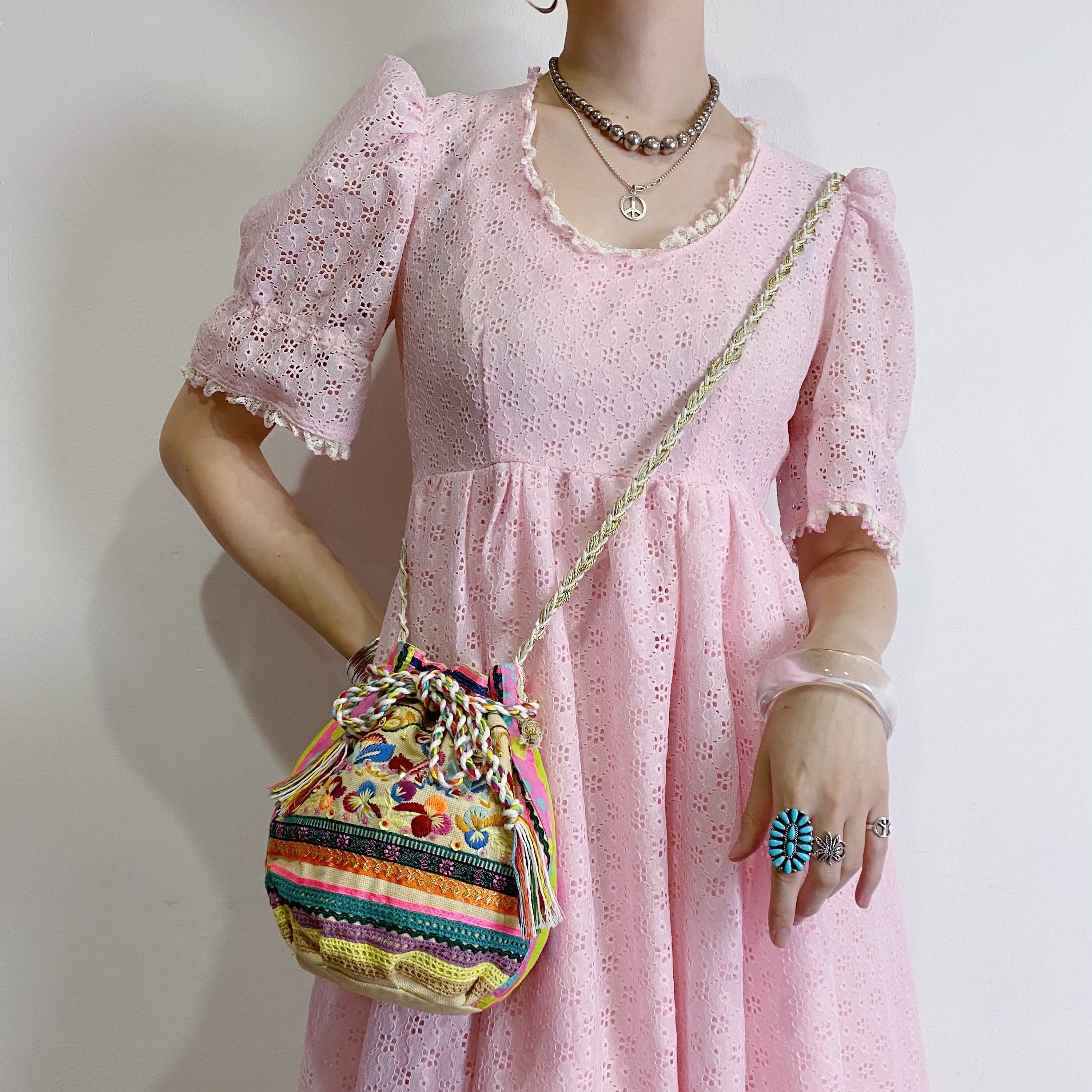 カラフルなテープや刺繍が可愛い巾着型のショルダーバッグです。
