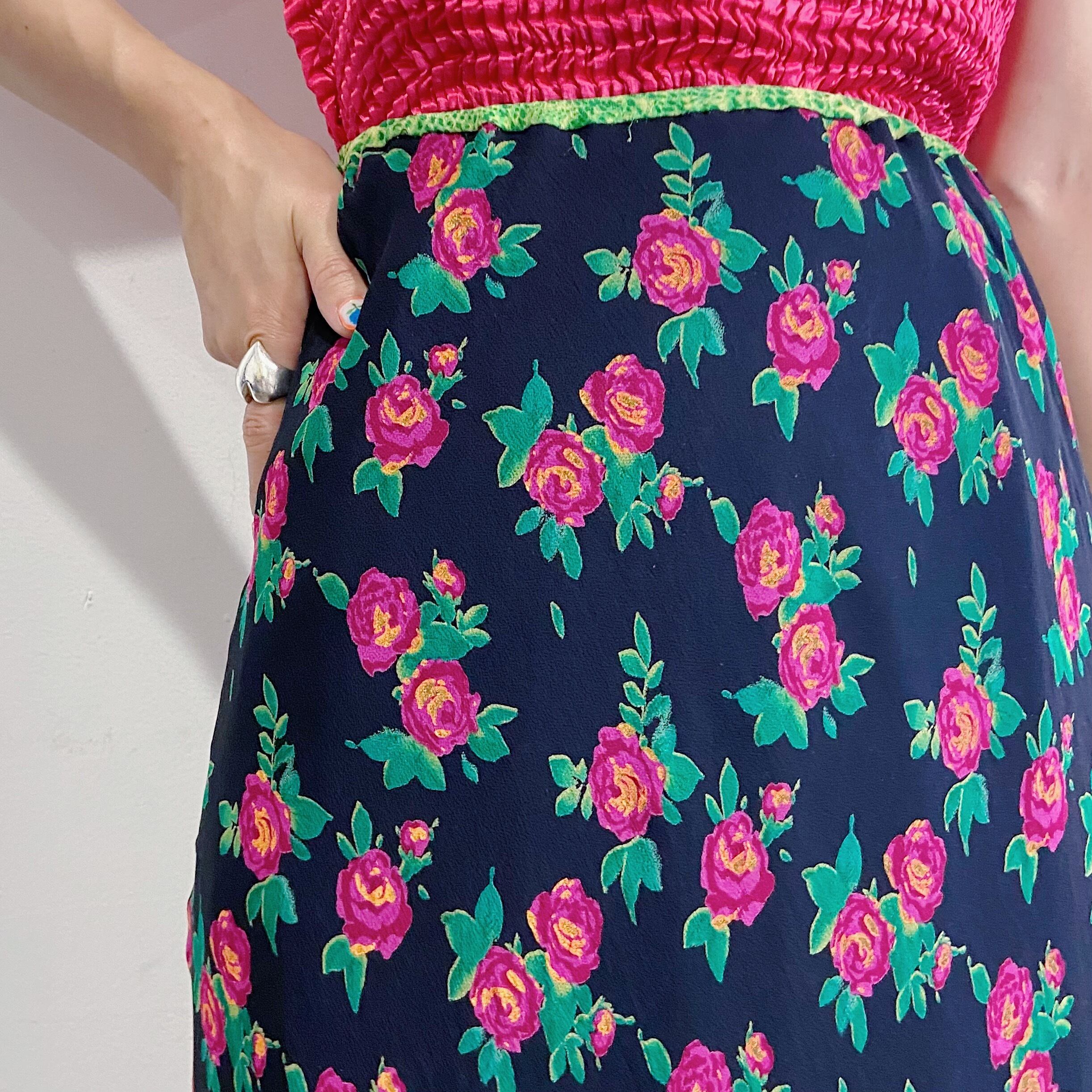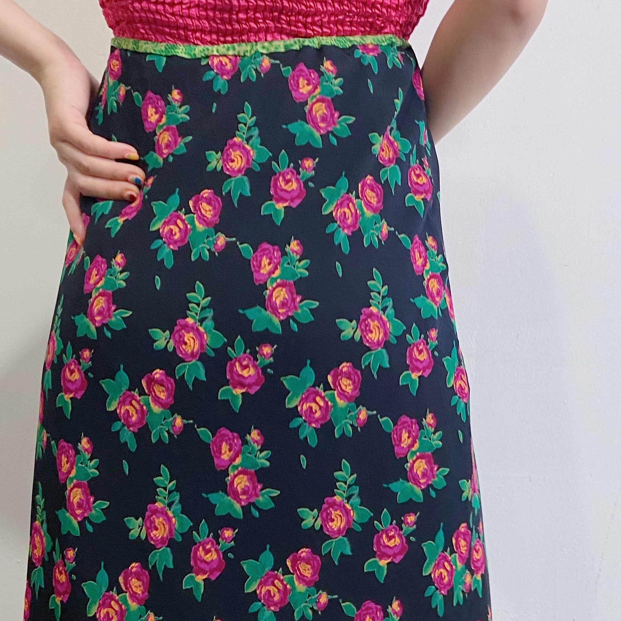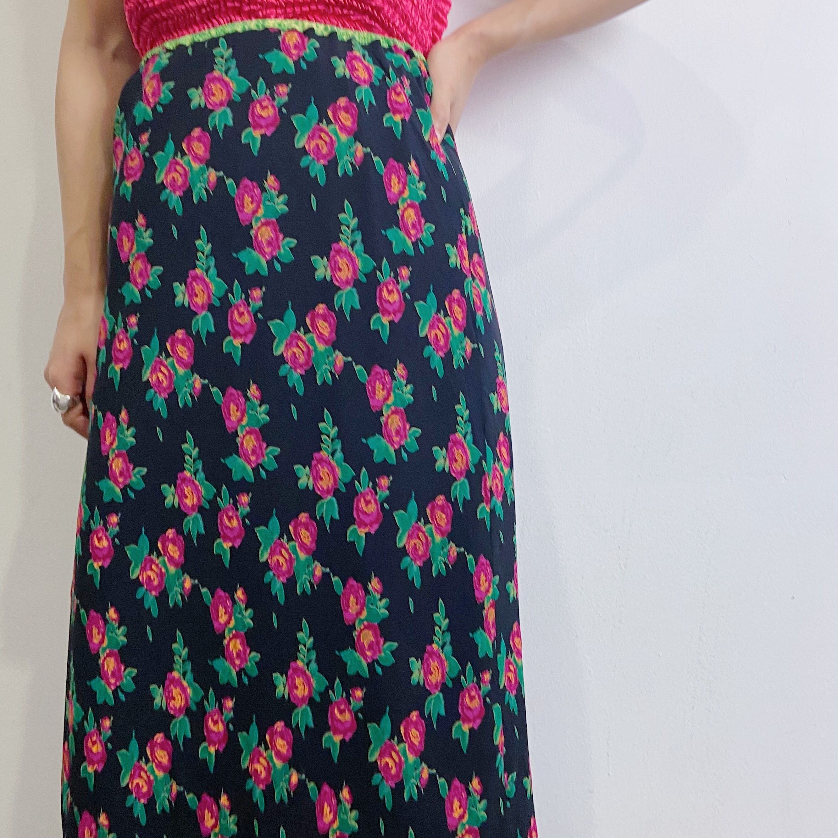 黒地にピンクとグリーンの花柄、また裾にパイソン柄のフリルが可愛いスカートです。