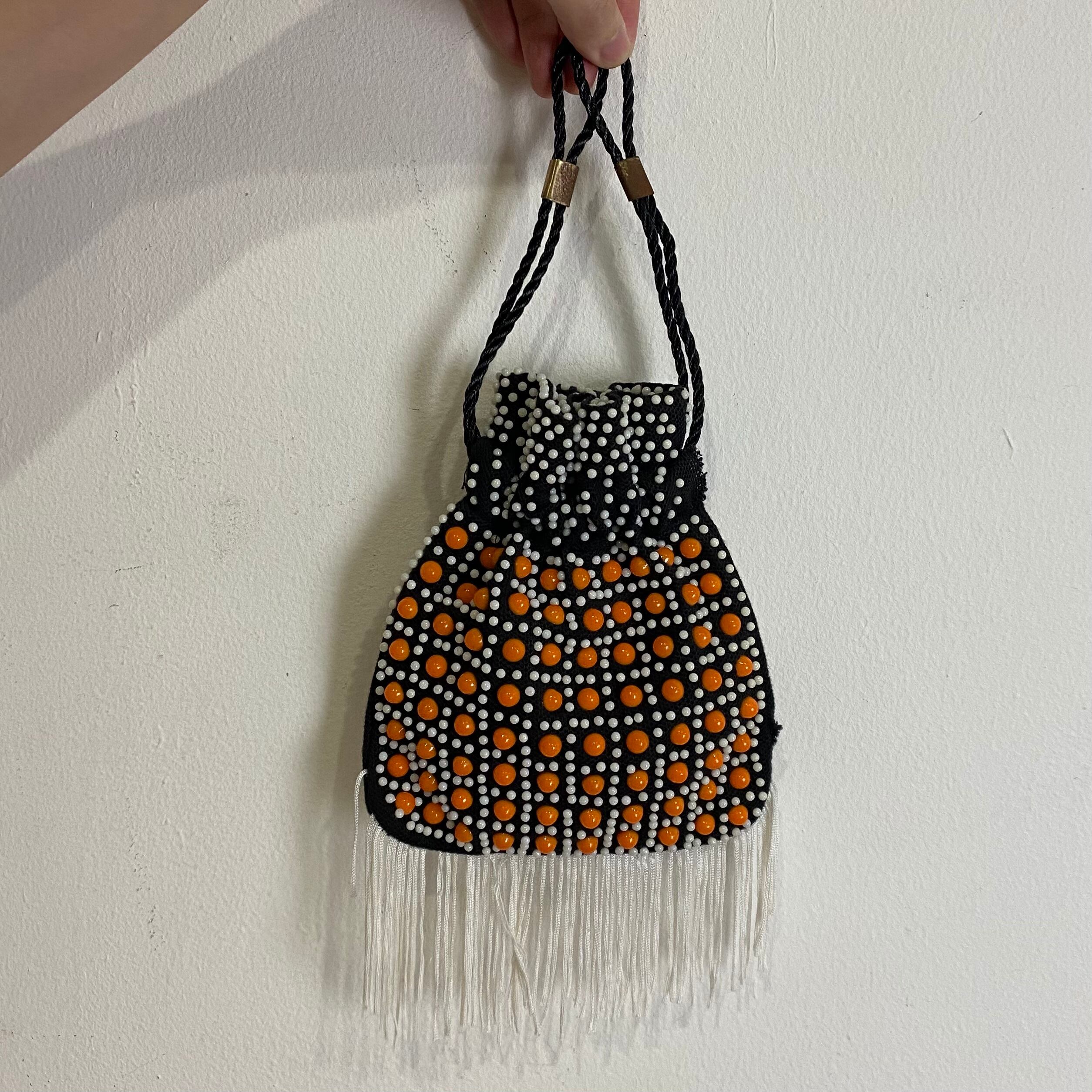巾着型にフリンジ、そしてお色味のオレンジとブラックの組み合わせが可愛い。