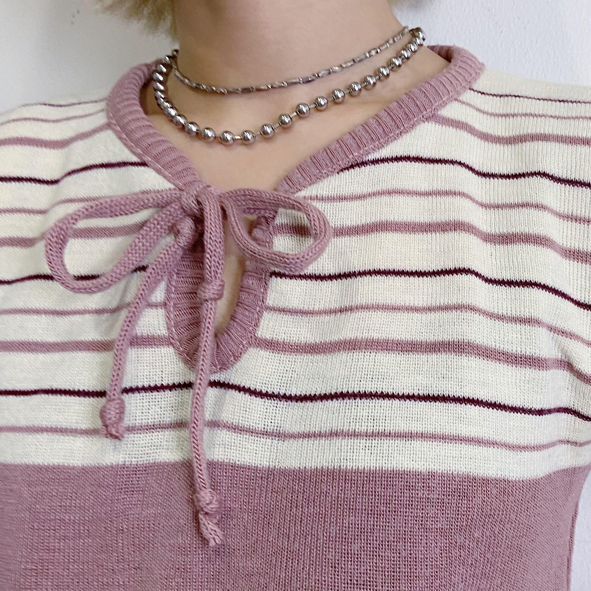 緩いボーダーの雰囲気や首のリボン、そしてお袖のデザインが可愛い一枚。