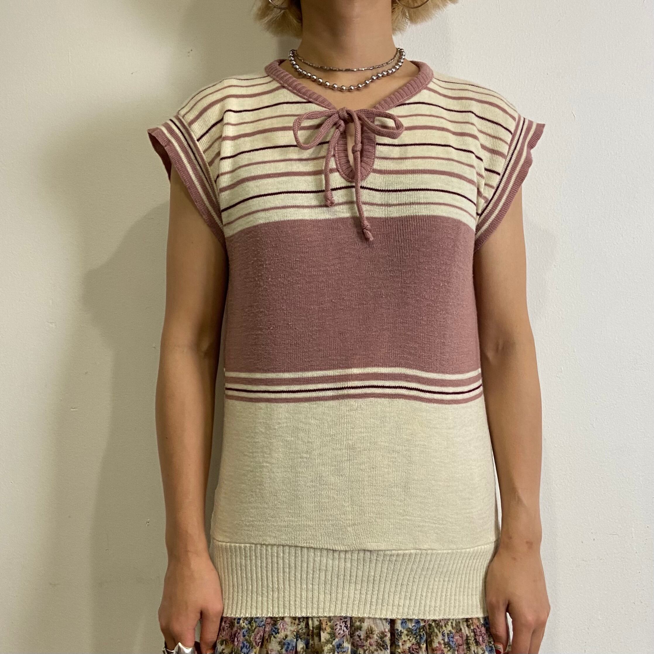 スモーキーピンクの色合いが可愛い、70年代のサマーニットトップスです。