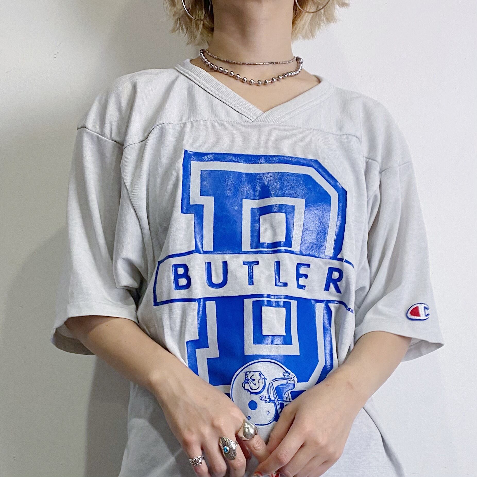 淡いグレーと水色の中間のような色合いが可愛い、トリコタグのChampionフットボールTシャツです。