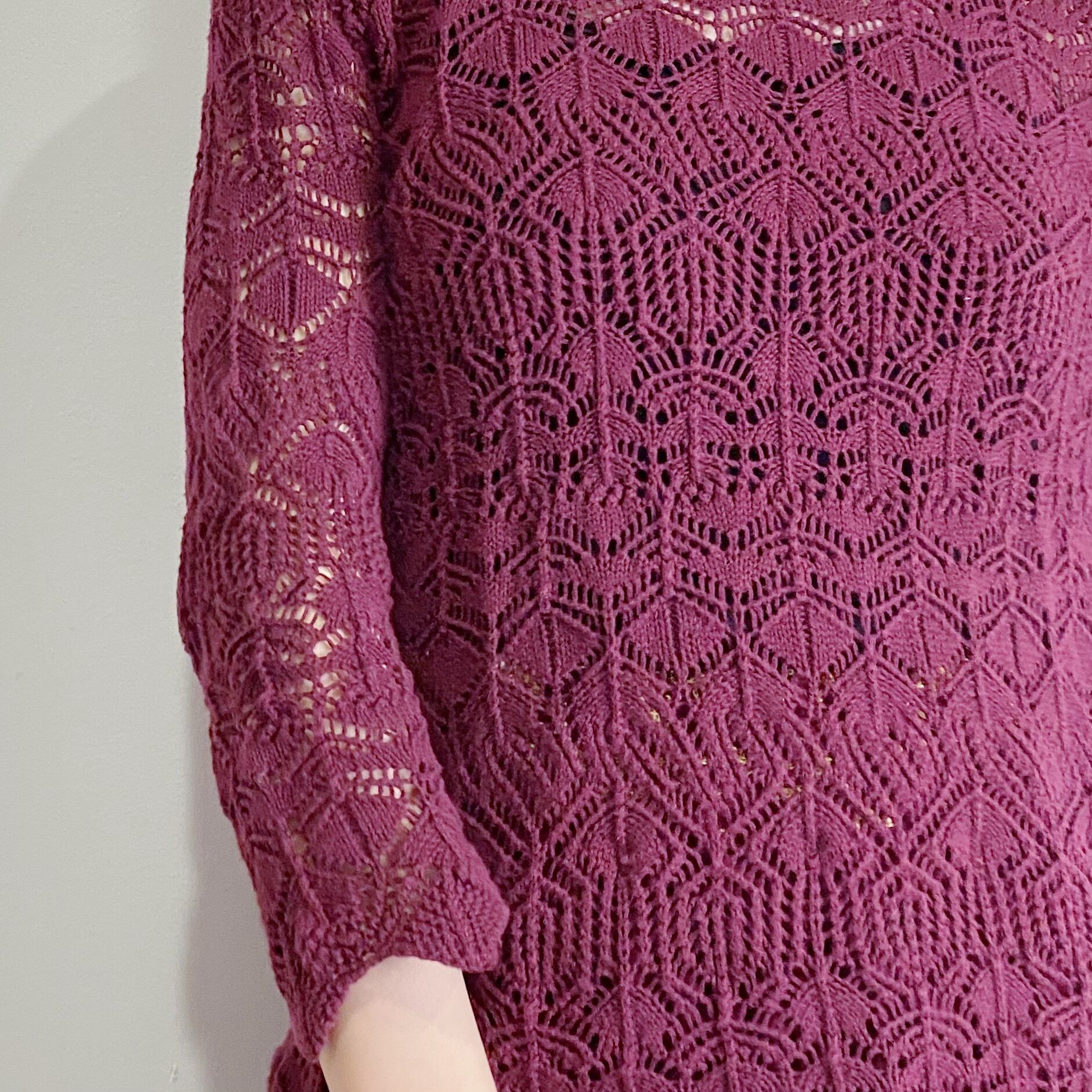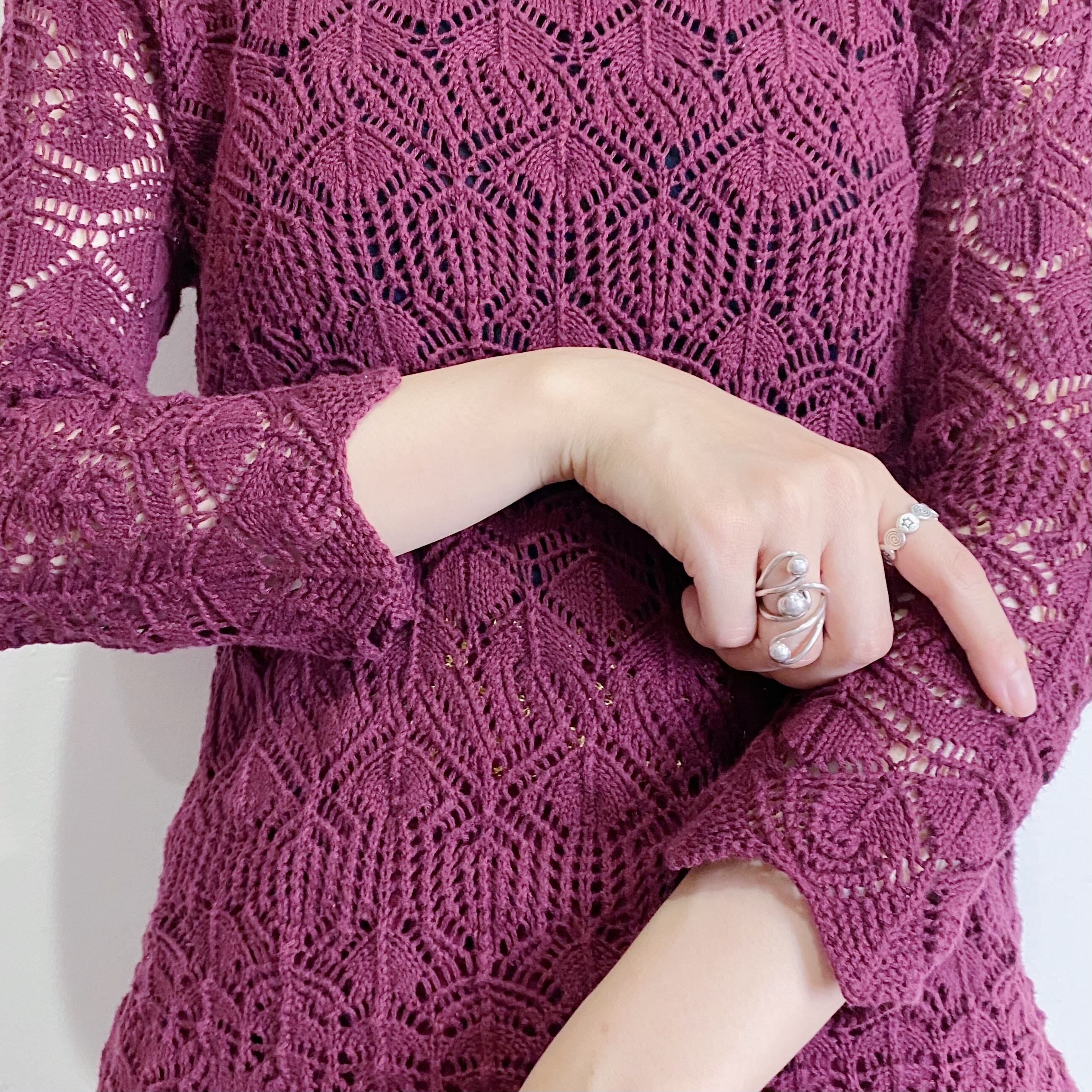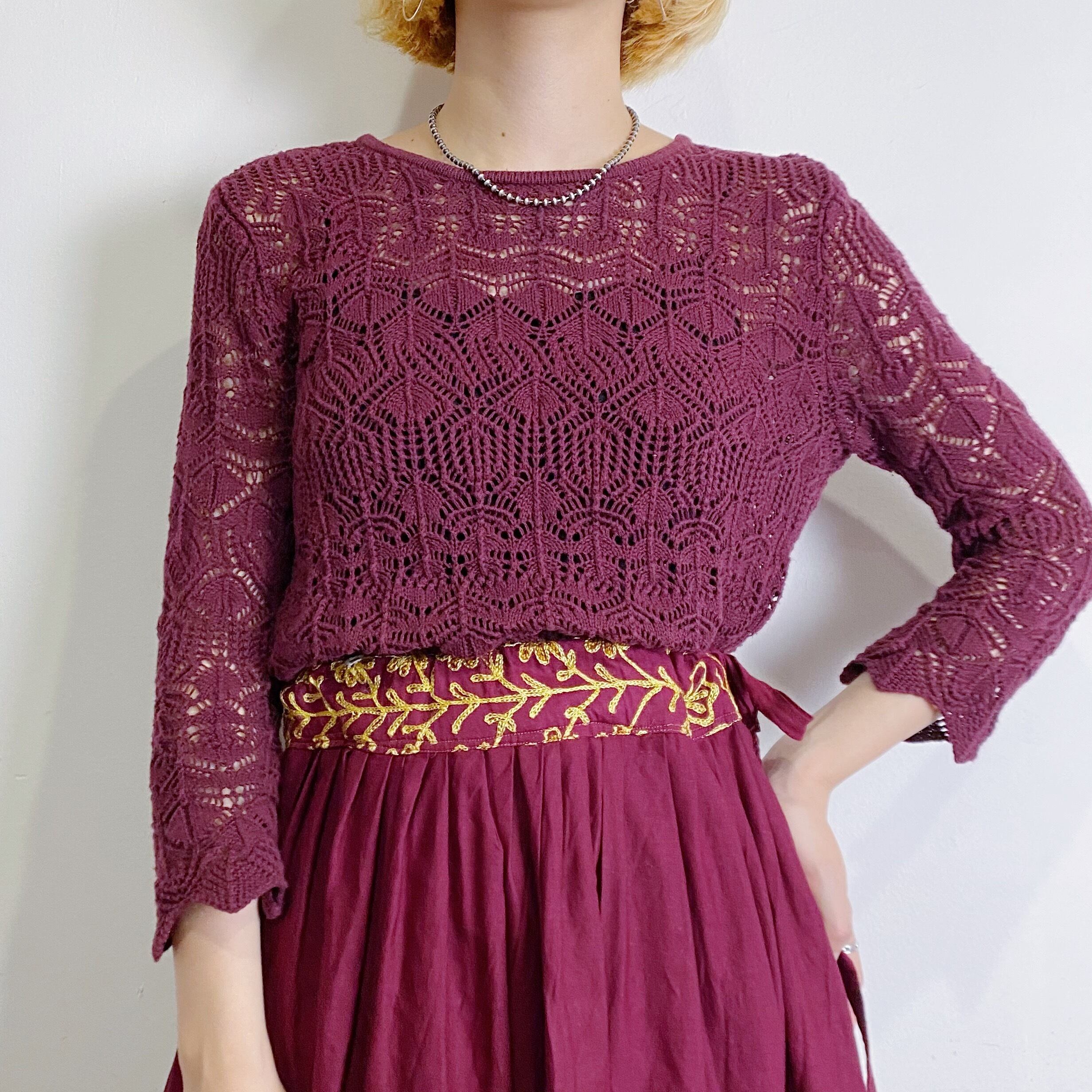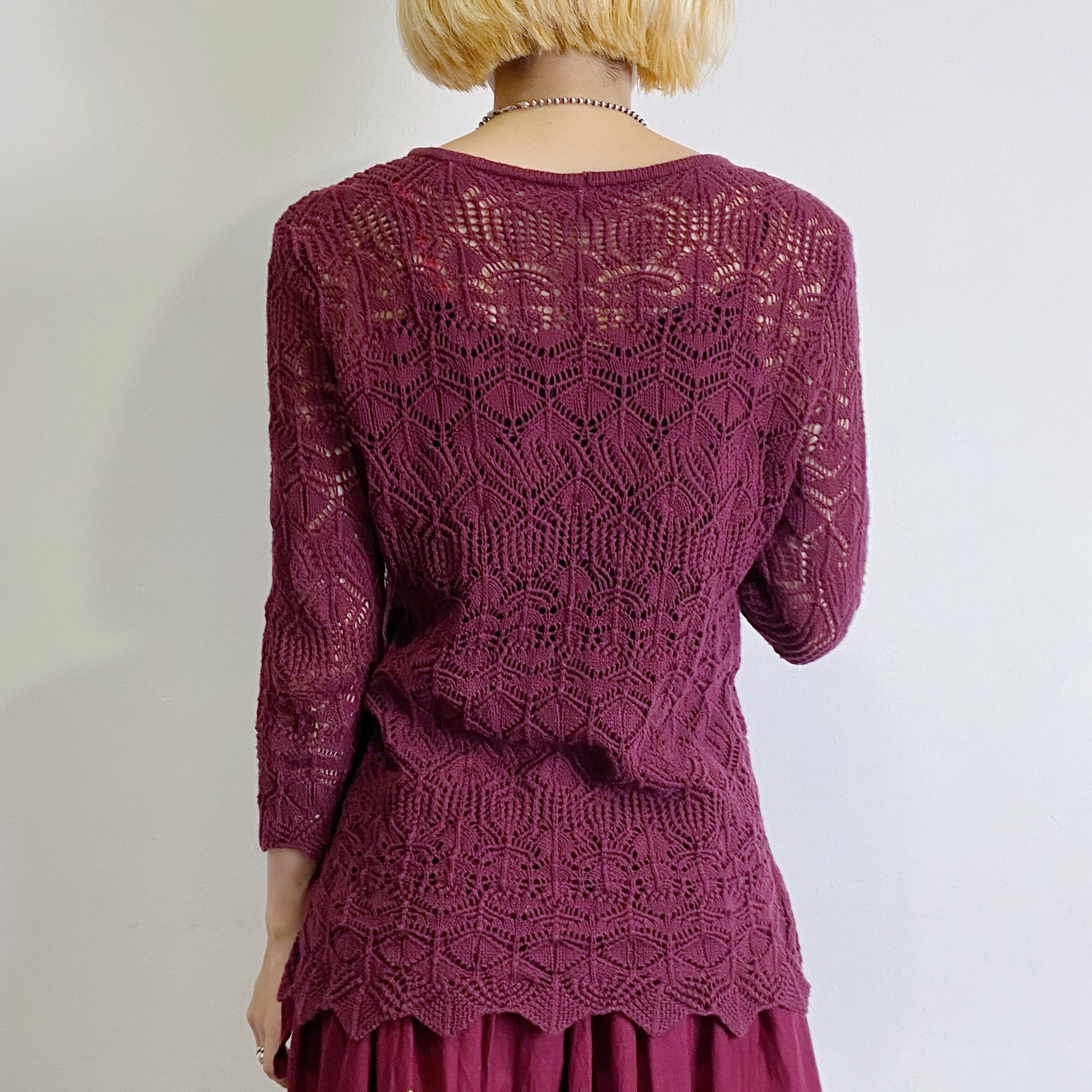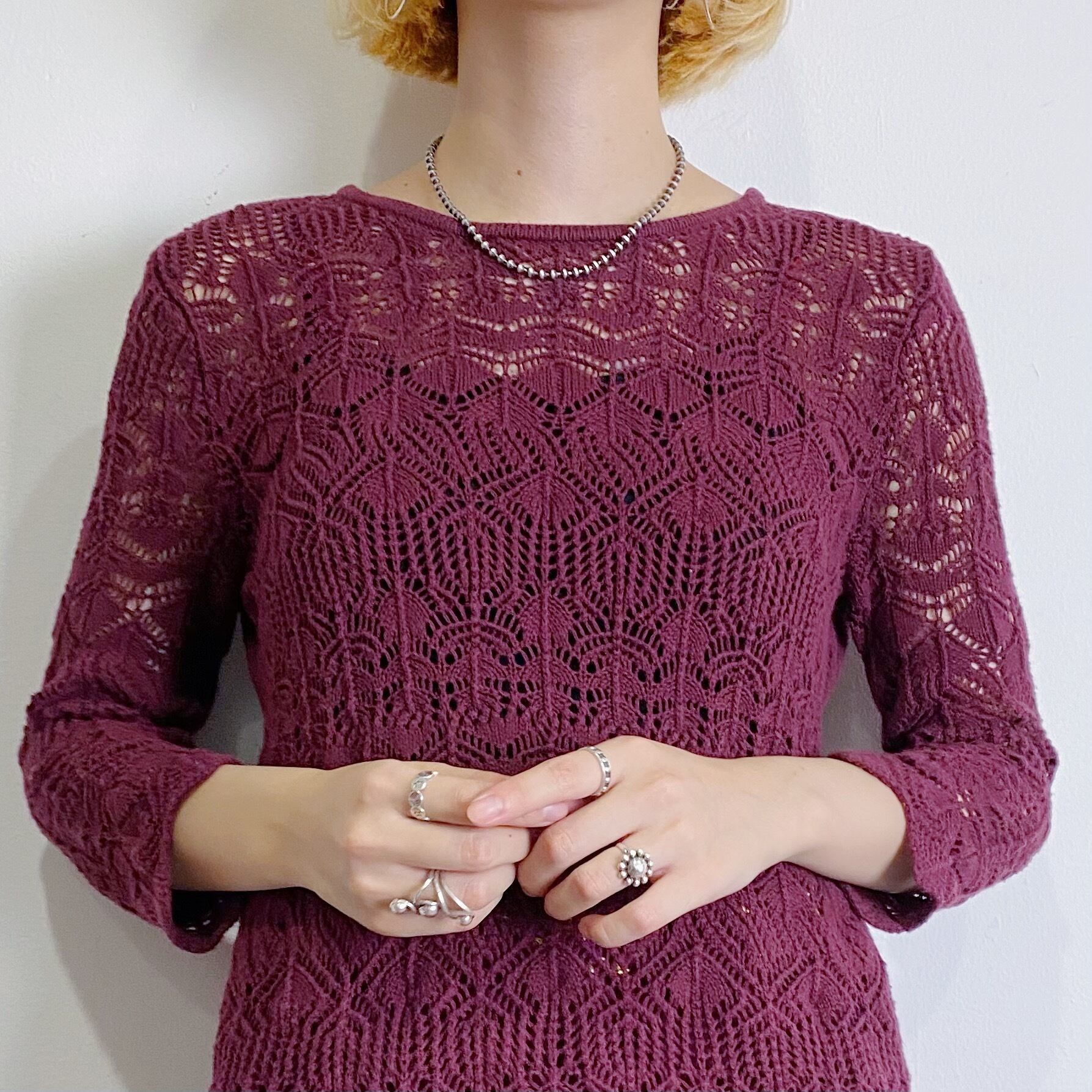ボルドーカラーが落ち着いた印象の、長袖クロシェトップスです。