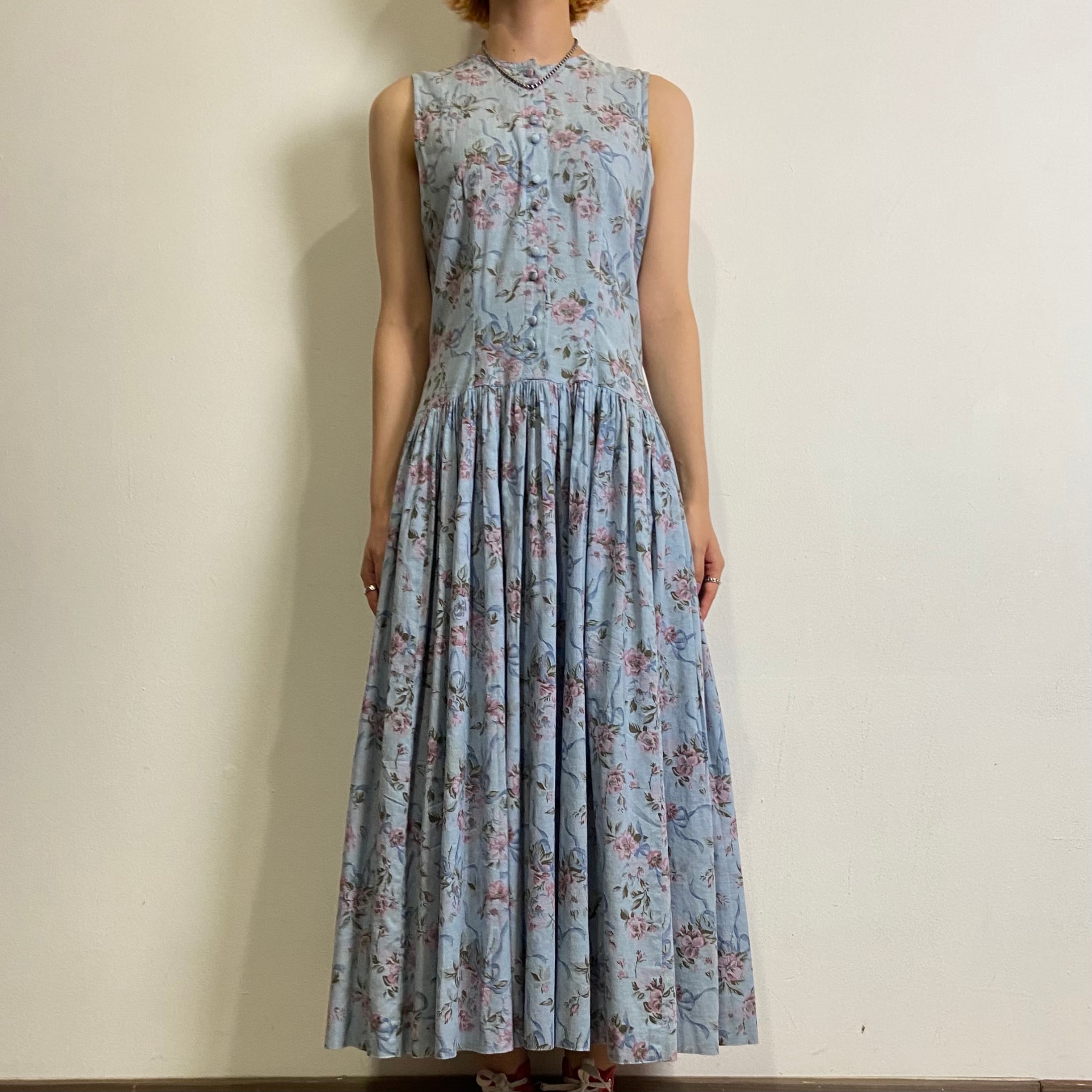 水色にピンクの花柄が可愛い、ノースリーブワンピースです。