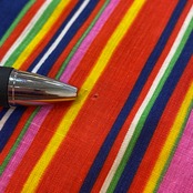 縁についたポンポンと、ポップな色合いのストライプが可愛い。
